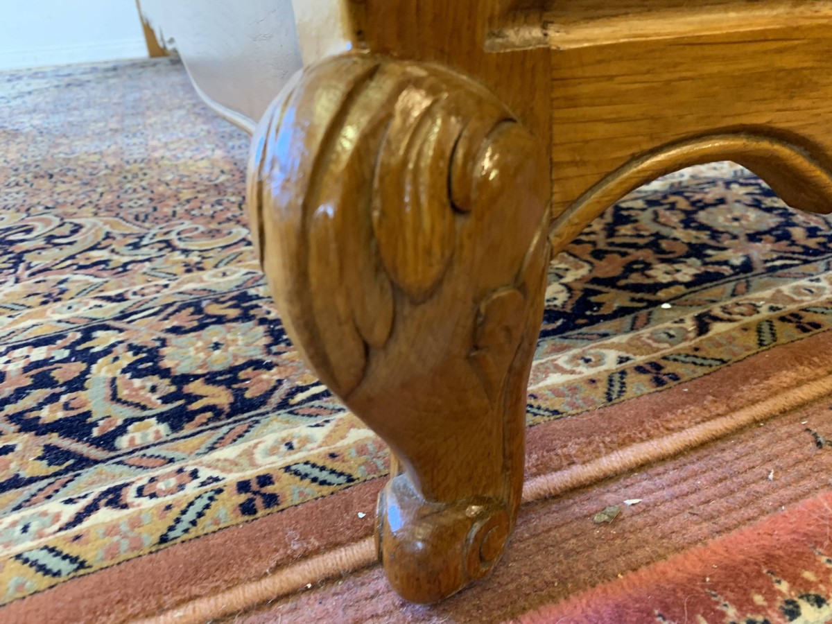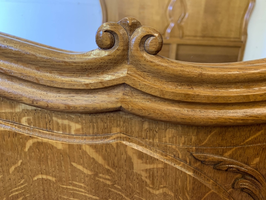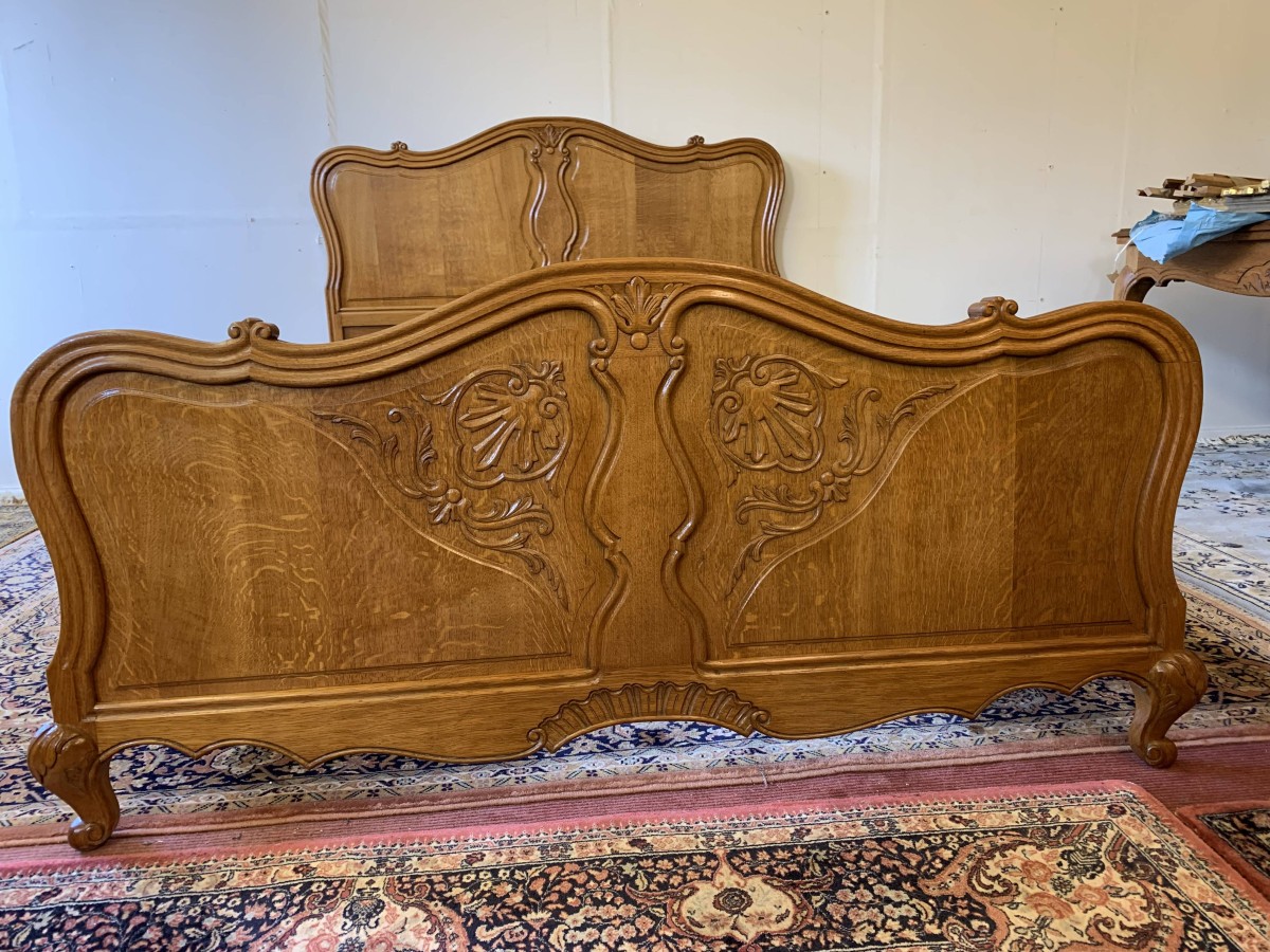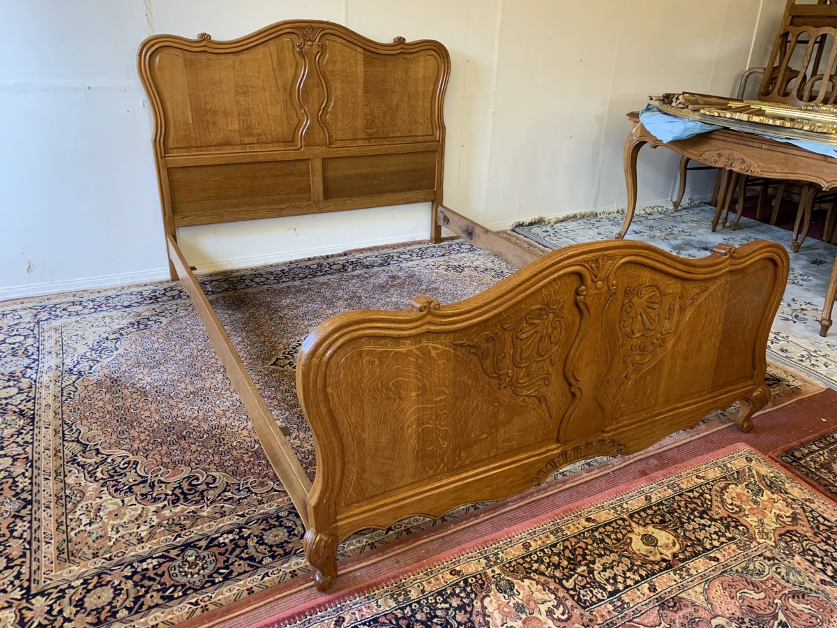 The shaped headboard has carvings and two shaped recessed panels. The footboard is also shaped with two shaped recessed carved panels with carvings below and the bed stands on two carved cabriole legs. The bed has two shaped side rails. The bed takes a standard double mattress.
