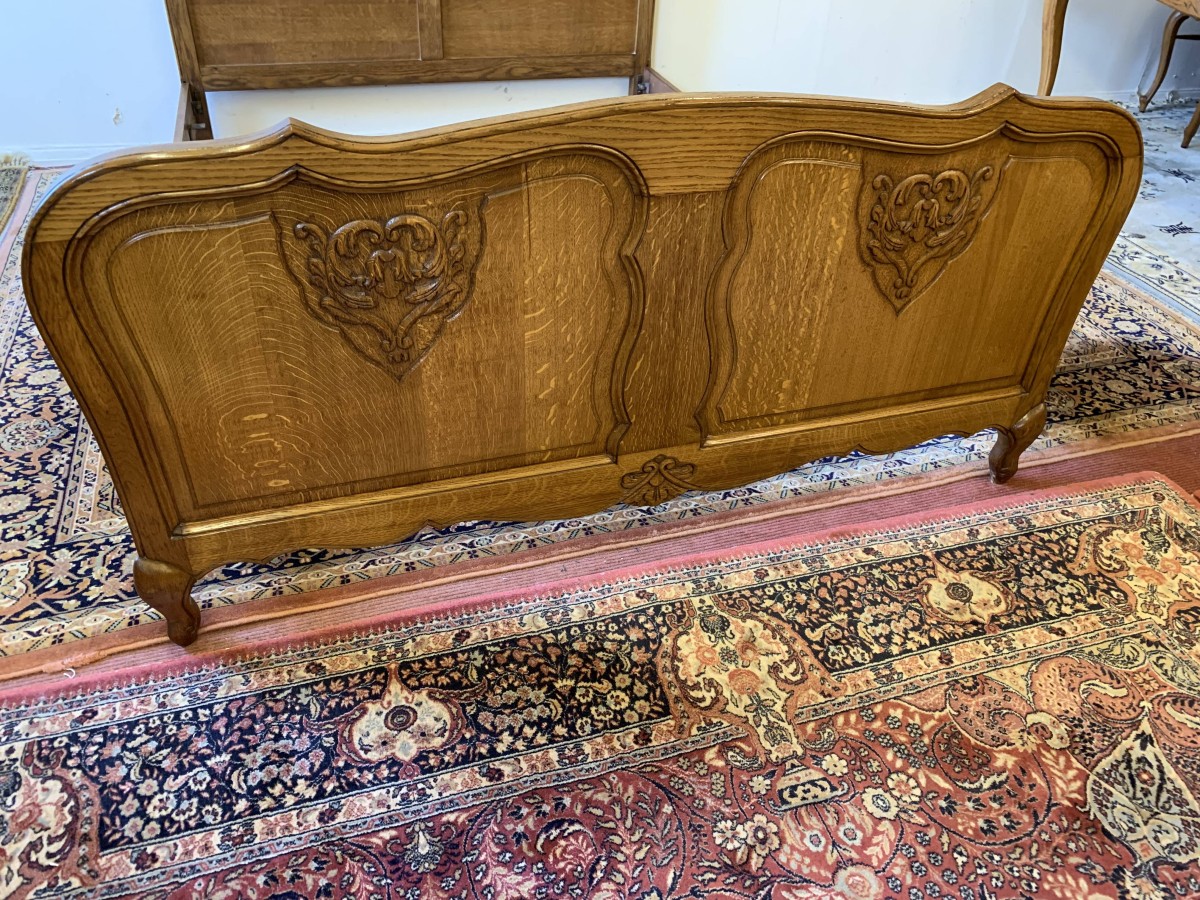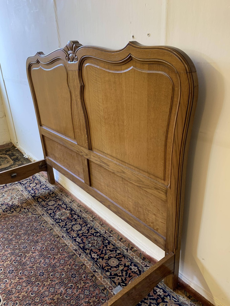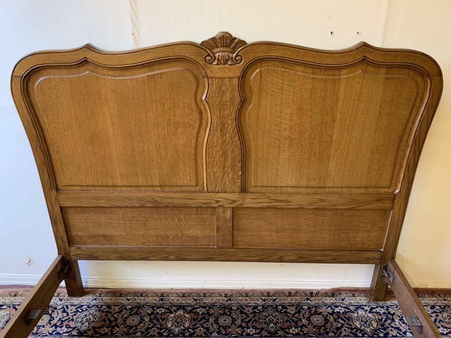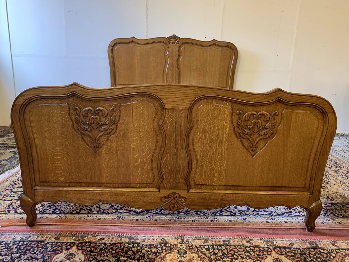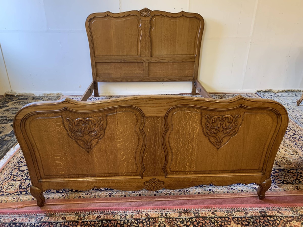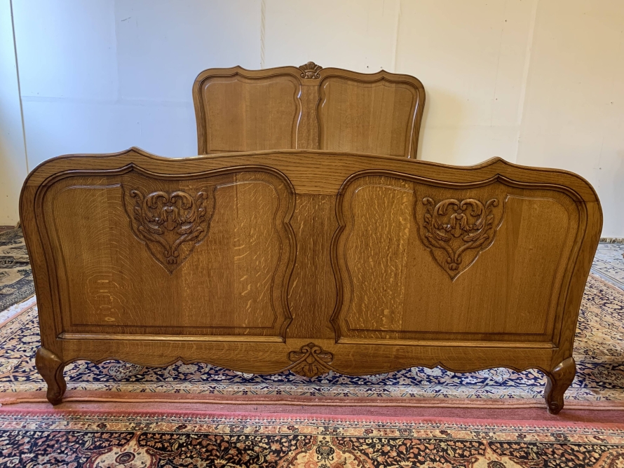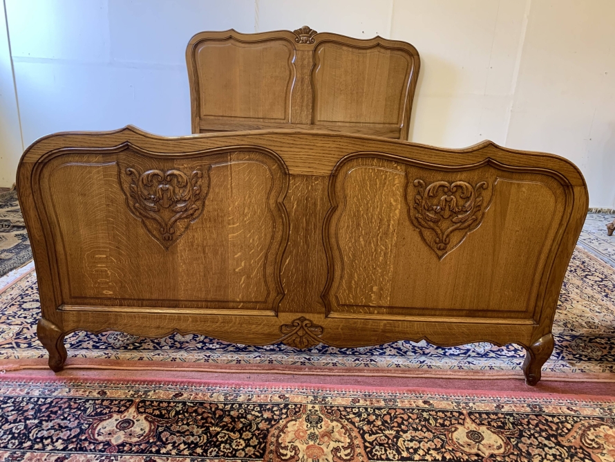The headboard has a shaped top rising to a decorative central carving, below are two shaped recessed panels. The footboard is also shaped and has two carved recessed panels with a central carving. The bed is connected by shaped side rails and the footboard stands on shaped cabriole legs. The bed takes a standard double mattress.