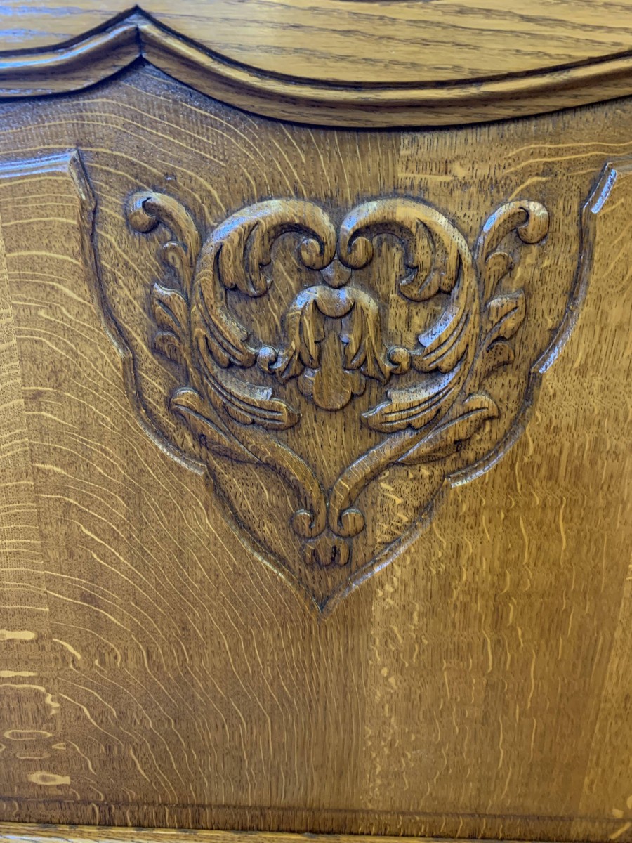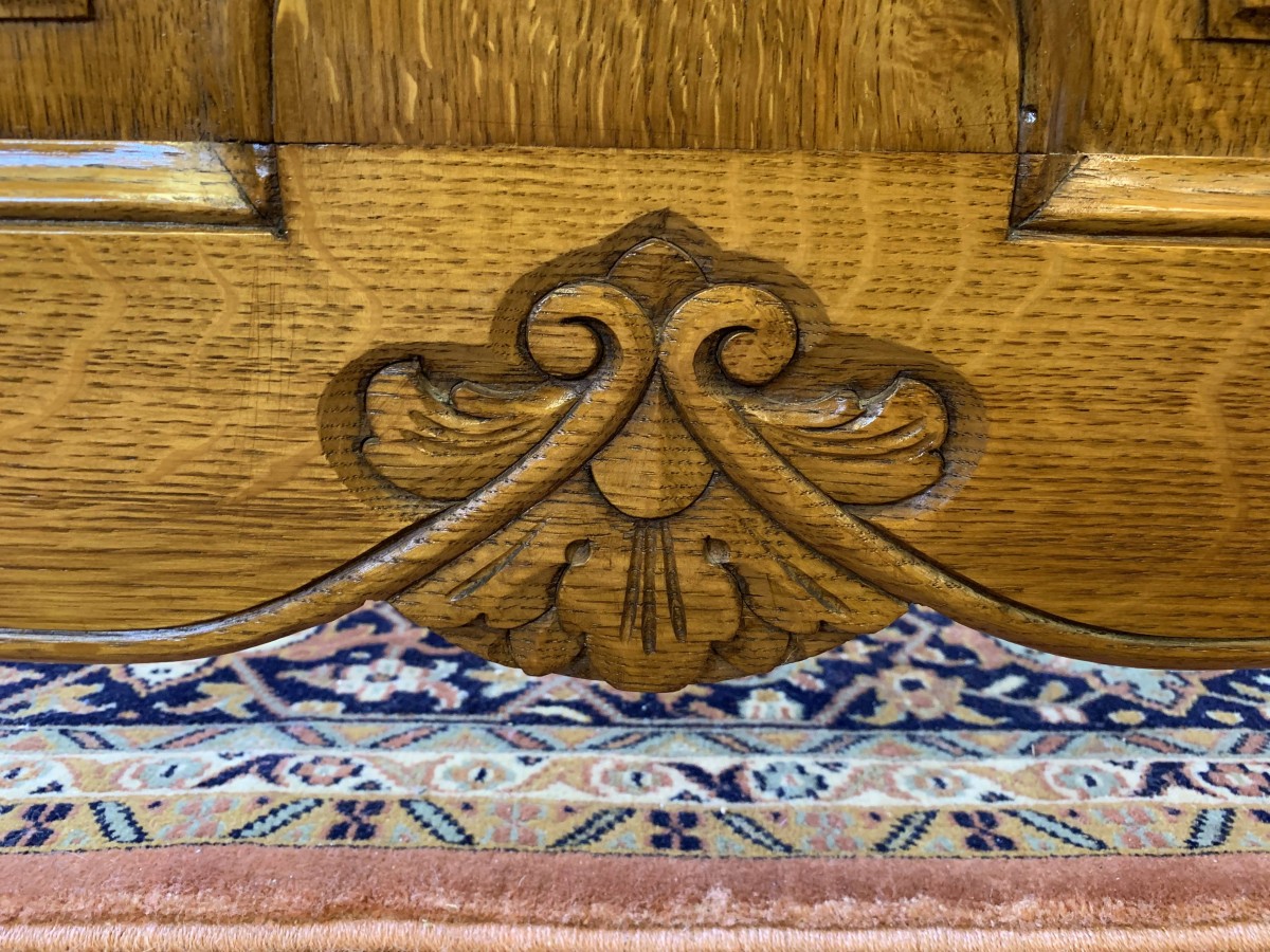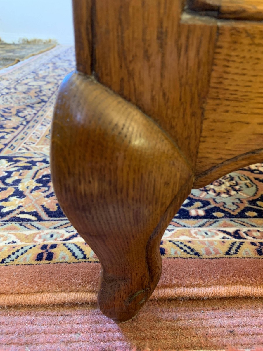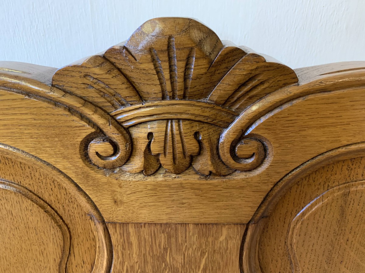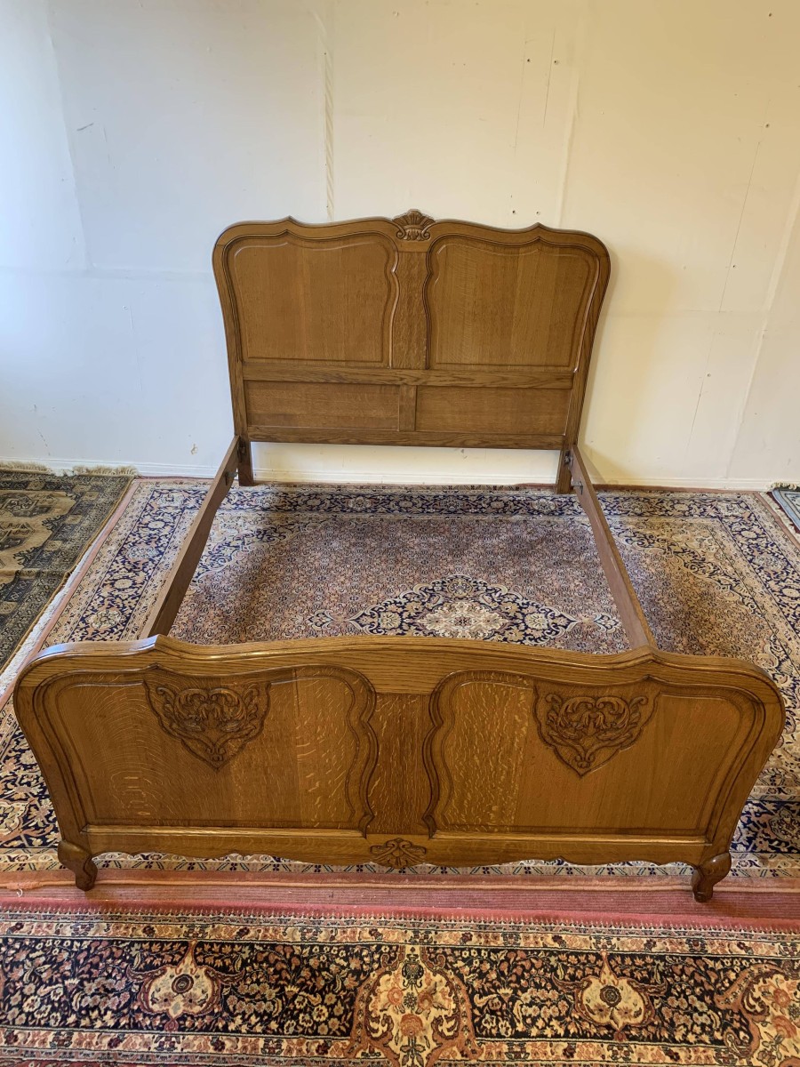 The headboard has a shaped top rising to a decorative central carving, below are two shaped recessed panels. The footboard is also shaped and has two carved recessed panels with a central carving. The bed is connected by shaped side rails and the footboard stands on shaped cabriole legs. The bed takes a standard double mattress.