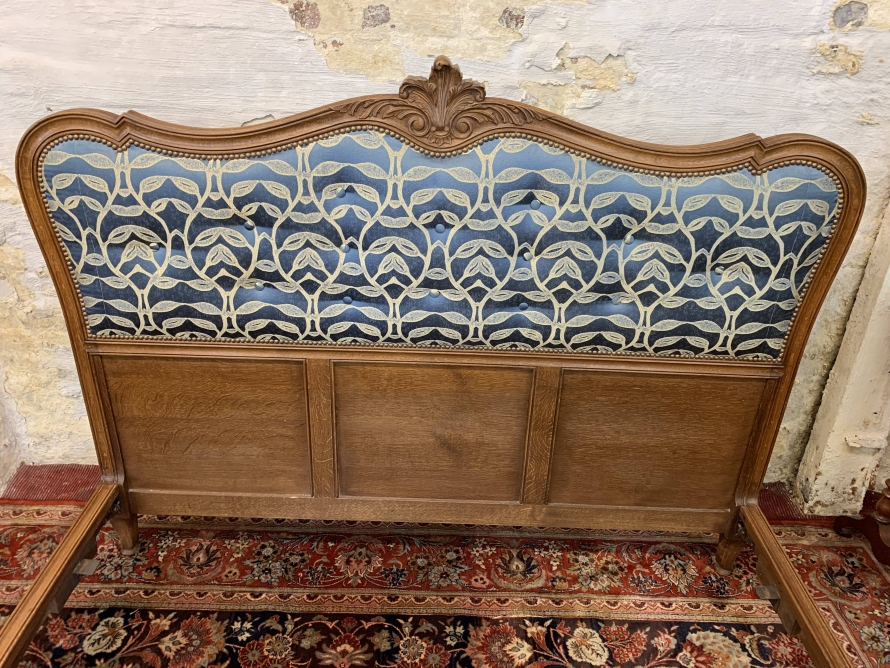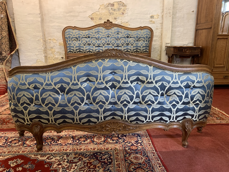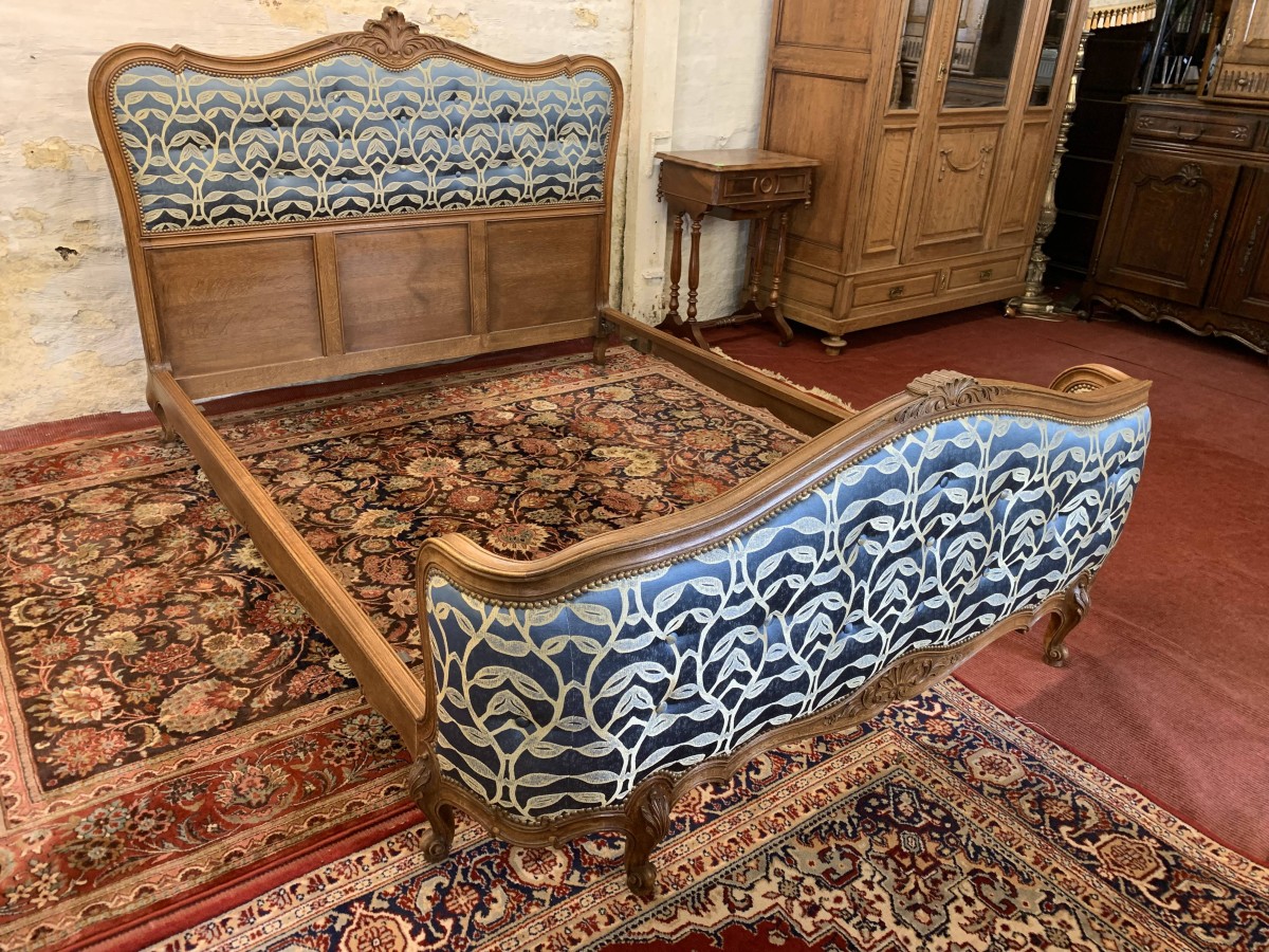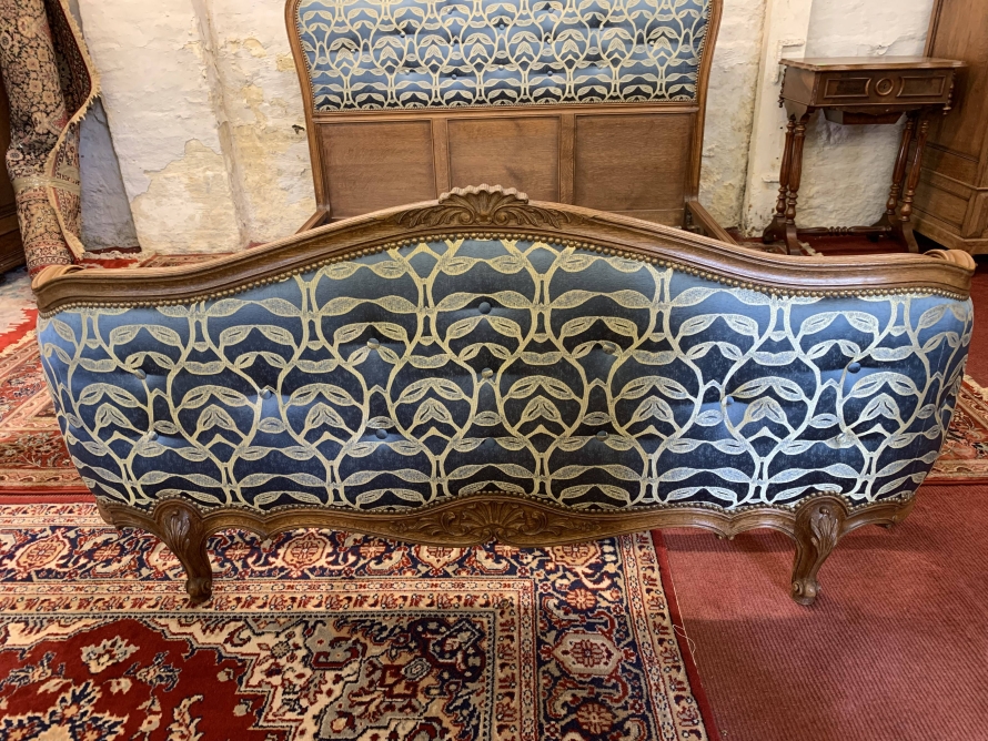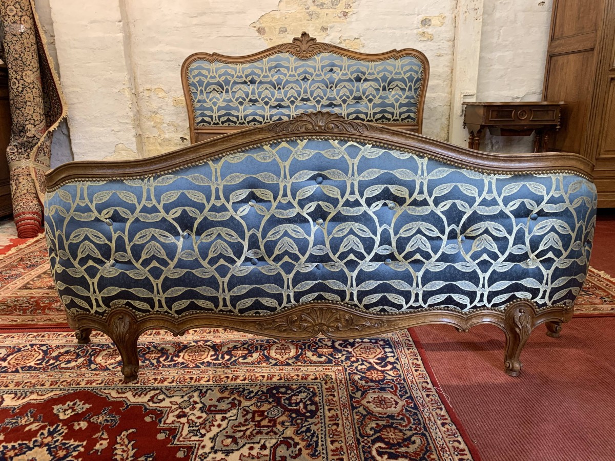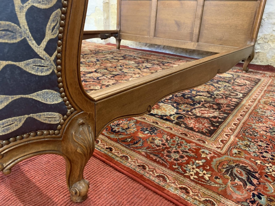 This fine example of French furniture is in excellent condition. The shaped headboard rises to a decorative central carving. The headboard has a studied edge to the upholstery. The shaped footboard rises to a central carving also with studied edging to the upholstery both to the interior and exterior of the footboard. Connected by shaped side rails this stunning King sized bed stands on six carved shaped cabriole legs.