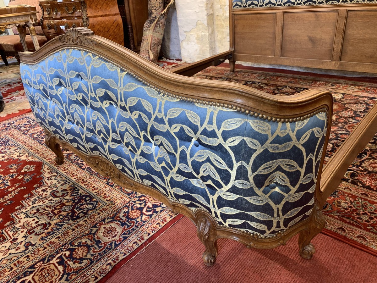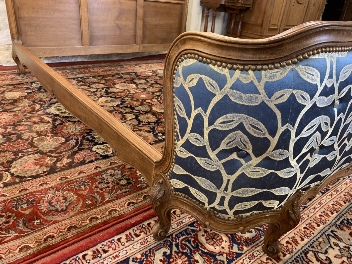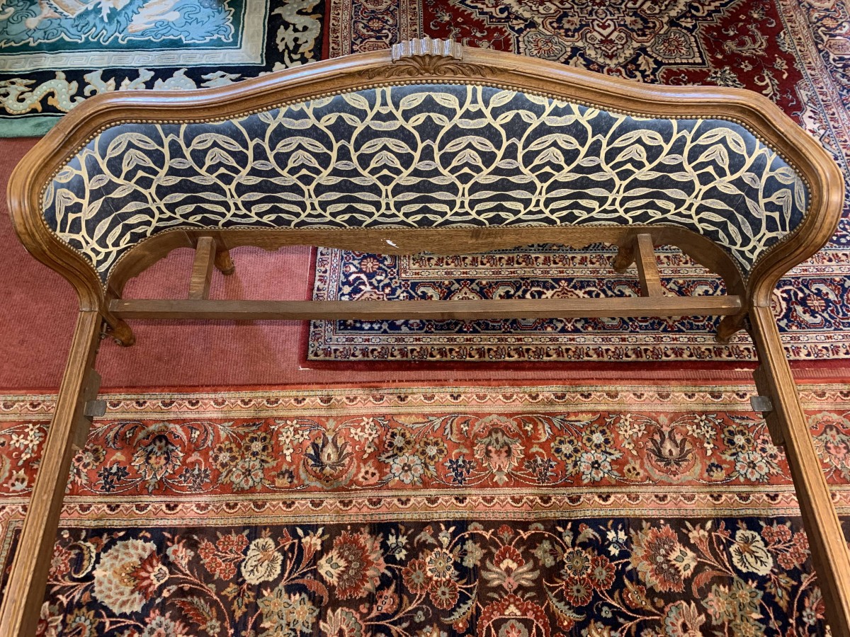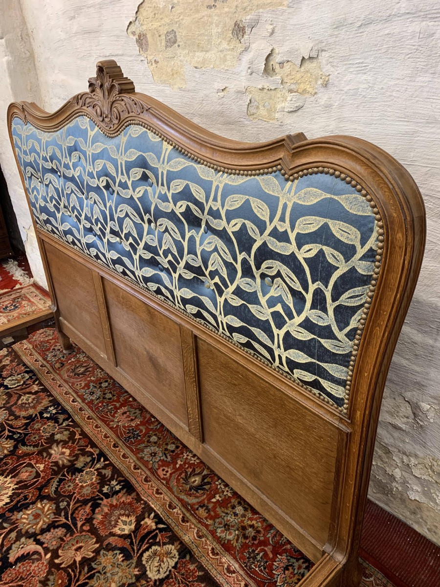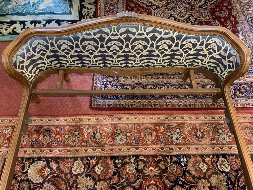 This fine example of French furniture is in excellent condition. The shaped headboard rises to a decorative central carving. The headboard has a studied edge to the upholstery. The shaped footboard rises to a central carving also with studied edging to the upholstery both to the interior and exterior of the footboard. Connected by shaped side rails this stunning King sized bed stands on six carved shaped cabriole legs.