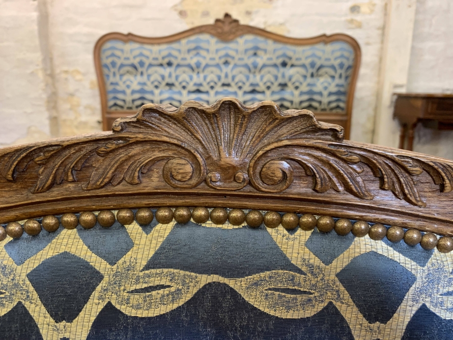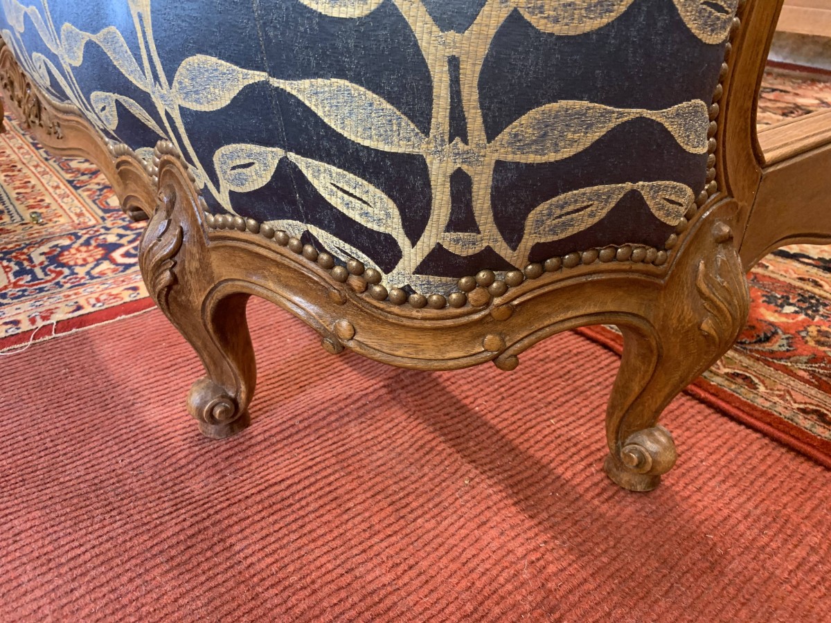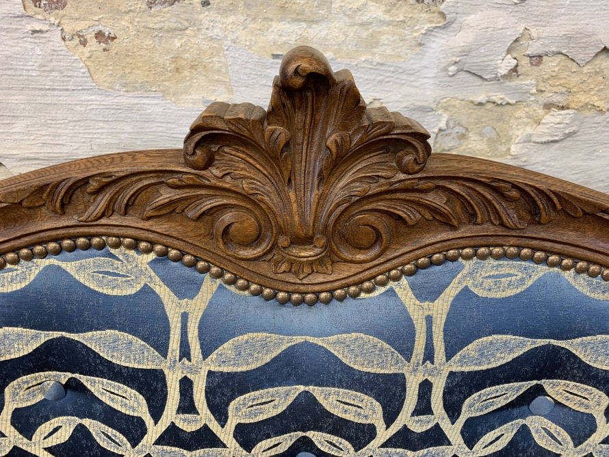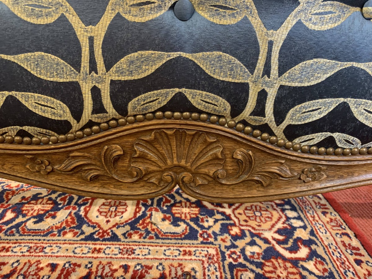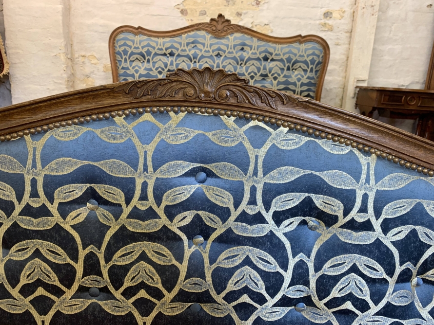This fine example of French furniture is in excellent condition. The shaped headboard rises to a decorative central carving. The headboard has a studied edge to the upholstery. The shaped footboard rises to a central carving also with studied edging to the upholstery both to the interior and exterior of the footboard. Connected by shaped side rails this stunning King sized bed stands on six carved shaped cabriole legs.