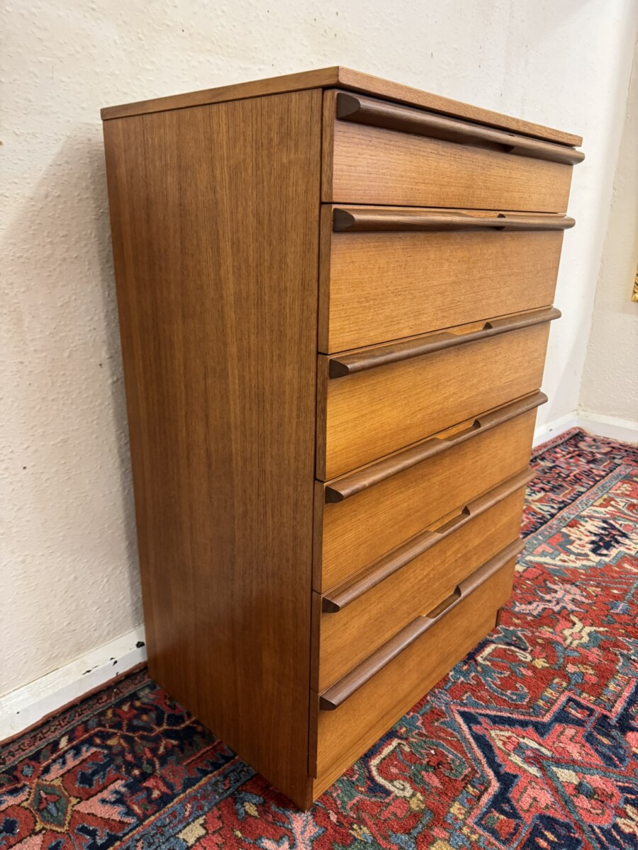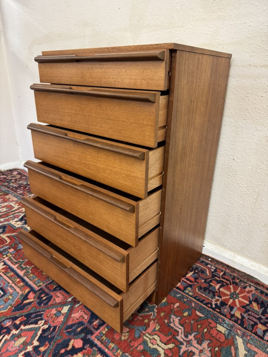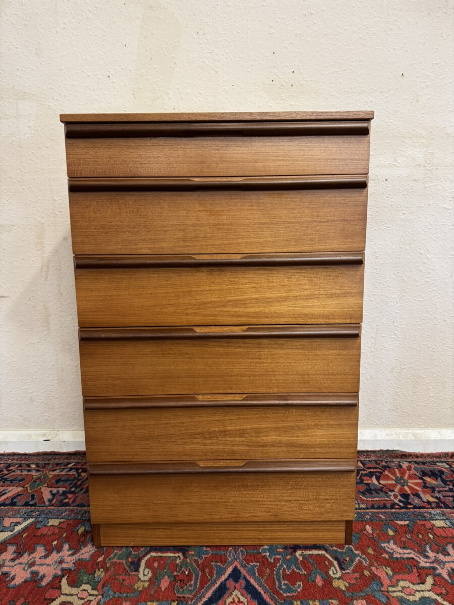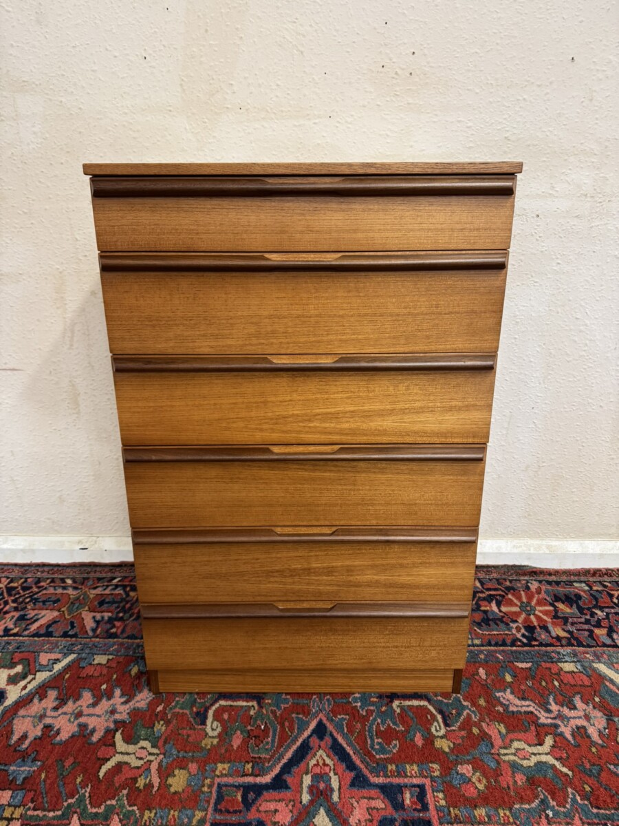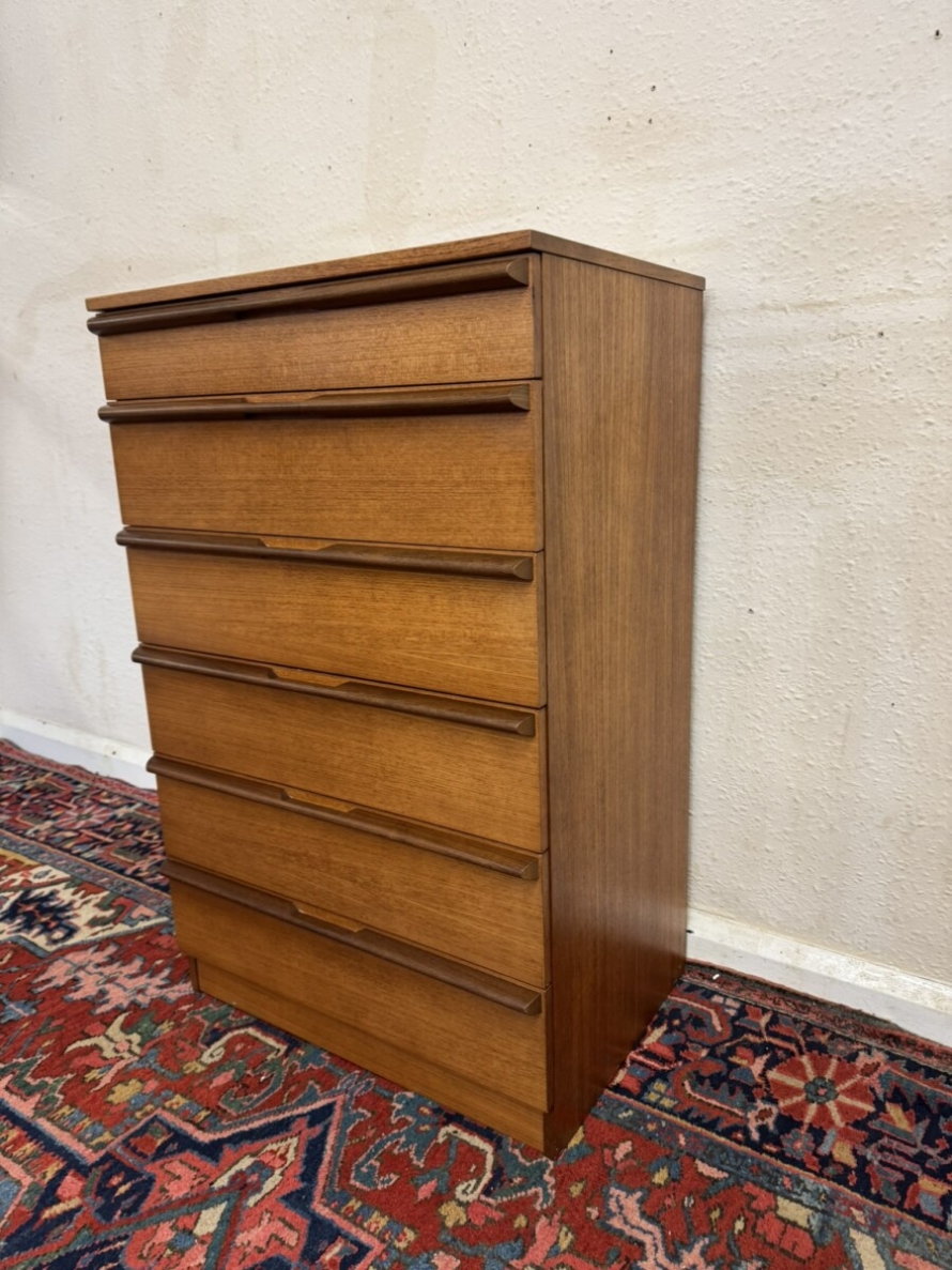 Great chest which dates circa 1960. Made in teak wood and in excellent condition. Each of the six drawers has a stylish pull handle. The chest sits on a platform plinth base.