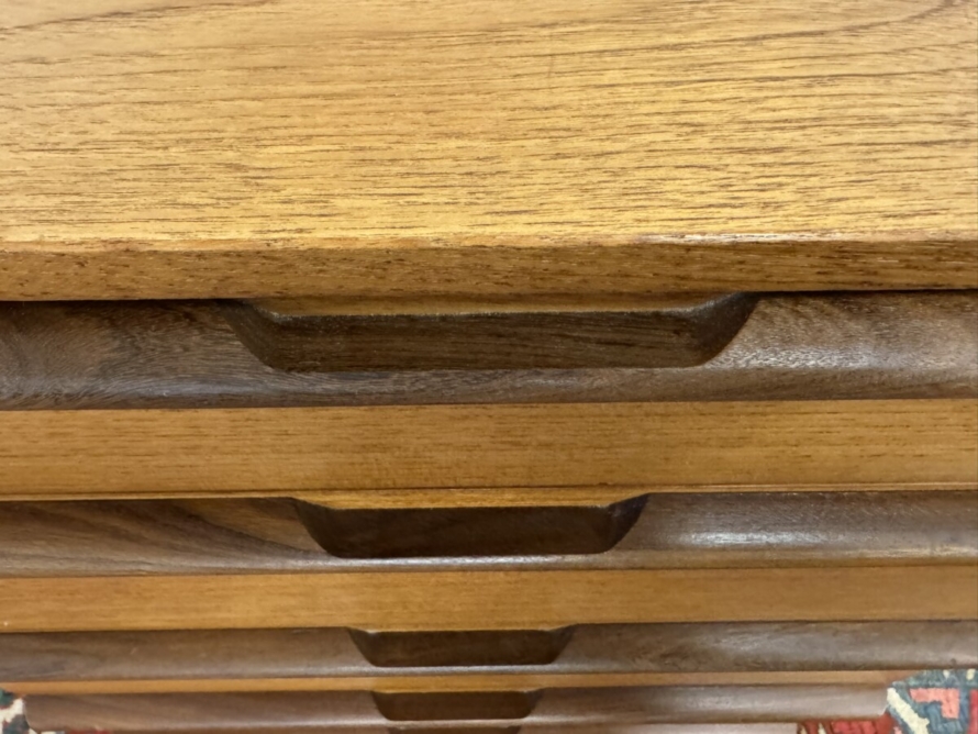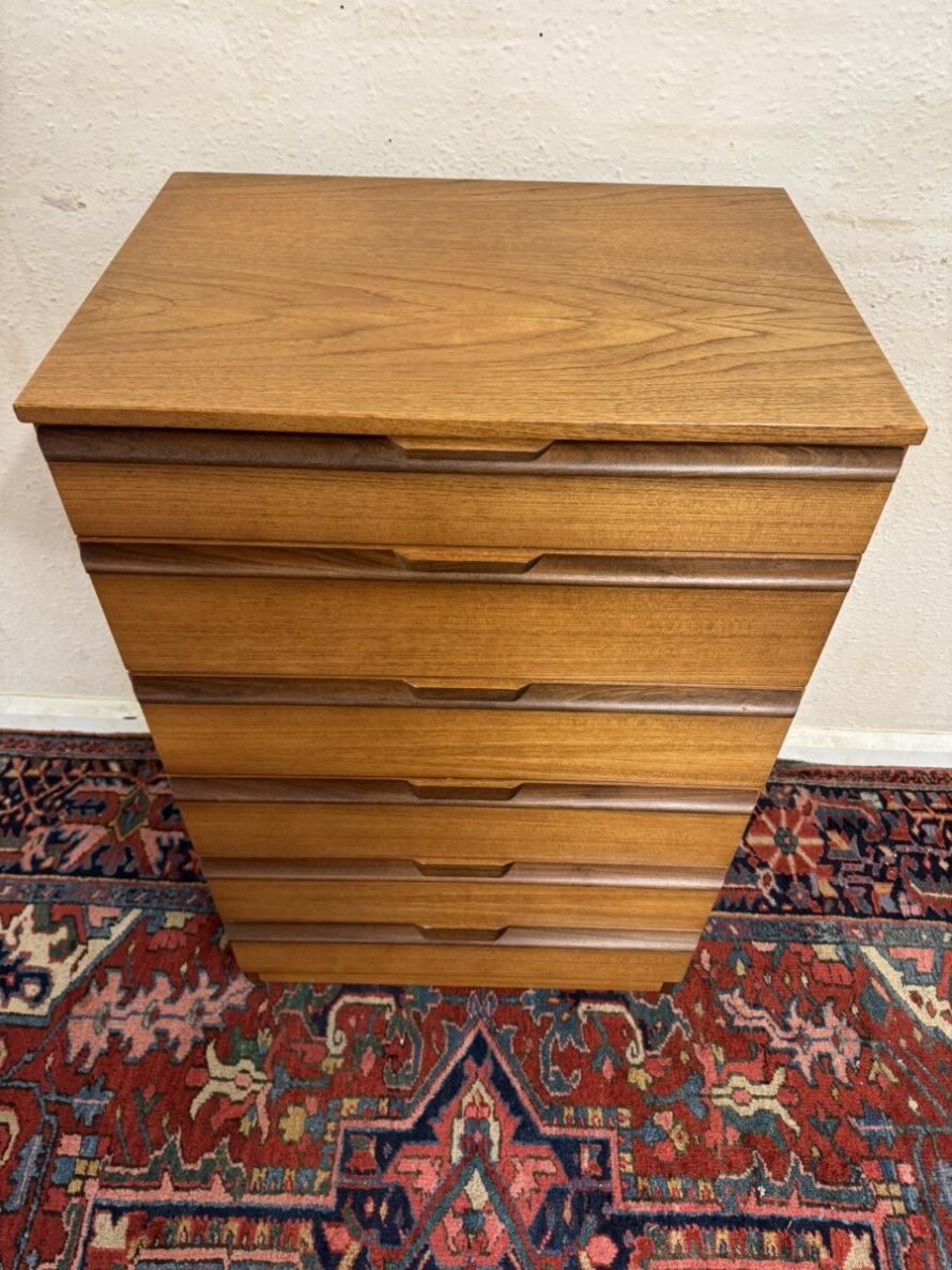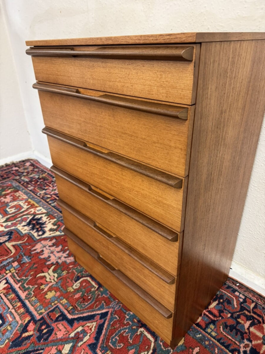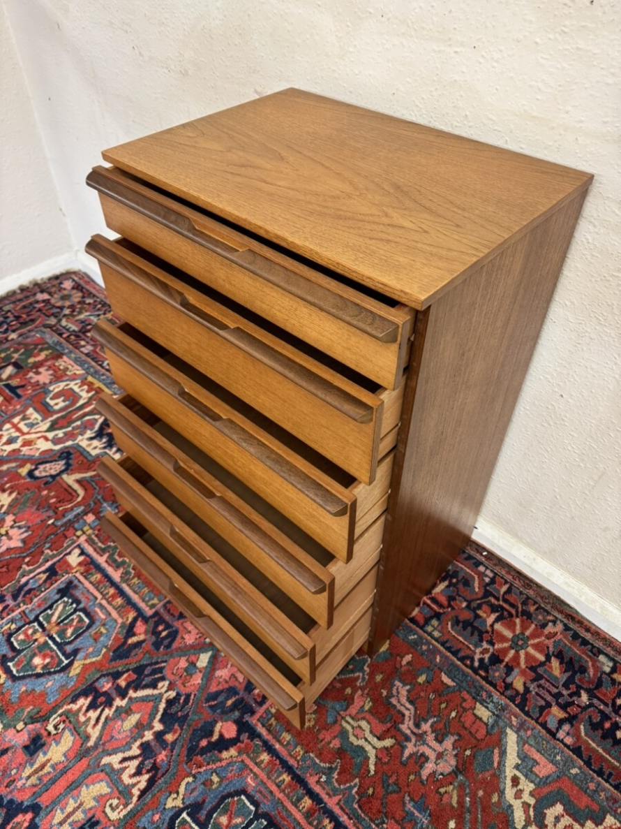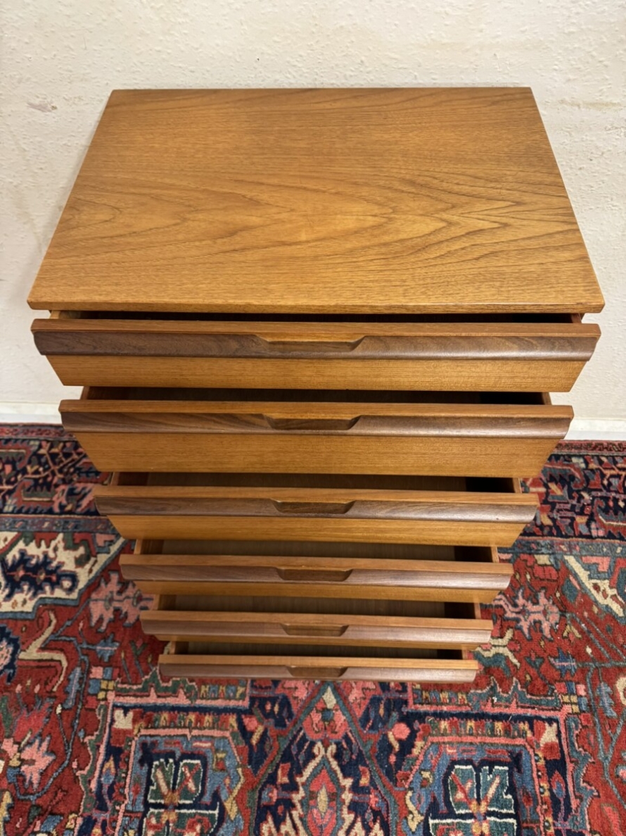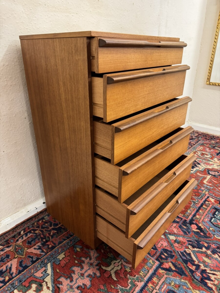 Great chest which dates circa 1960. Made in teak wood and in excellent condition. Each of the six drawers has a stylish pull handle. The chest sits on a platform plinth base.