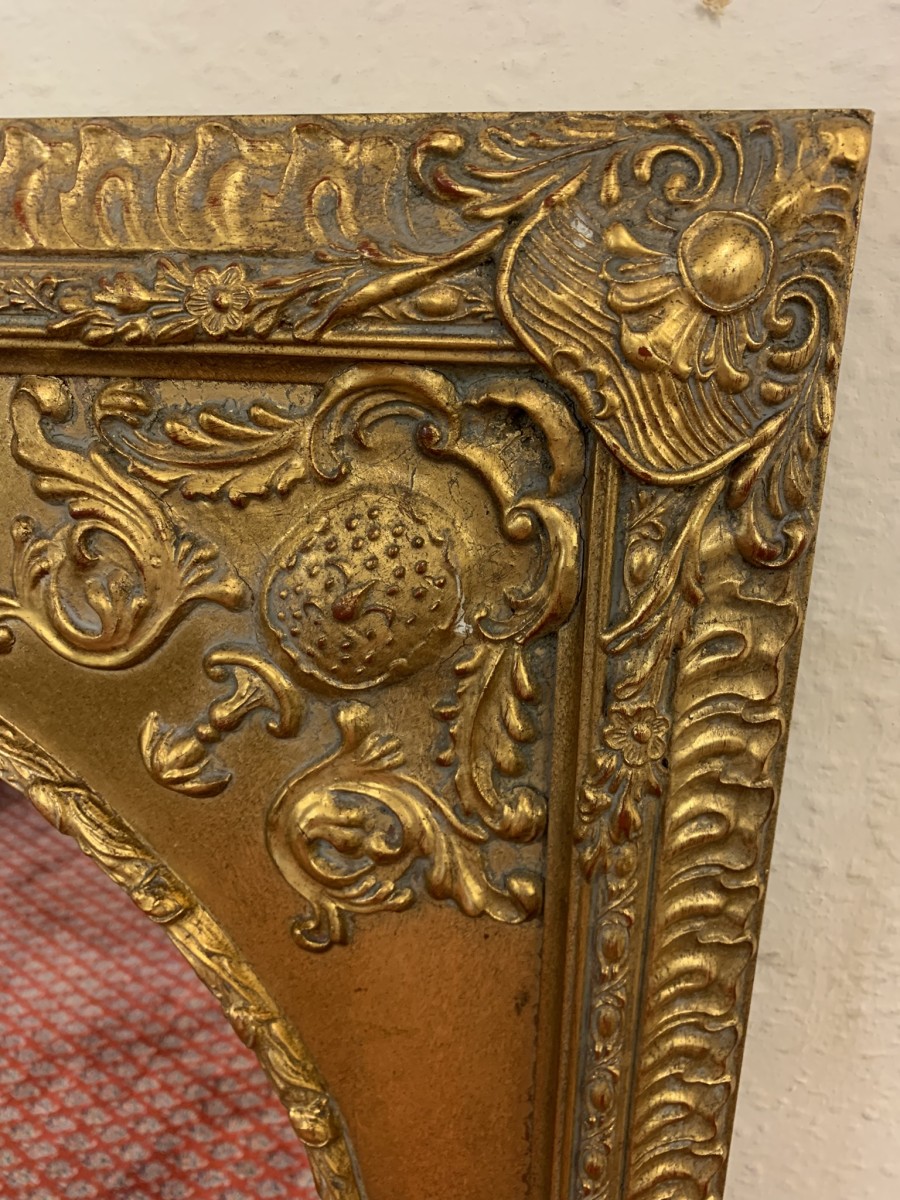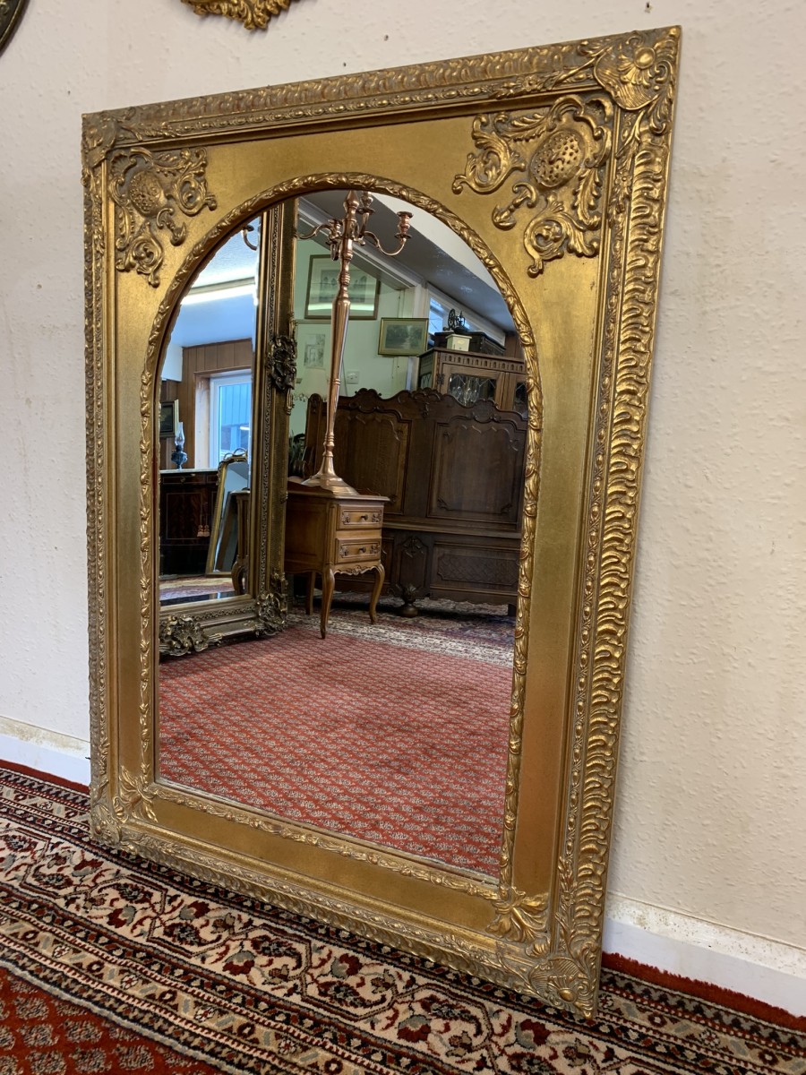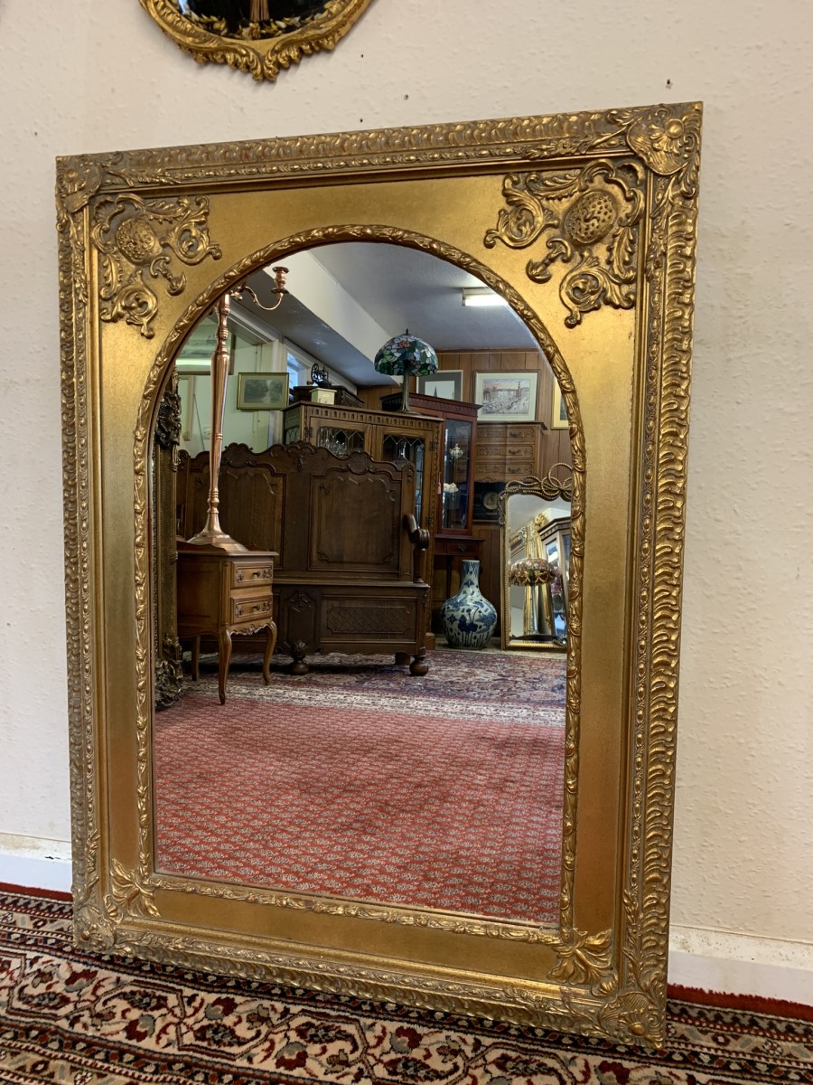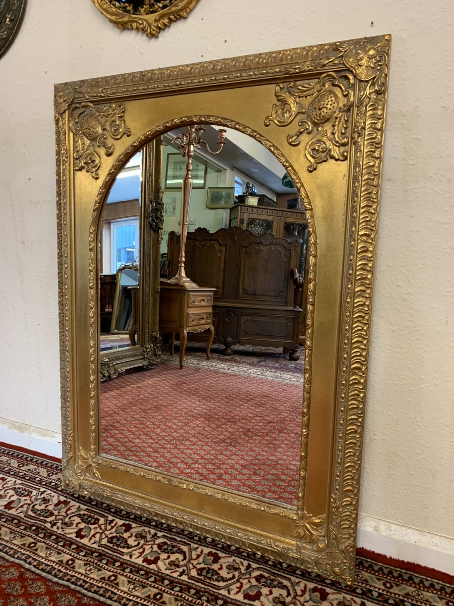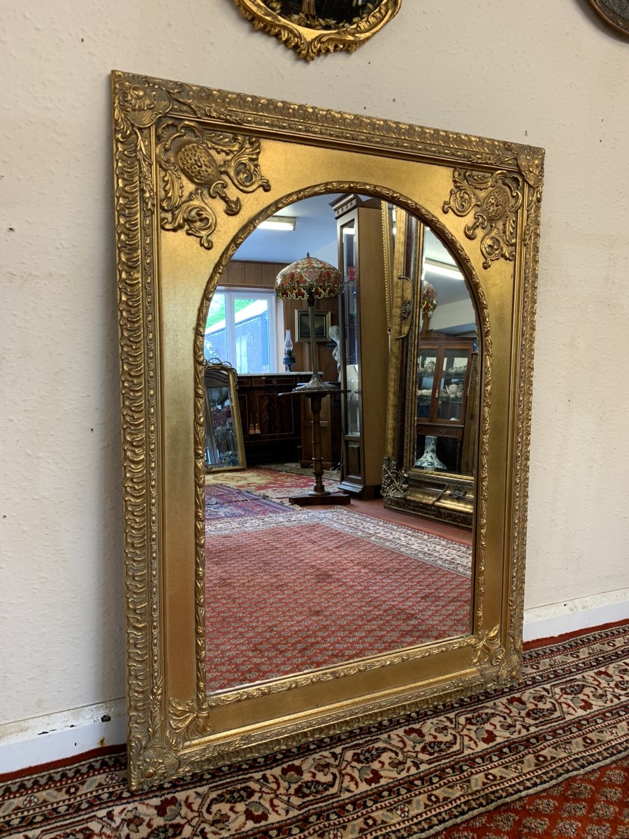 The mirror is in excellent condition. The arched shaped mirror has a carved edging. The mirror sits in a elaborately carved frame.