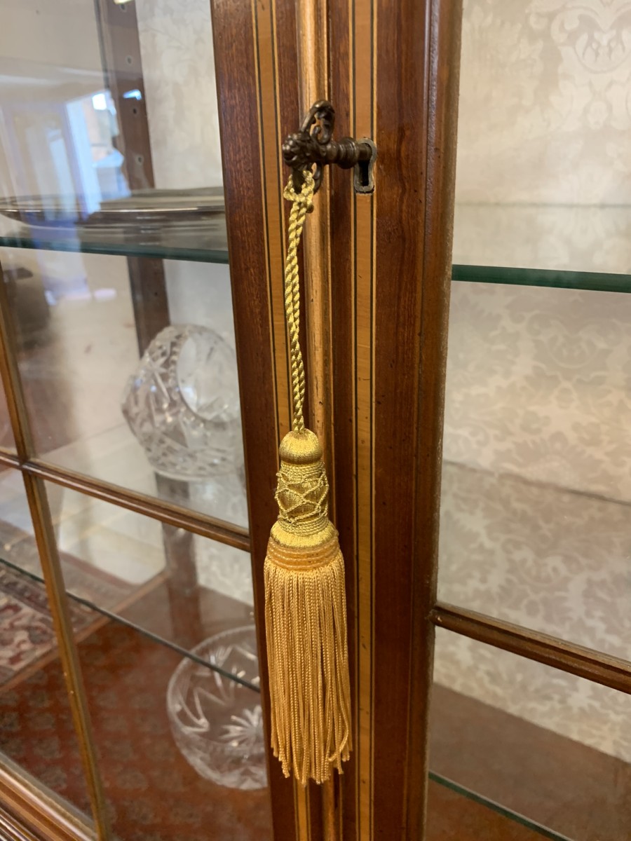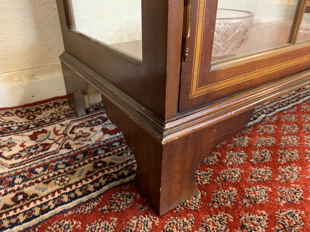 Fabulous inlaid swags and tails decoration sits above the four lockable inlaid glazed doors, the glazed doors open to reveal three adjustable and removable shelves. With glazed sides this fine mahogany inlaid cabinet stands on five bracket feet.