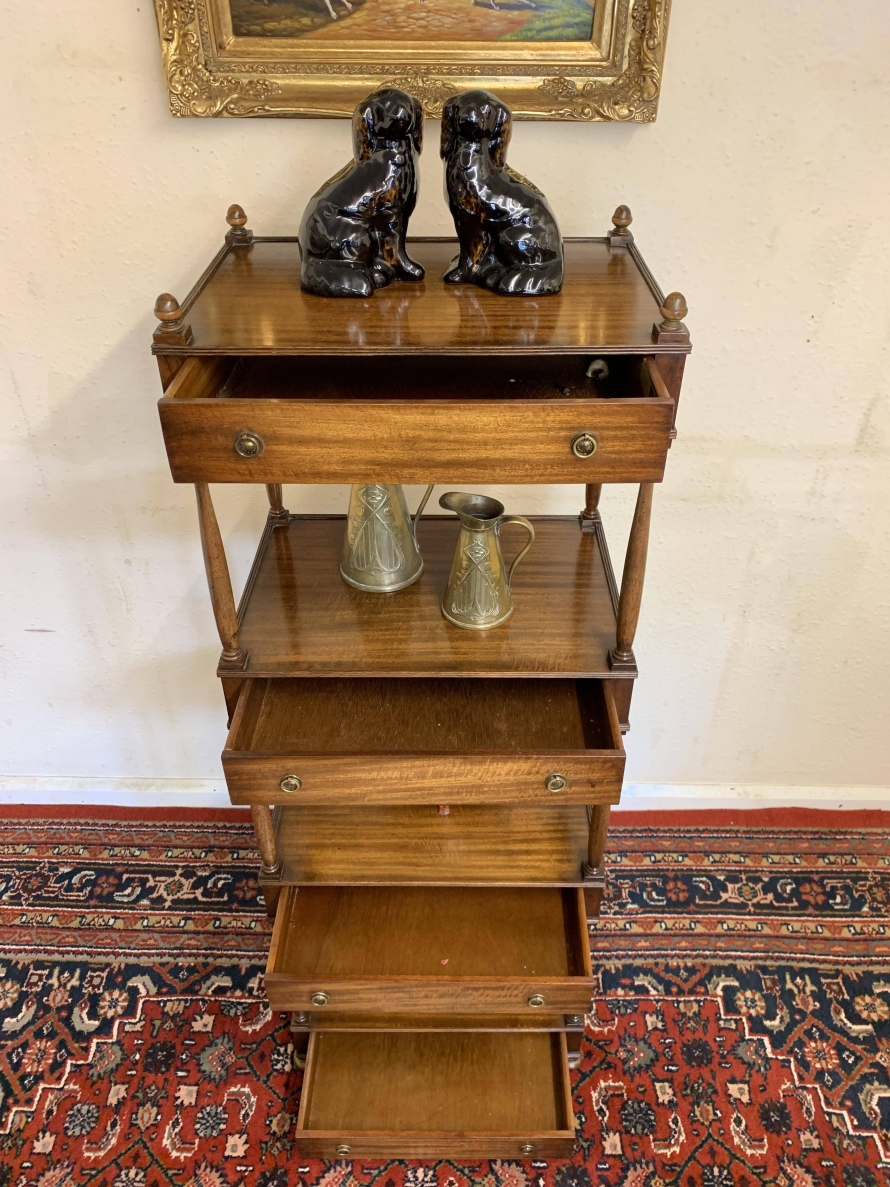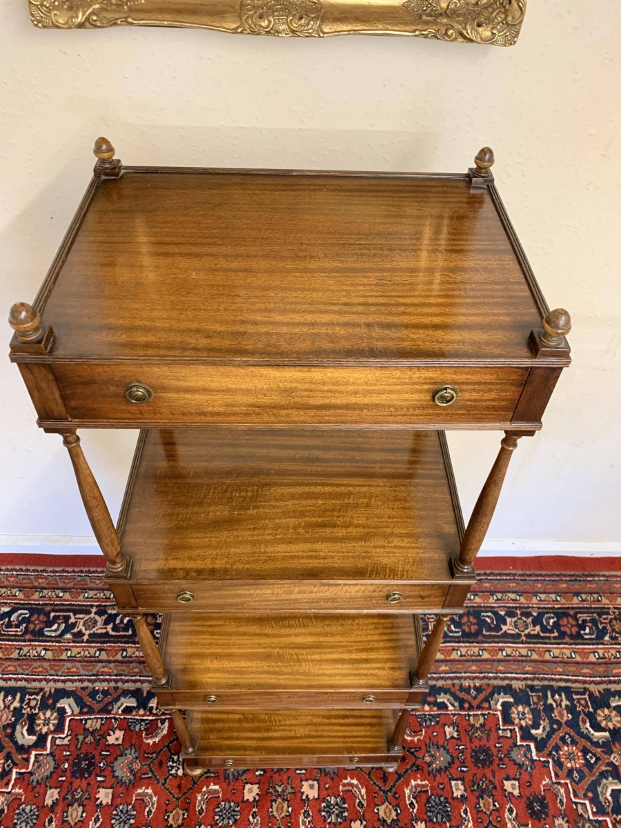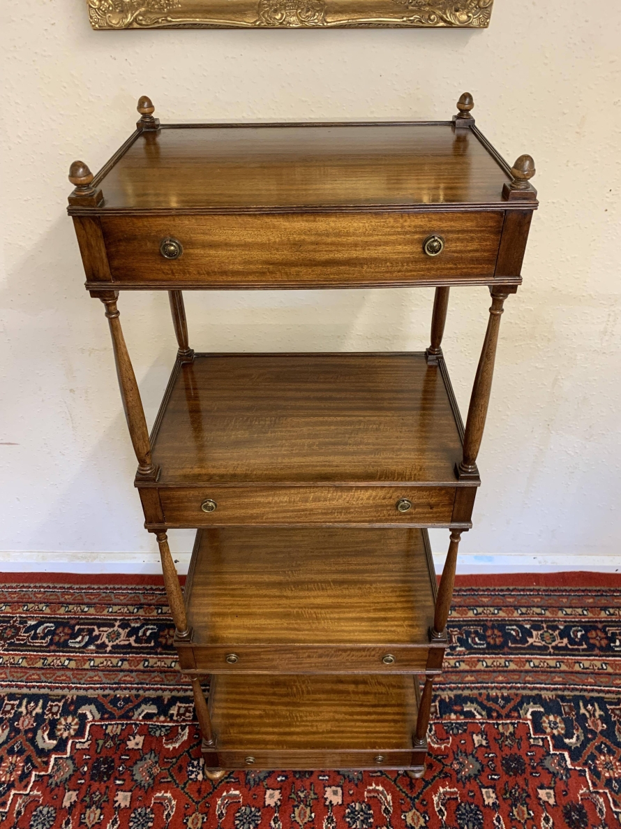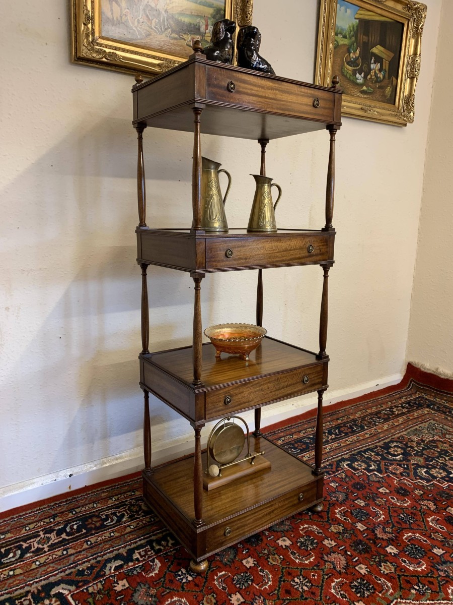Made by the renowned Bevan Funnell furniture company in beautiful mahogany this whatnot stand is in excellent condition. Each of the four tiers of the whatnot stand have a drawer below, each of the drawers having a pair of brass ring handles. Connected by turned column supports this super item stands on four turned feet.