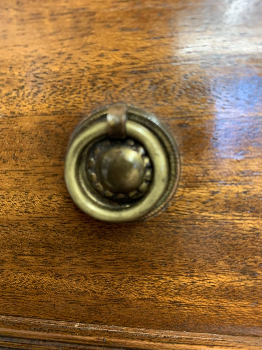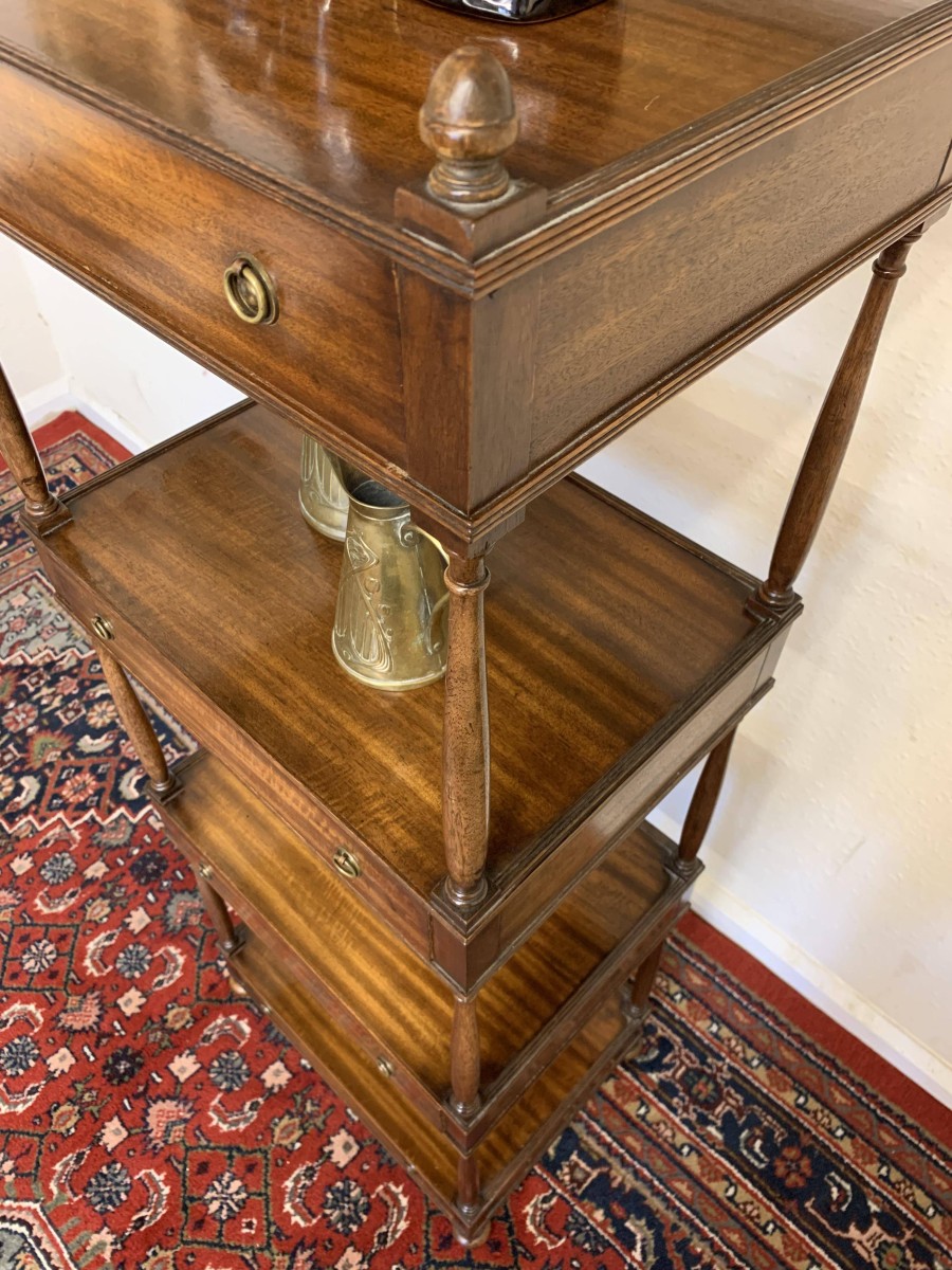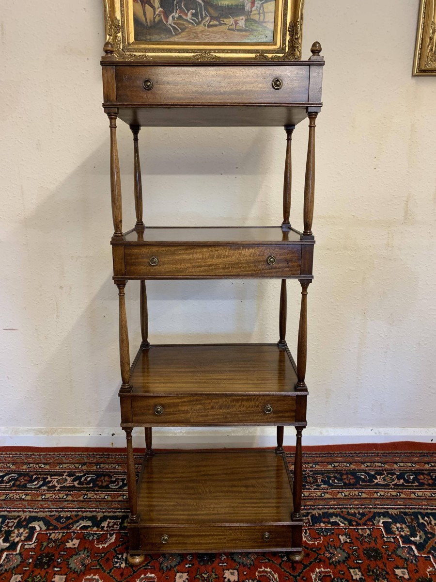 Made by the renowned Bevan Funnell furniture company in beautiful mahogany this whatnot stand is in excellent condition. Each of the four tiers of the whatnot stand have a drawer below, each of the drawers having a pair of brass ring handles. Connected by turned column supports this super item stands on four turned feet.