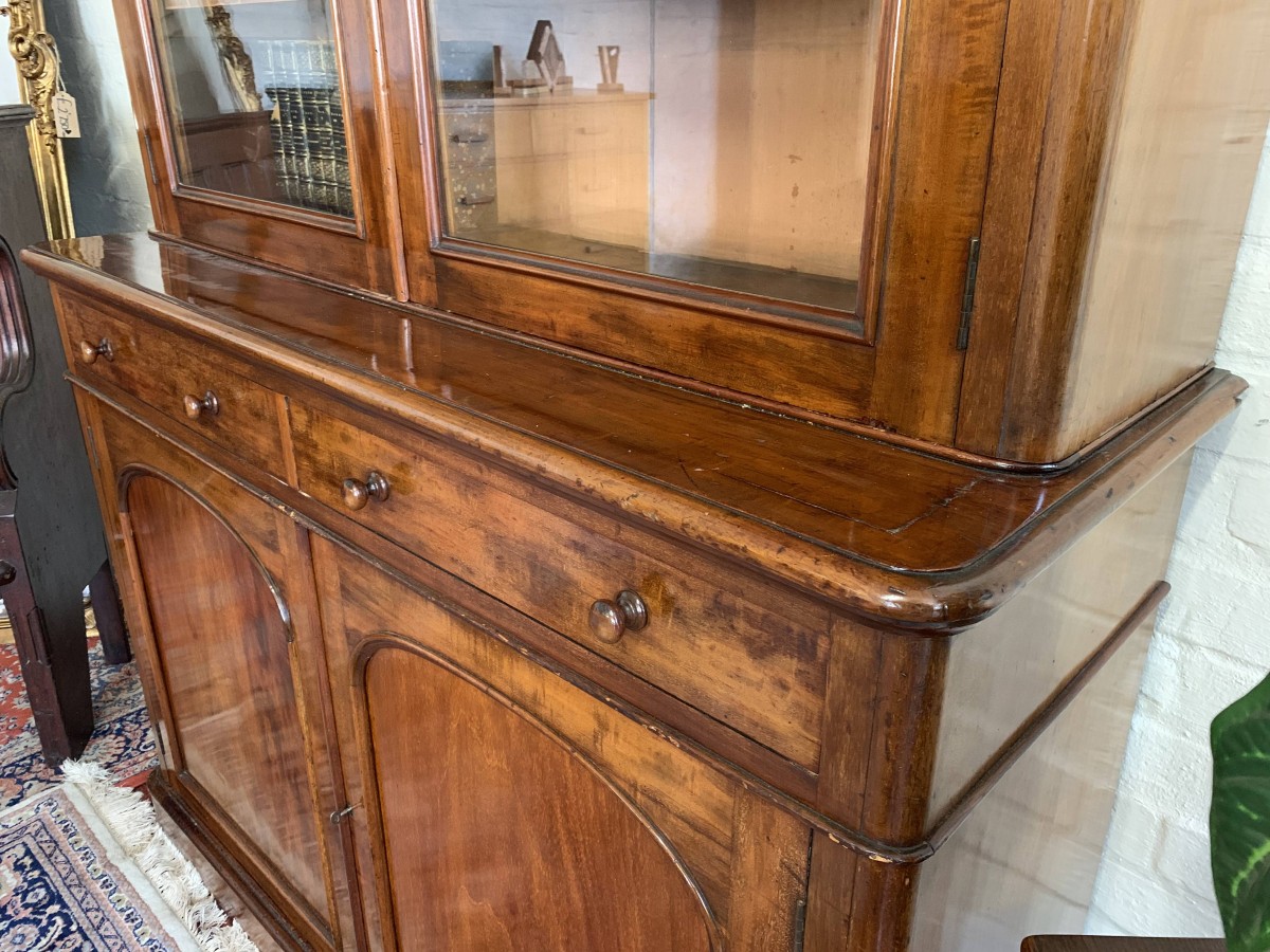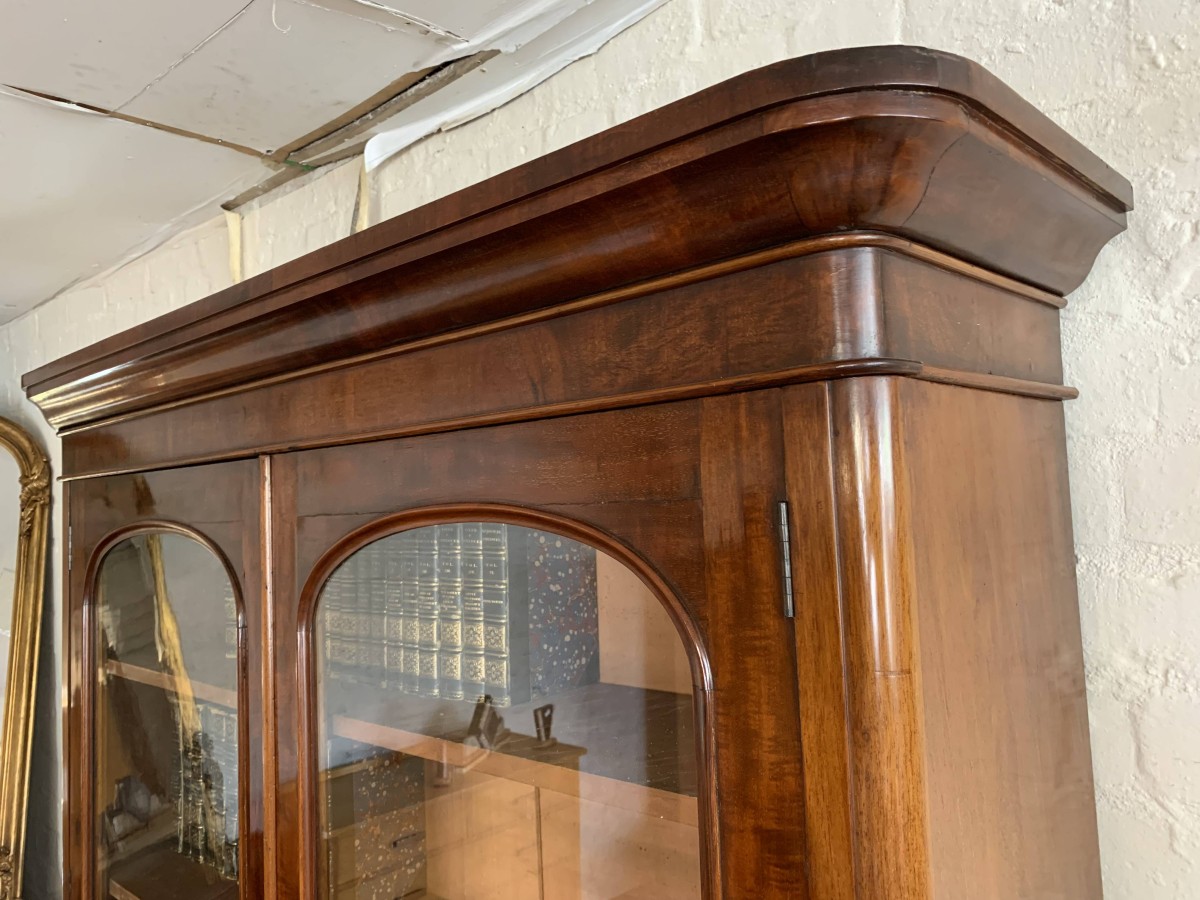 The rounded corners of the oversailing top sit above two glazed arched lockable doors which open to reveal three adjustable shelves. The base has two drawers, each with a pair turned knob handles which sit above a pair of arched doors, the doors open to reveal a removable shelf. The bookcase has a plinth base.