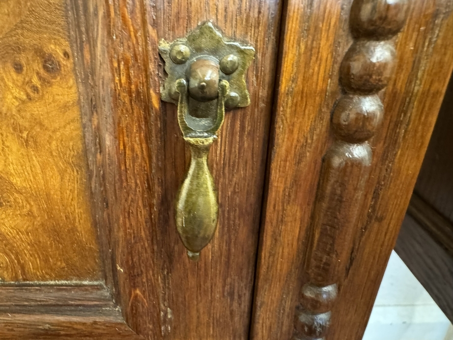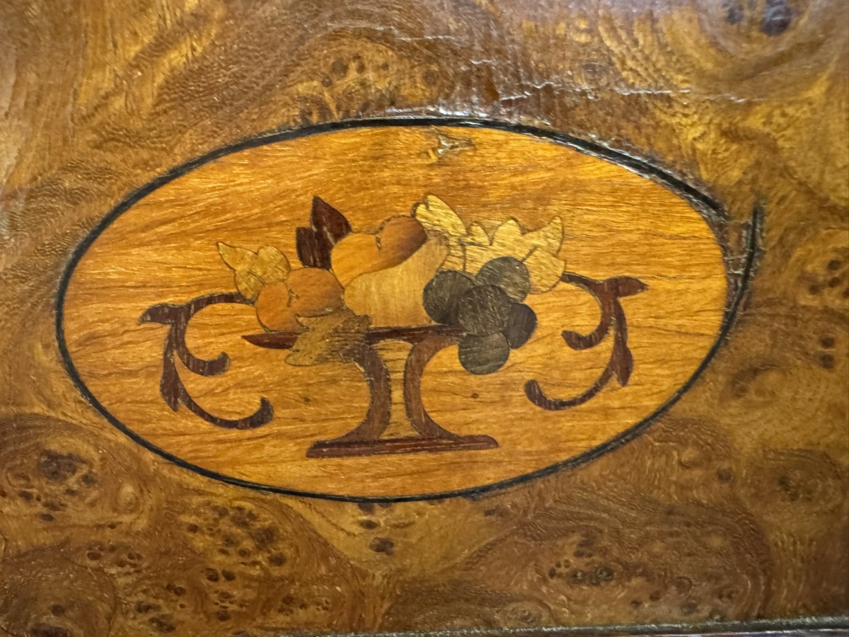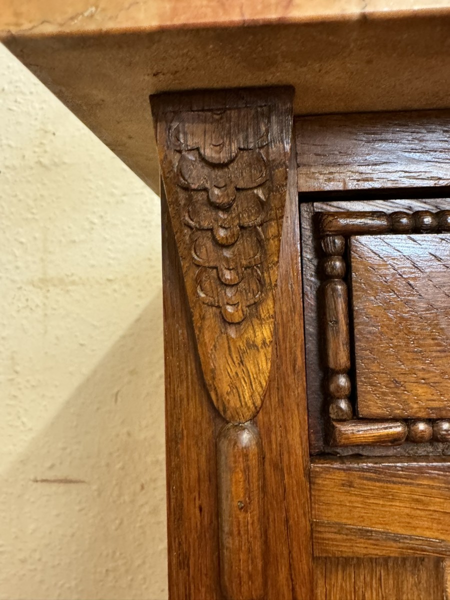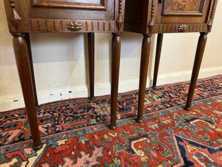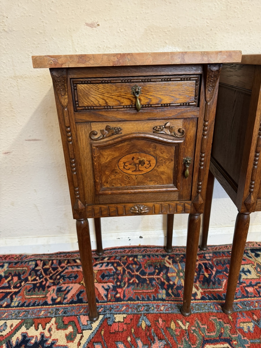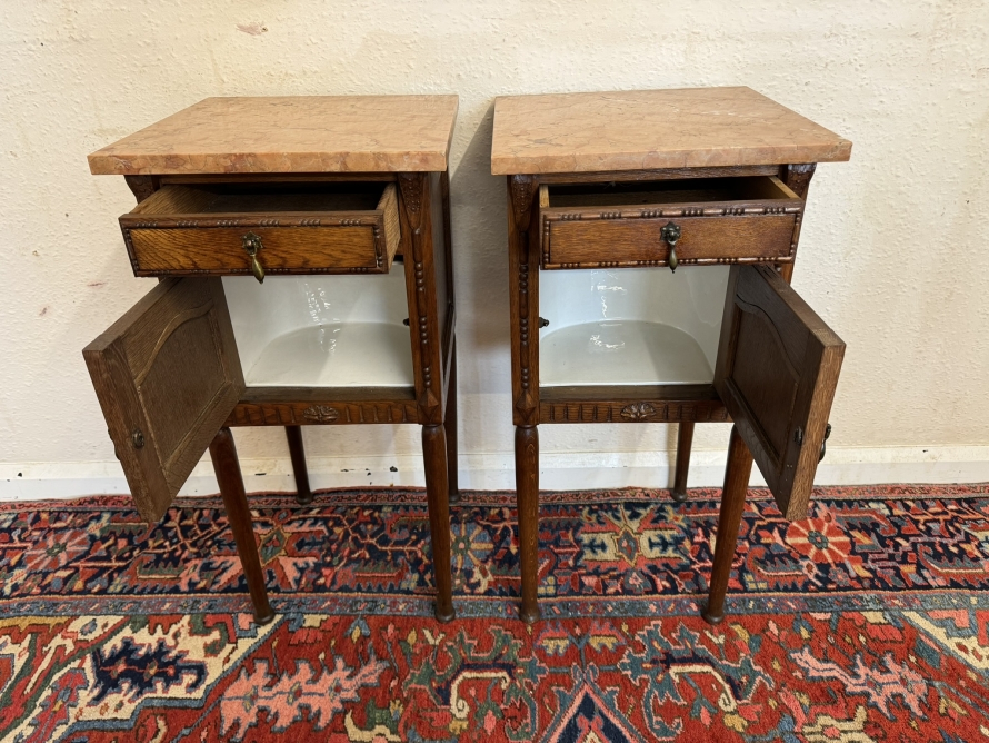 The marble top sits above a drawer which sits above a beautifully inlaid recessed panel cupboard door, the doors open to reveal the original ceramic interior. Carvings to the front and side these fabulous cabinets stand on four turned legs.