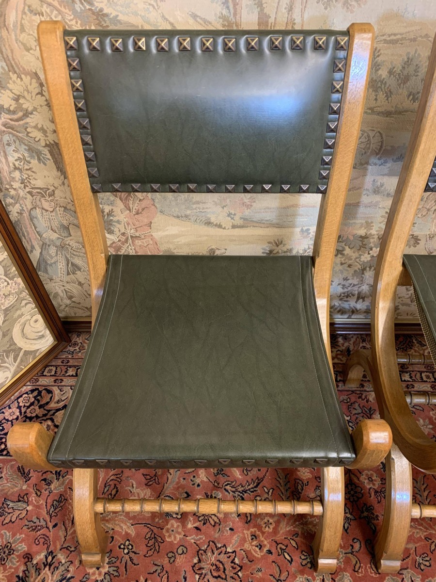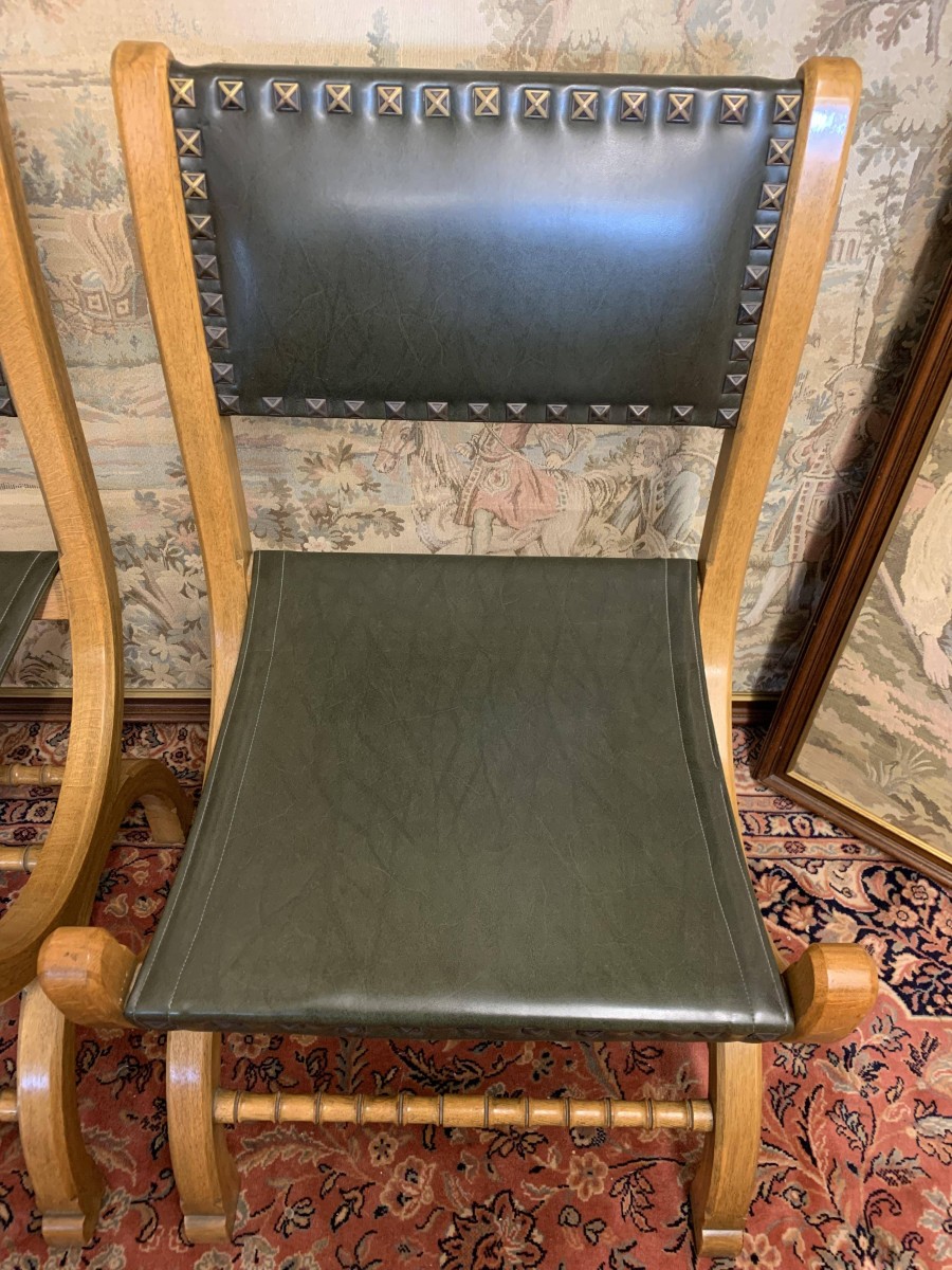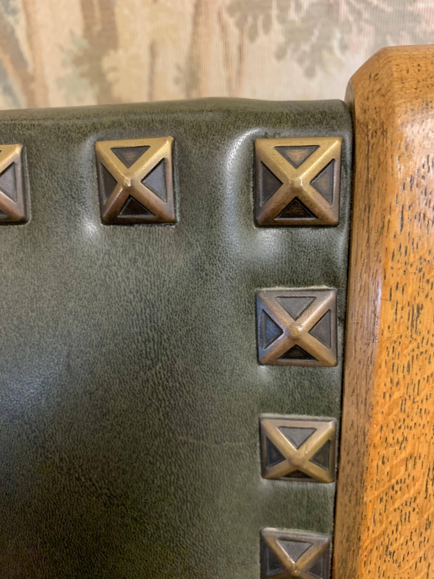 The chairs date circa 1920s. Having leathered upholstered back and seat with brass diamond studded decoration. The chairs are chamfered throughout and have three turned cross stretcher supports. Each chair is in excellent solid and sturdy condition. A stunning pair of chairs.