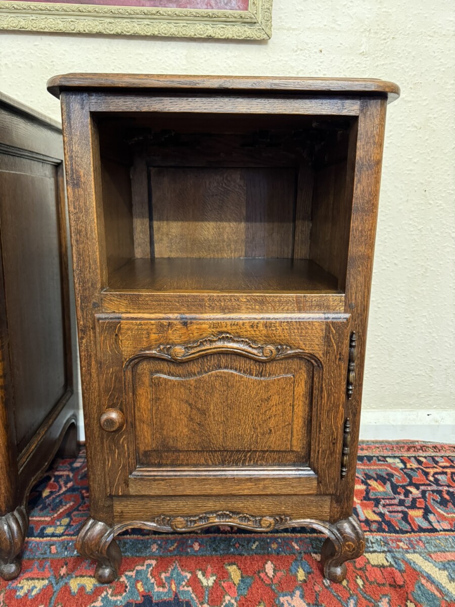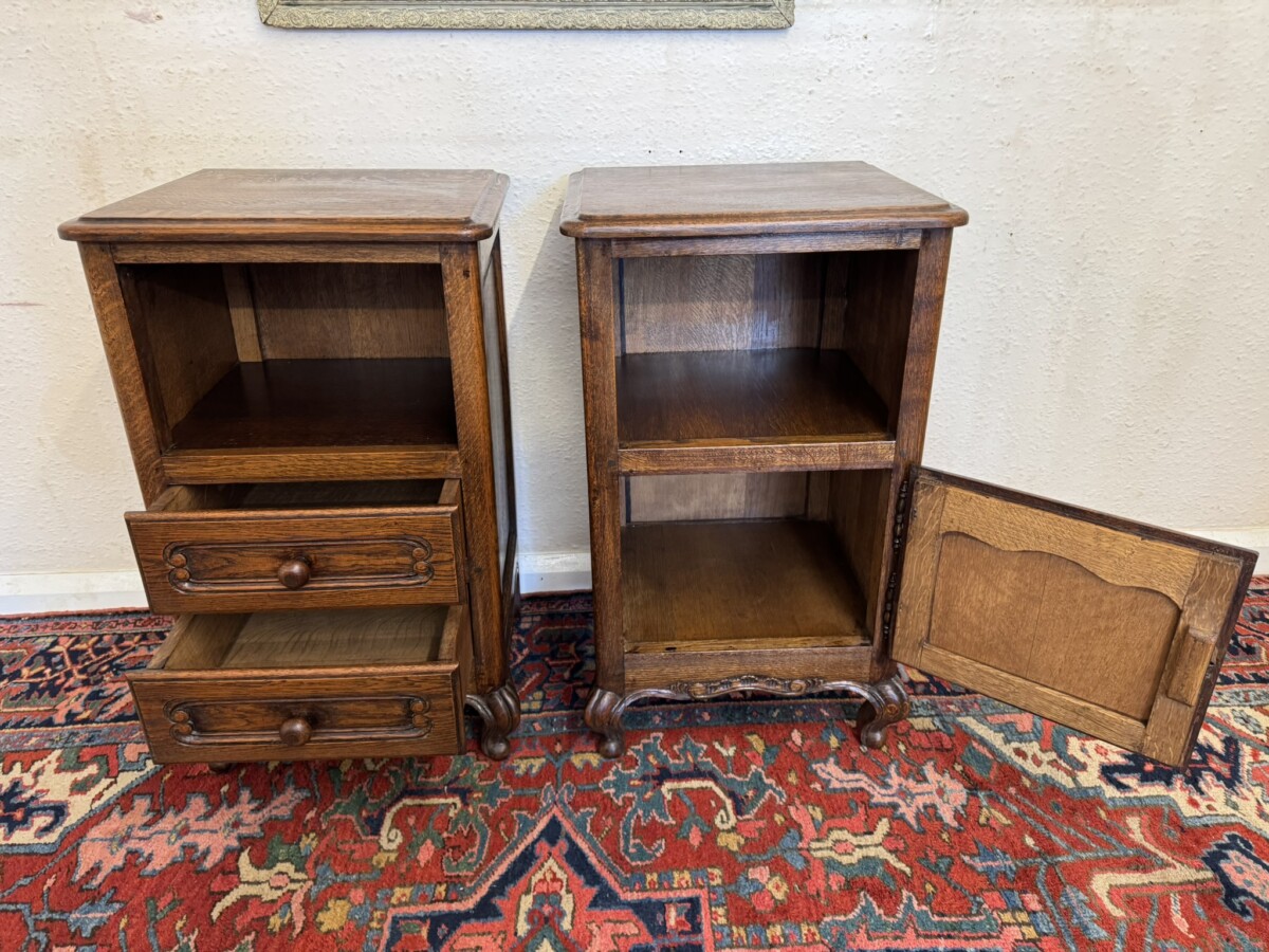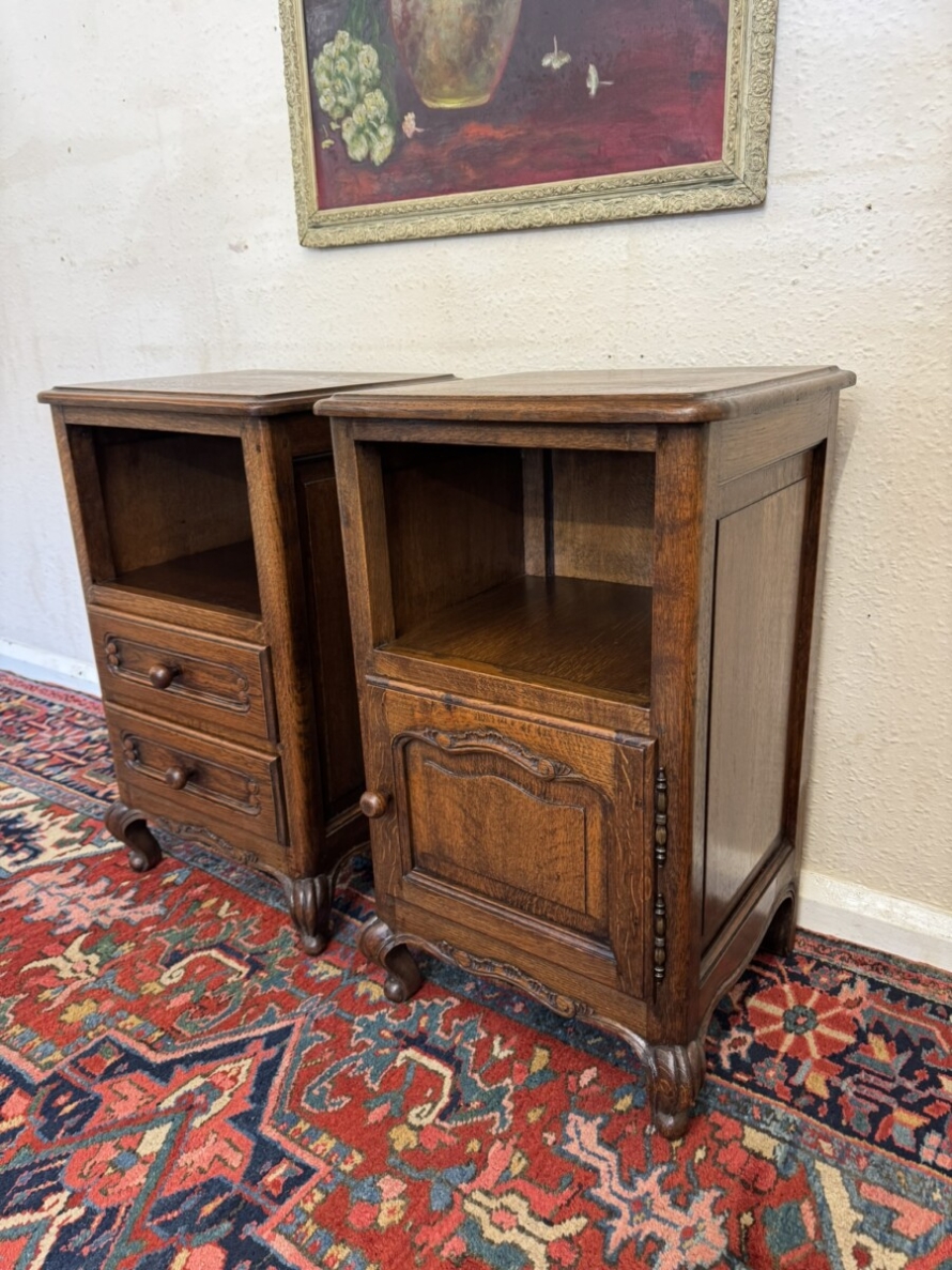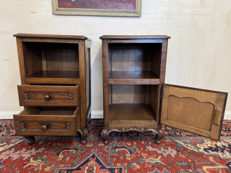 This super pair of his and hers French oak bedside cabinets are in excellent condition. One cabinet having an oversailing top, open section and two carved drawers, each drawer having a turned knob handle. Recessed panelled sides, shaped skirt with central carving to the front and standing on four cabriole shaped legs. The other cabinet having an oversailing top, open section and a carved recessed panel cupboard door, the door having brass hinges and turned handle, recessed panelled sides shaped skirt with central carving and also standing on four cabriole shaped legs.