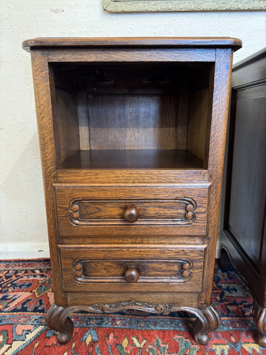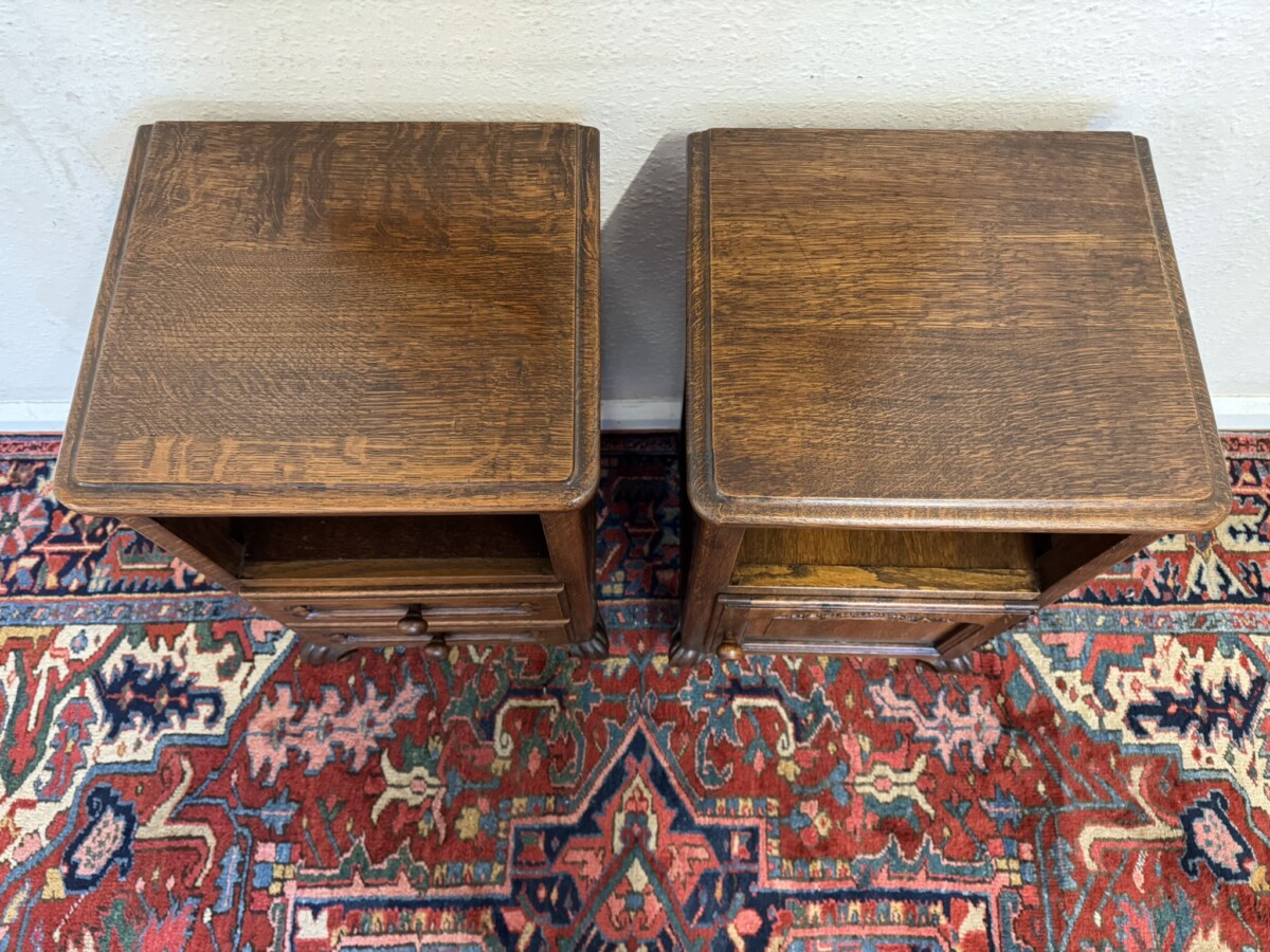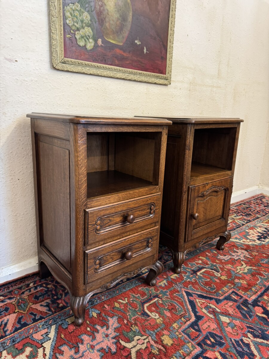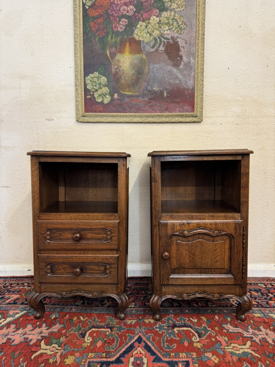 This super pair of his and hers French oak bedside cabinets are in excellent condition. One cabinet having an oversailing top, open section and two carved drawers, each drawer having a turned knob handle. Recessed panelled sides, shaped skirt with central carving to the front and standing on four cabriole shaped legs. The other cabinet having an oversailing top, open section and a carved recessed panel cupboard door, the door having brass hinges and turned handle, recessed panelled sides shaped skirt with central carving and also standing on four cabriole shaped legs.