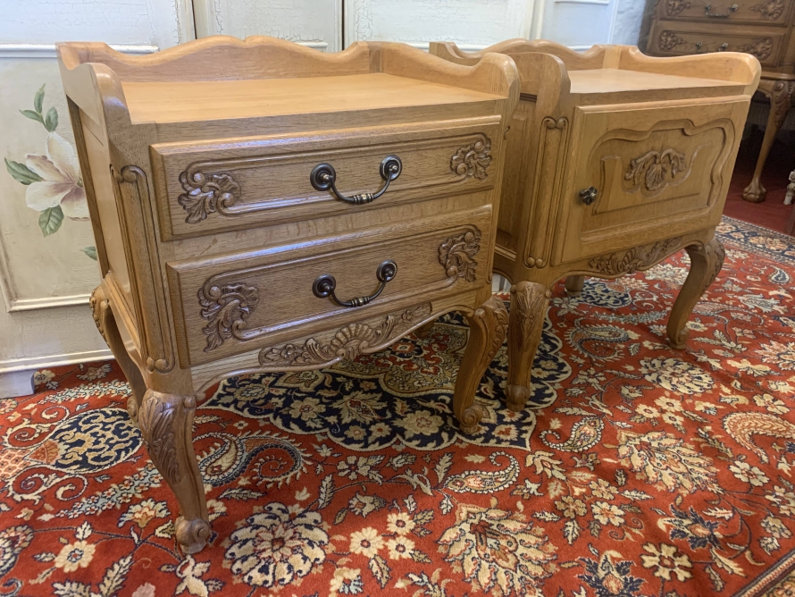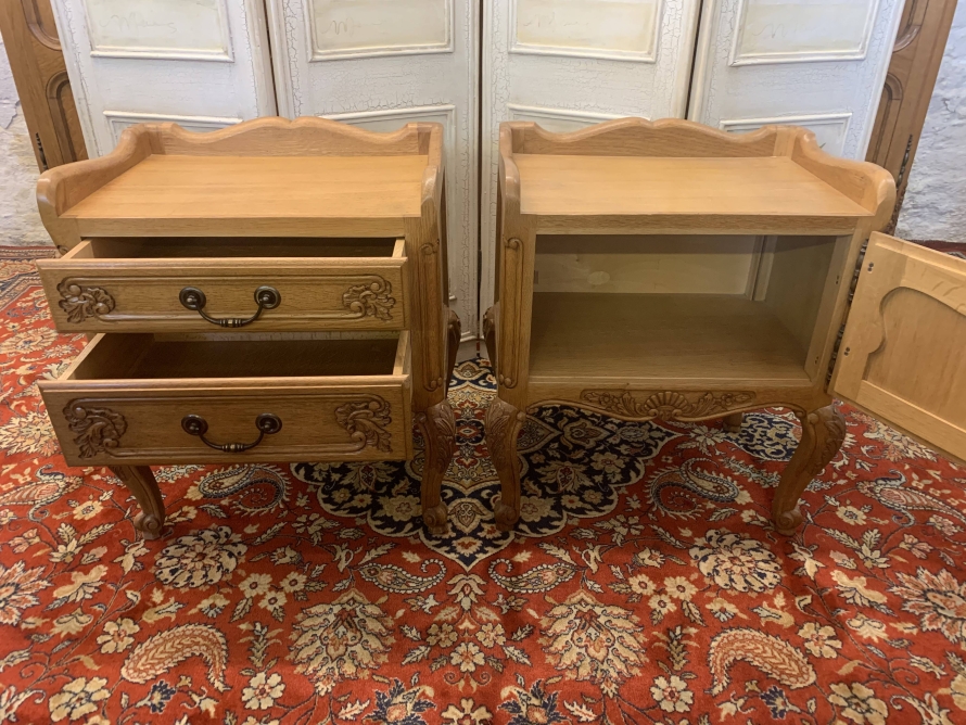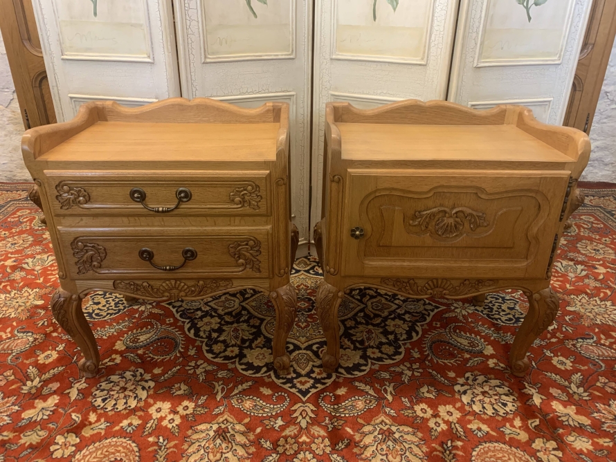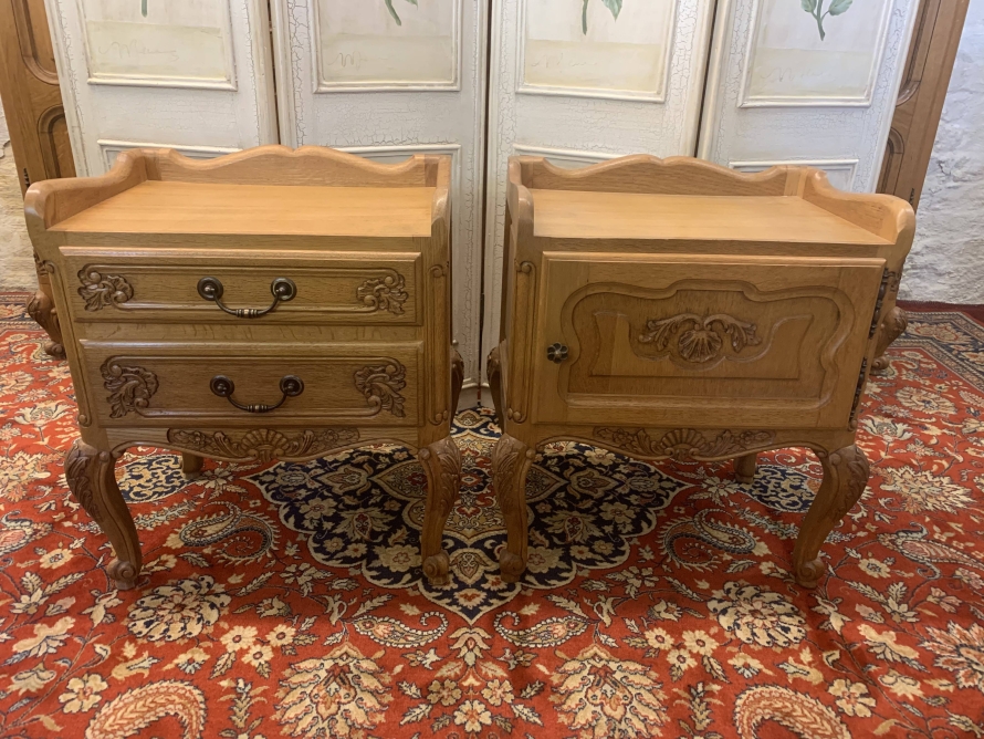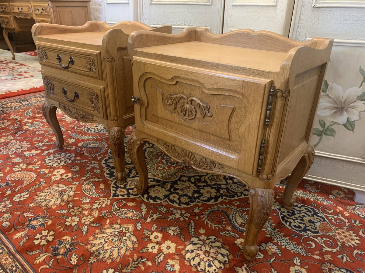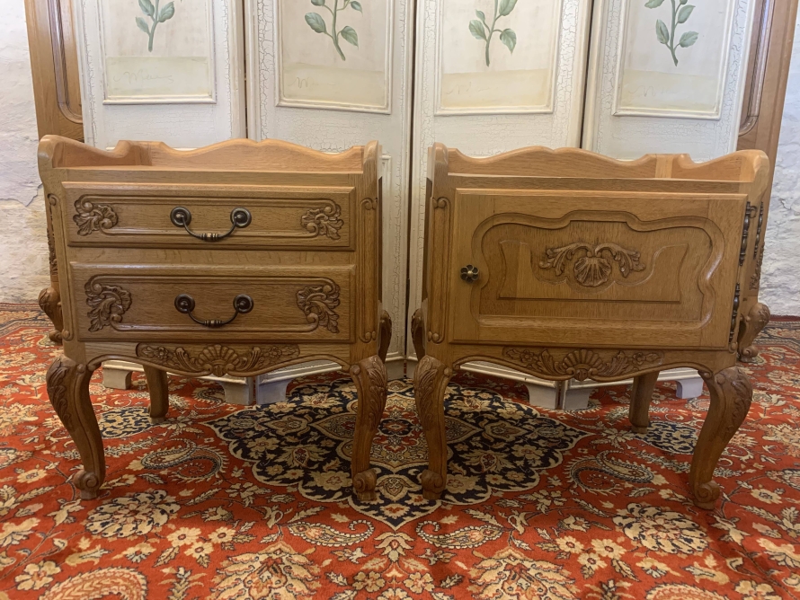 Each French cabinet has a raised shaped back and sides. One Cabinet has two carved recessed panelled drawers, each drawer with a drop handle, shaped skirt with central carvings and standson four carved cabriole shaped legs. The other cabinet has a carved recessed panelled cupboard door, shaped skirt with central carving and stands on four carved cabriole shaped legs.