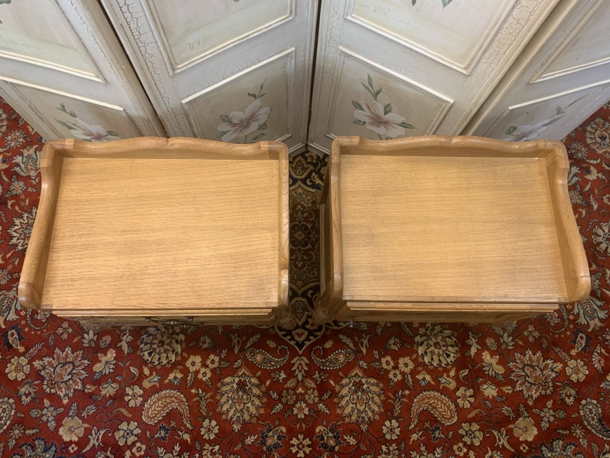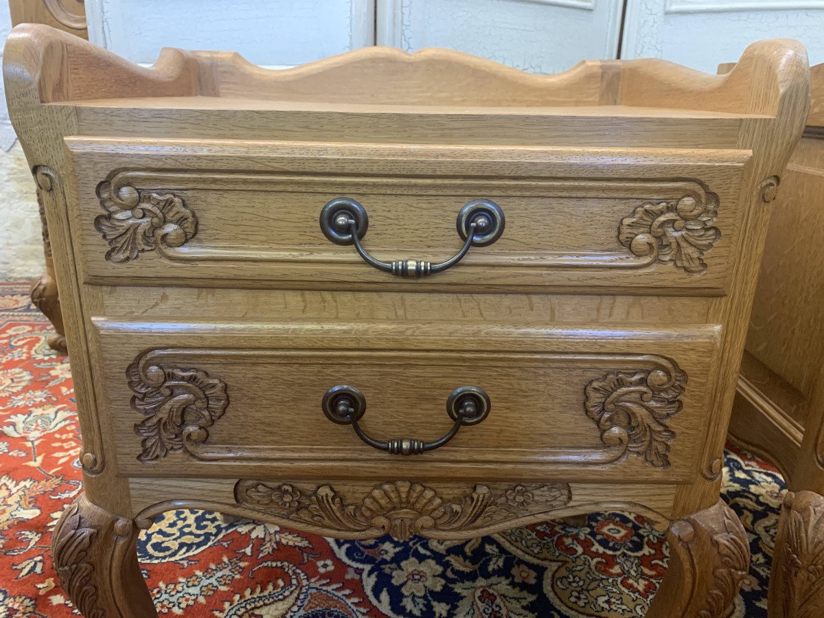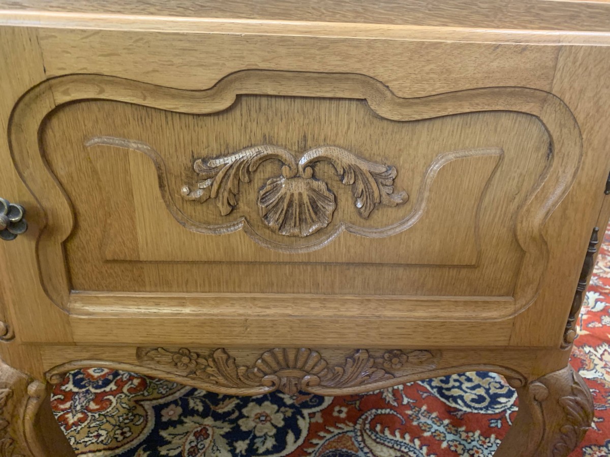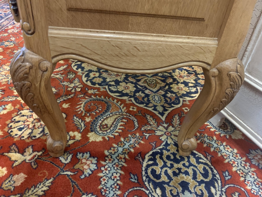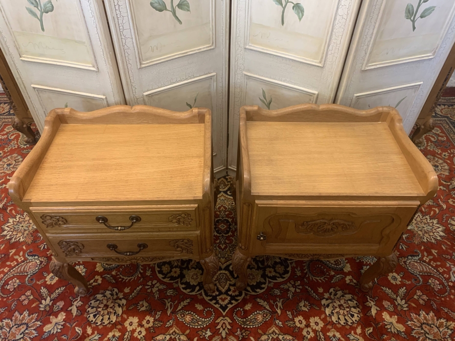 Each French cabinet has a raised shaped back and sides. One Cabinet has two carved recessed panelled drawers, each drawer with a drop handle, shaped skirt with central carvings and standson four carved cabriole shaped legs. The other cabinet has a carved recessed panelled cupboard door, shaped skirt with central carving and stands on four carved cabriole shaped legs.