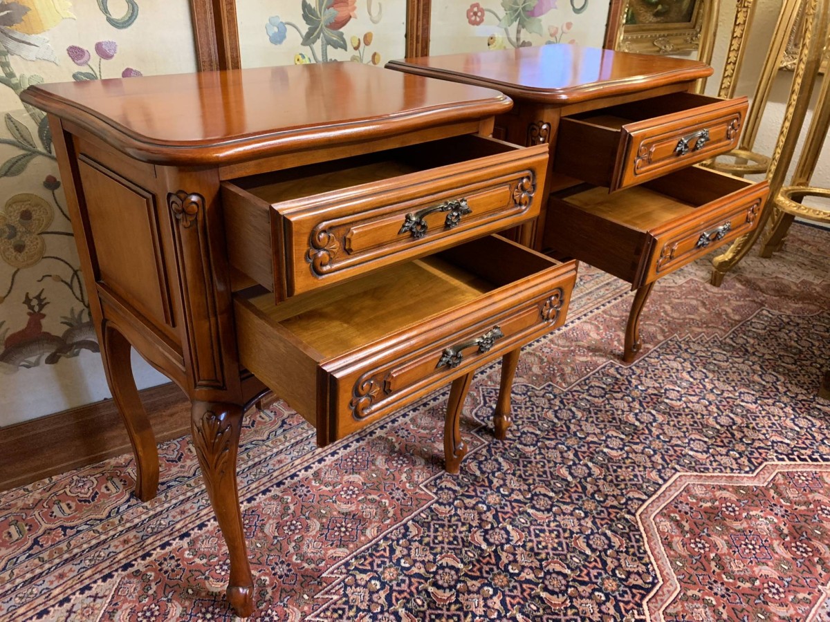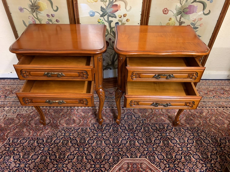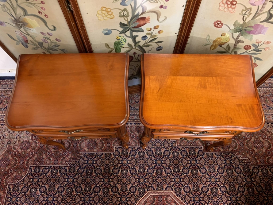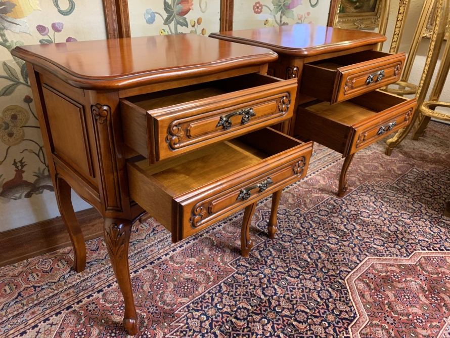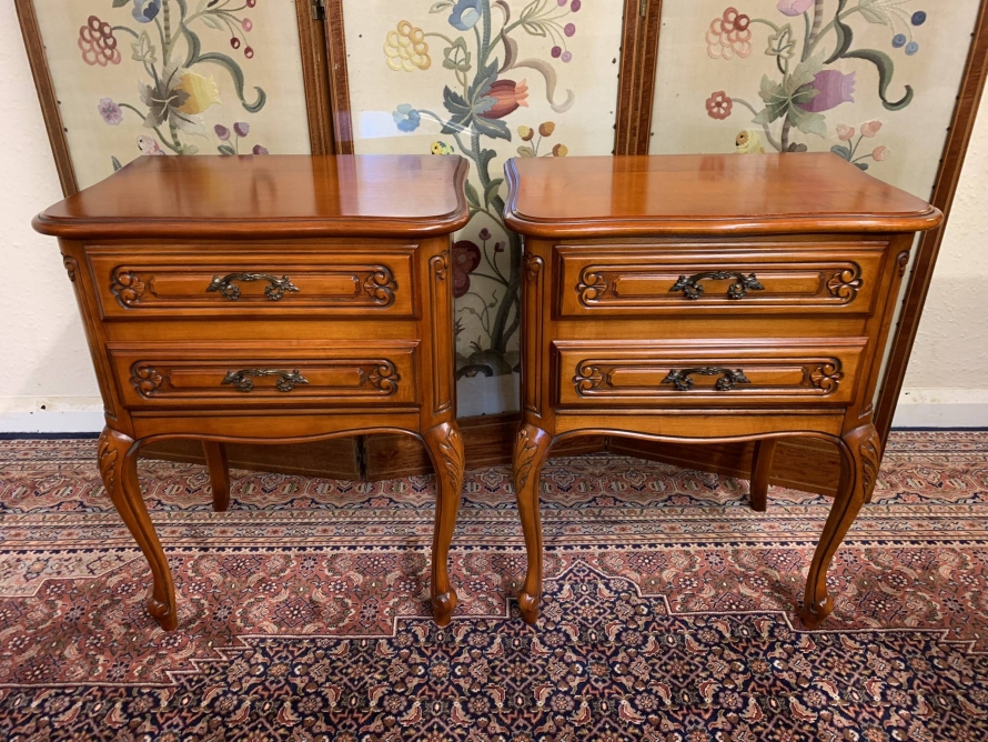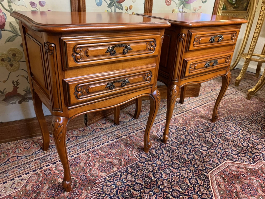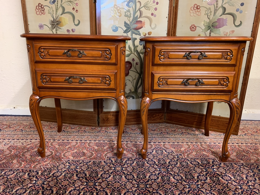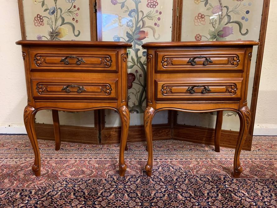 The shaped oversailing top sits above a pair of carved drawers, each drawer having an ornate brass handle. Panelled sides, shaped skirt, this fabulous pair of French bedside drawers stand on four cabriole shaped legs, the front pair of legs have decorative carving.