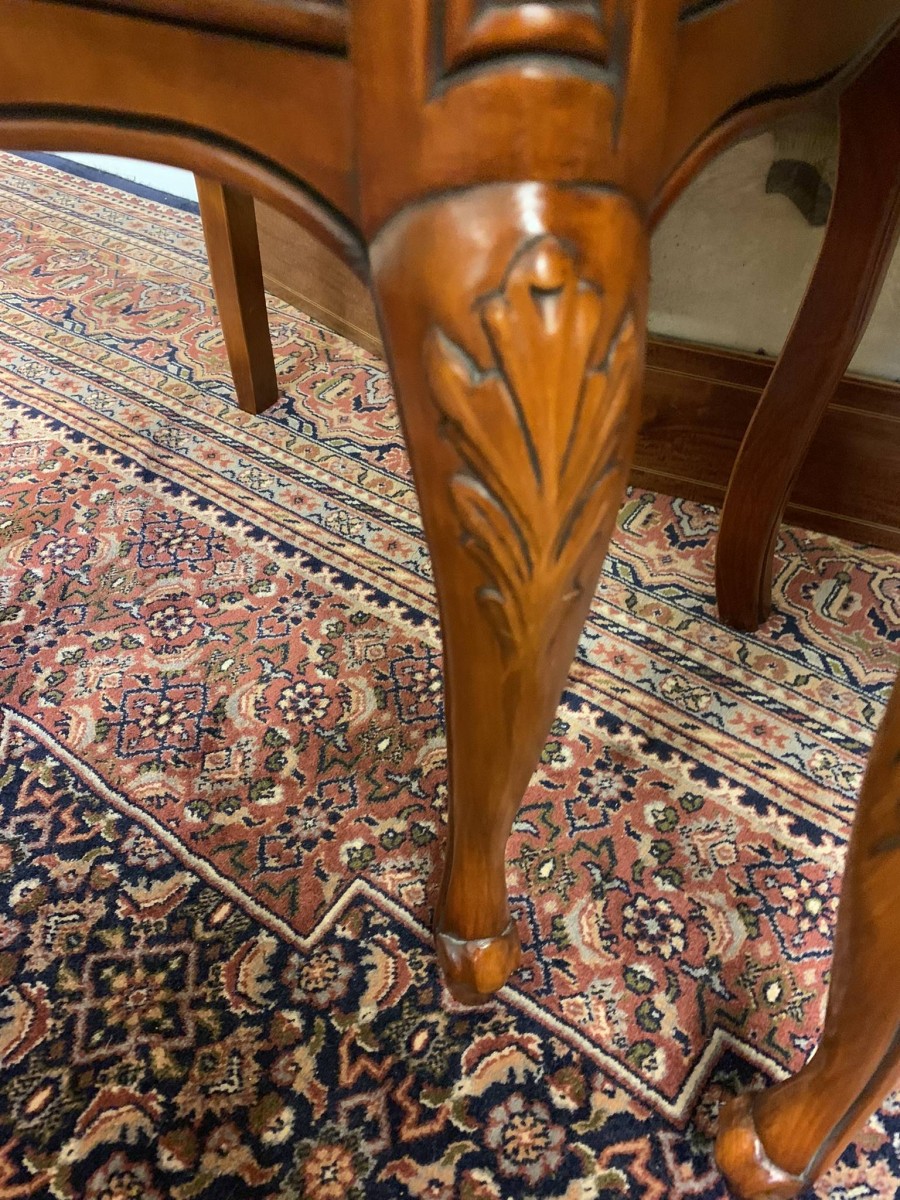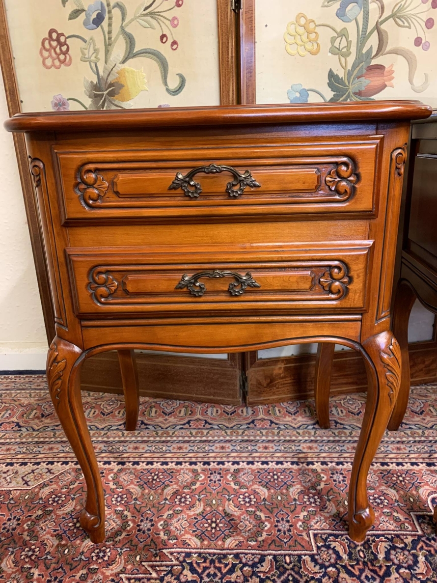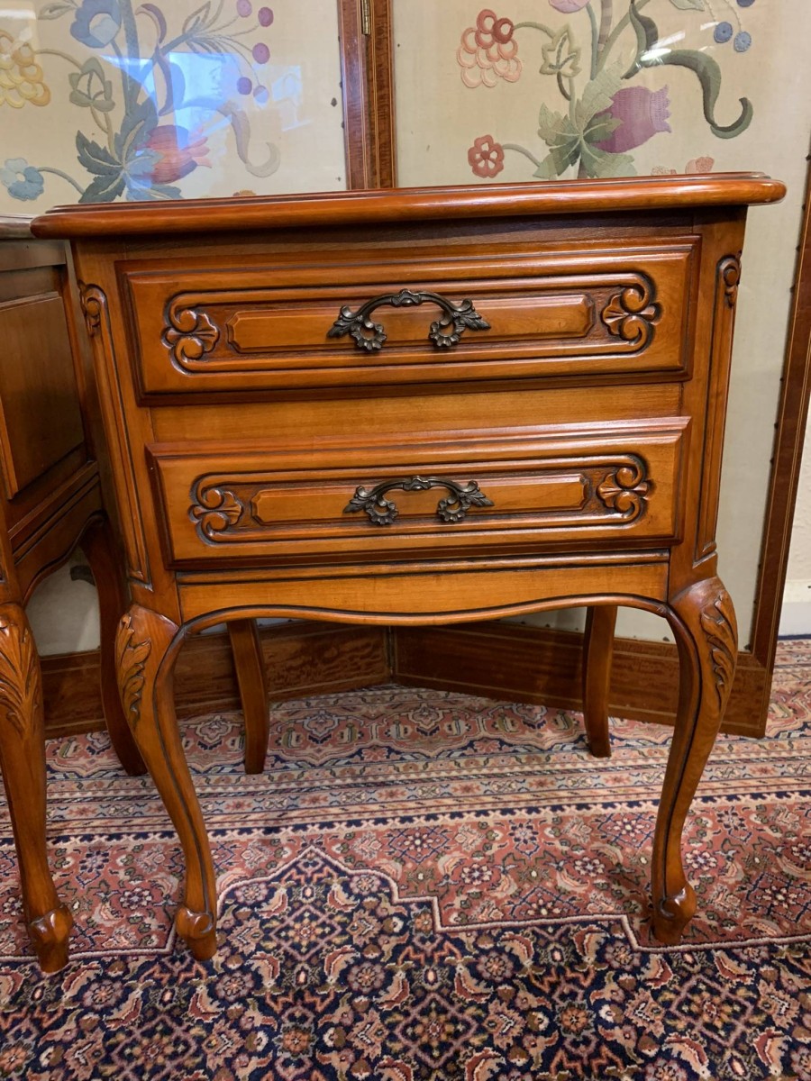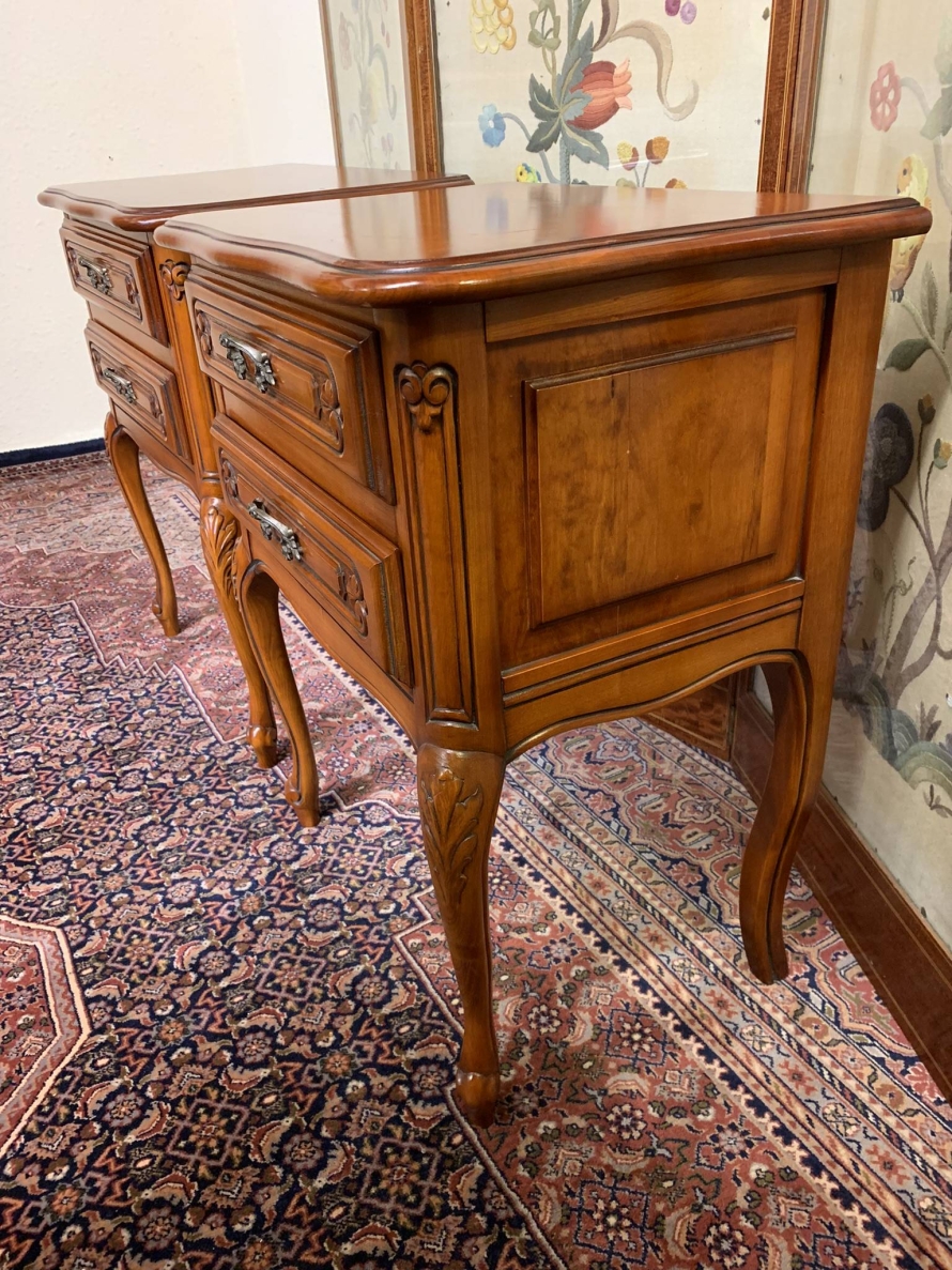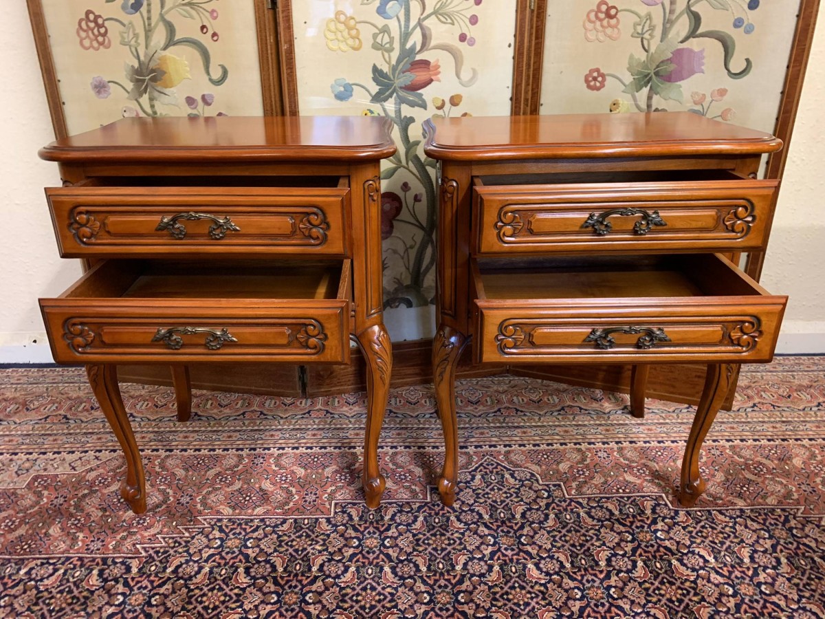 The shaped oversailing top sits above a pair of carved drawers, each drawer having an ornate brass handle. Panelled sides, shaped skirt, this fabulous pair of French bedside drawers stand on four cabriole shaped legs, the front pair of legs have decorative carving.