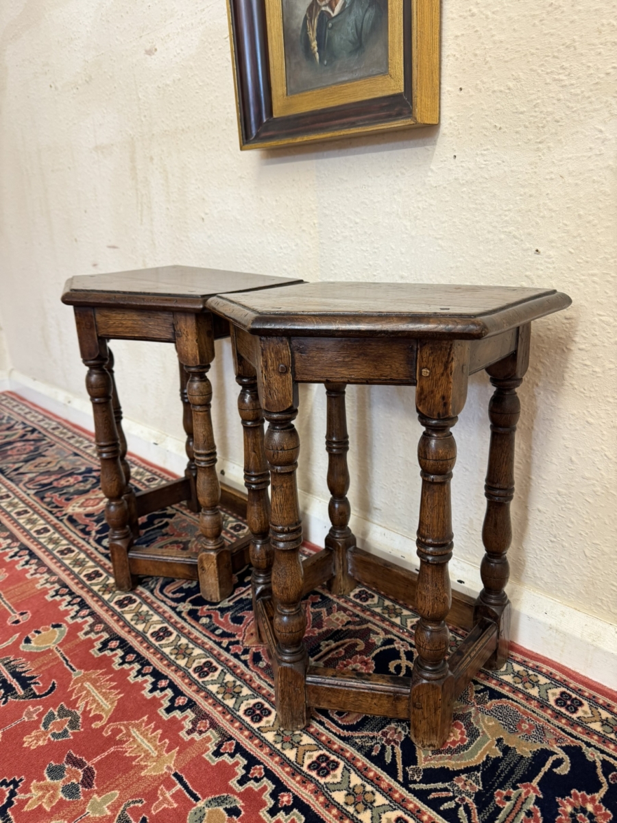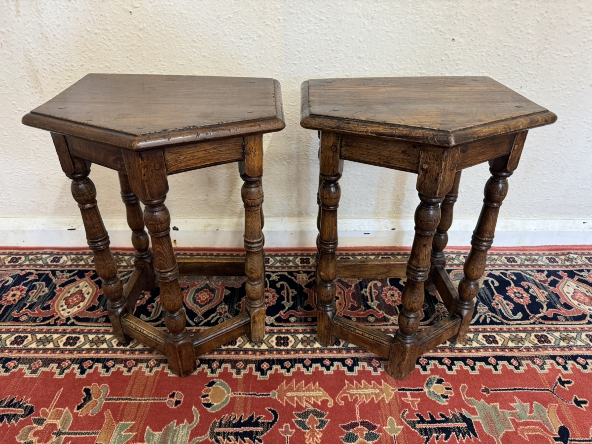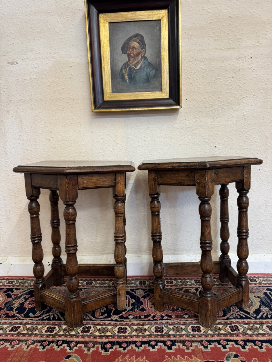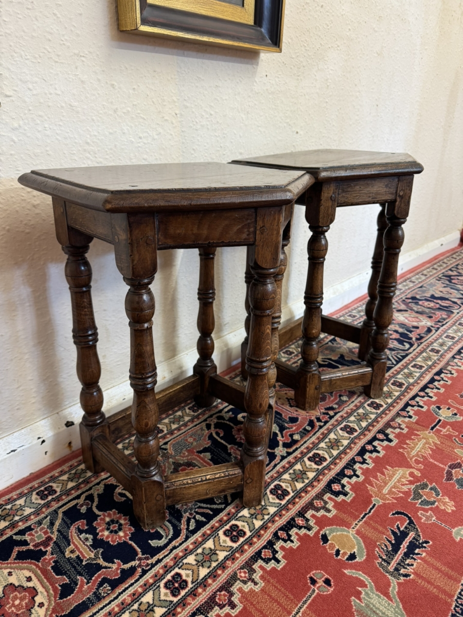 This super pair of accent tables are made entirely in solid oak and are pegged jointed through out. The top sits above five elegant turned legs, stretcher supports and standing on traditional block feet.