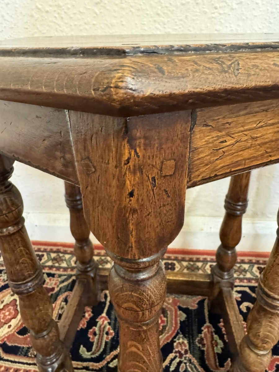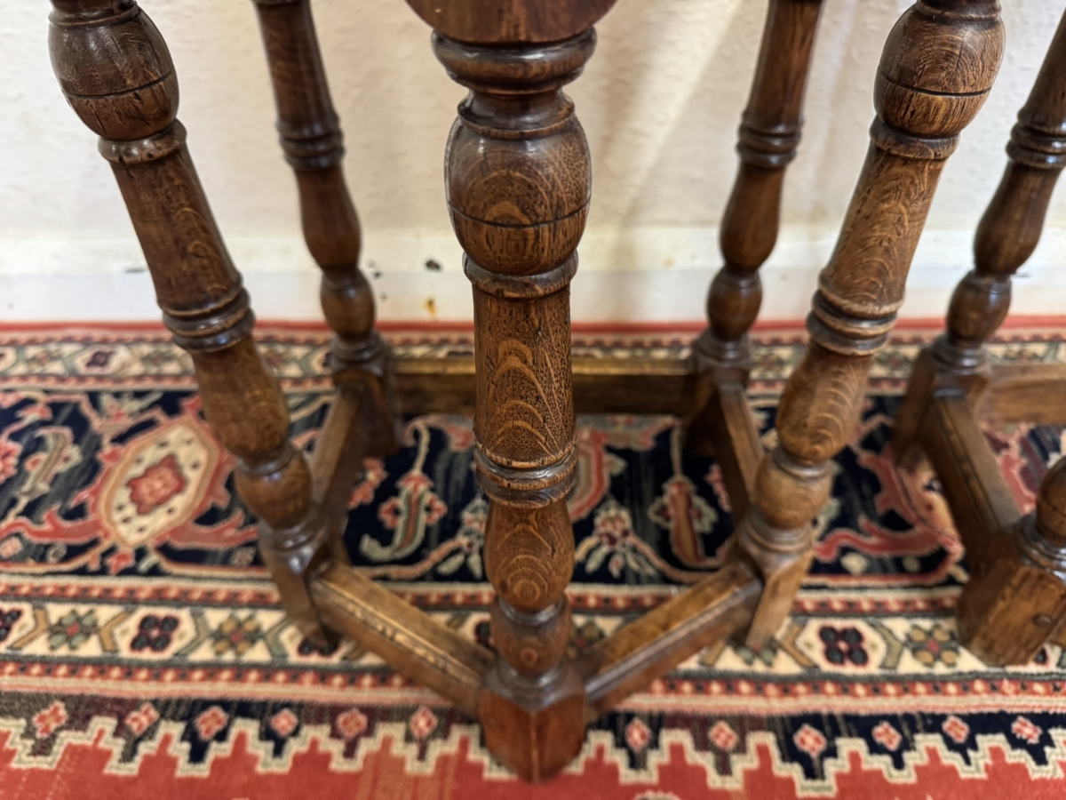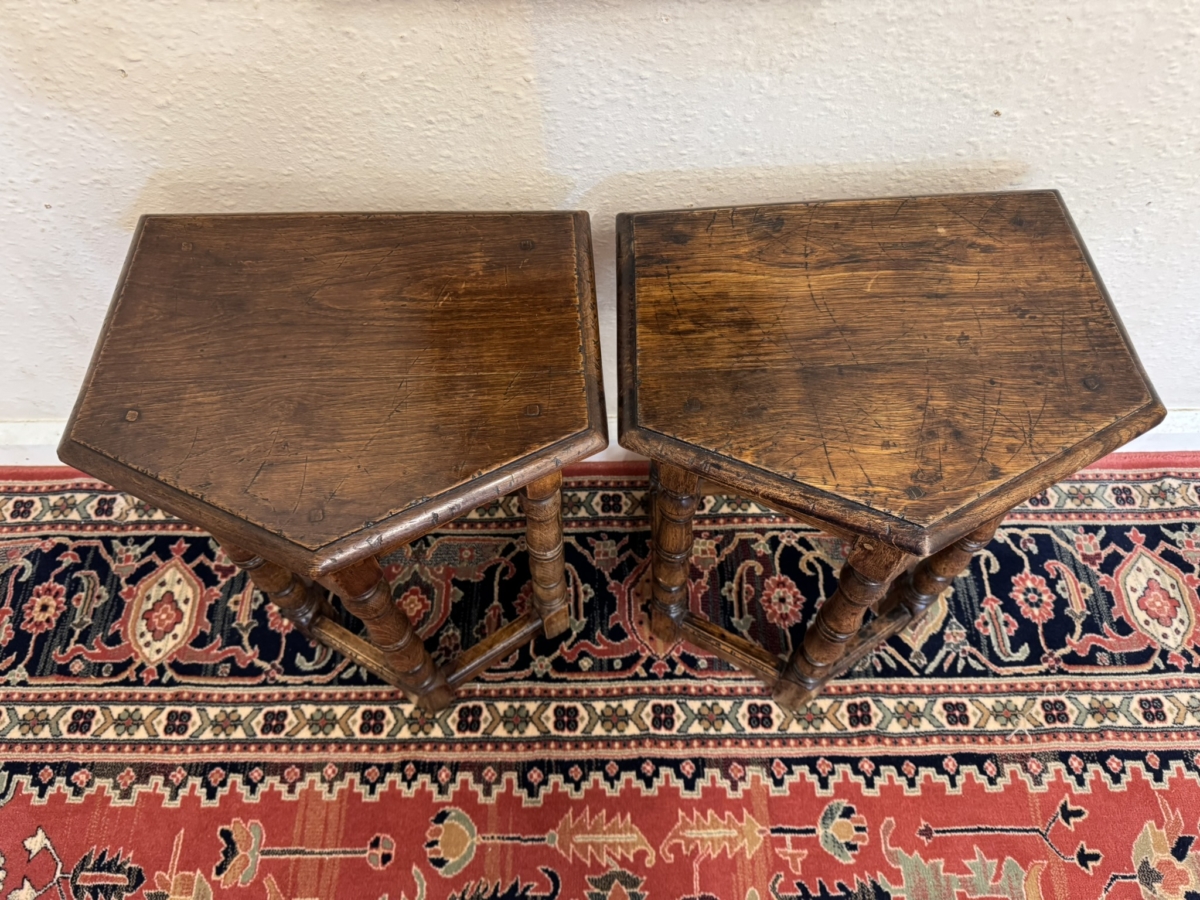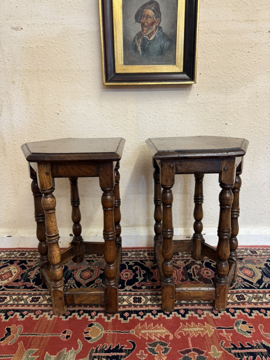 This super pair of accent tables are made entirely in solid oak and are pegged jointed through out. The top sits above five elegant turned legs, stretcher supports and standing on traditional block feet.