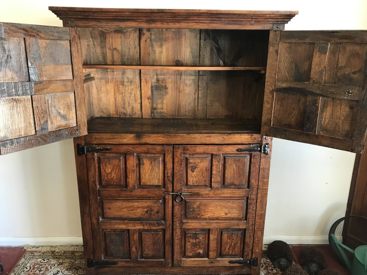 A great oak cabinet made in the primitive rustic style. To the top are two doors each door having recessed oak panels, two primitive hinges,metal latch and oak pegging.The doors open to reveal a shelf below a pair of larger cupboard doors each door having four oak recessed panels which sit either side of a larger shelf, primitive style hinges metal latch and oak pegging throughout.The doors open to reveal a fixed shelf which sits above a removable shelf. The sides also have recessed panels. A fantastic cupboard which offers ample storage and is also very stylish.