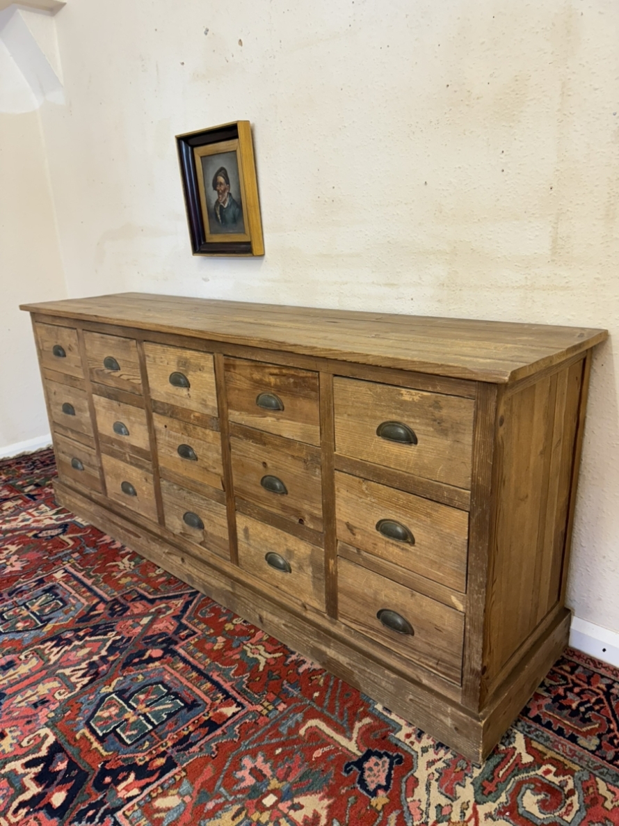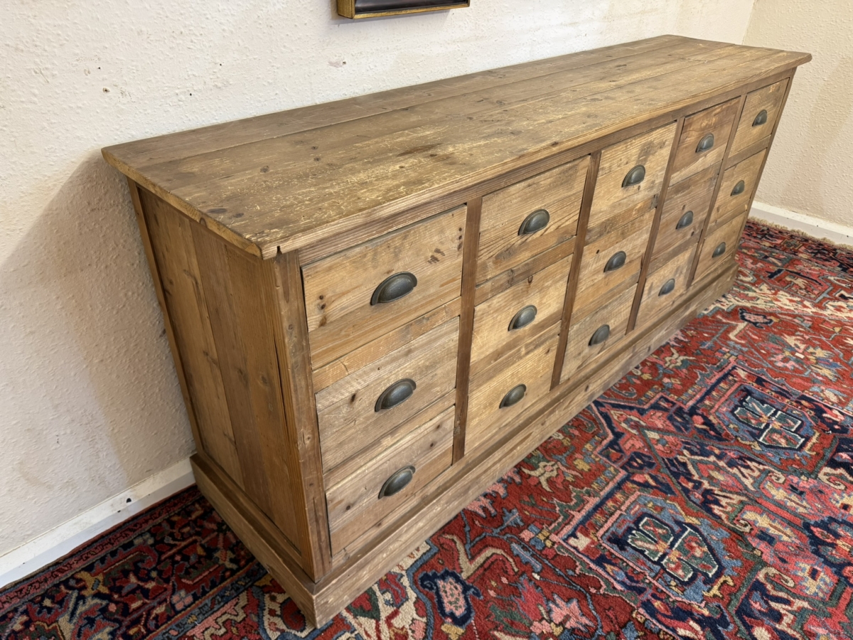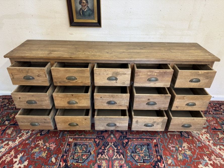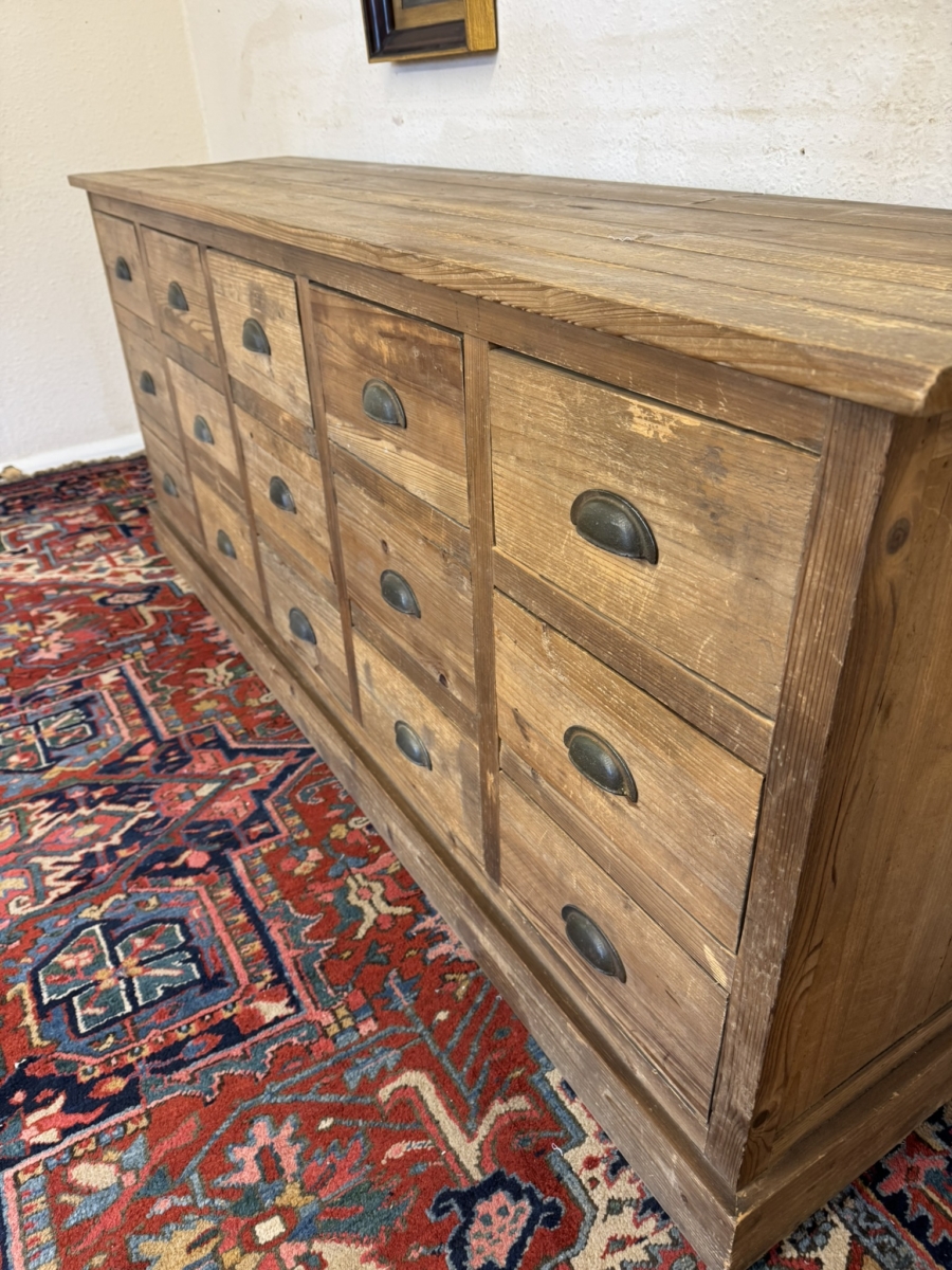 This funky set of drawers offers fabulous storage. The planked top sits above fifteen drawers, each drawer having a cup handle. This superb chest has a platform plinth base.