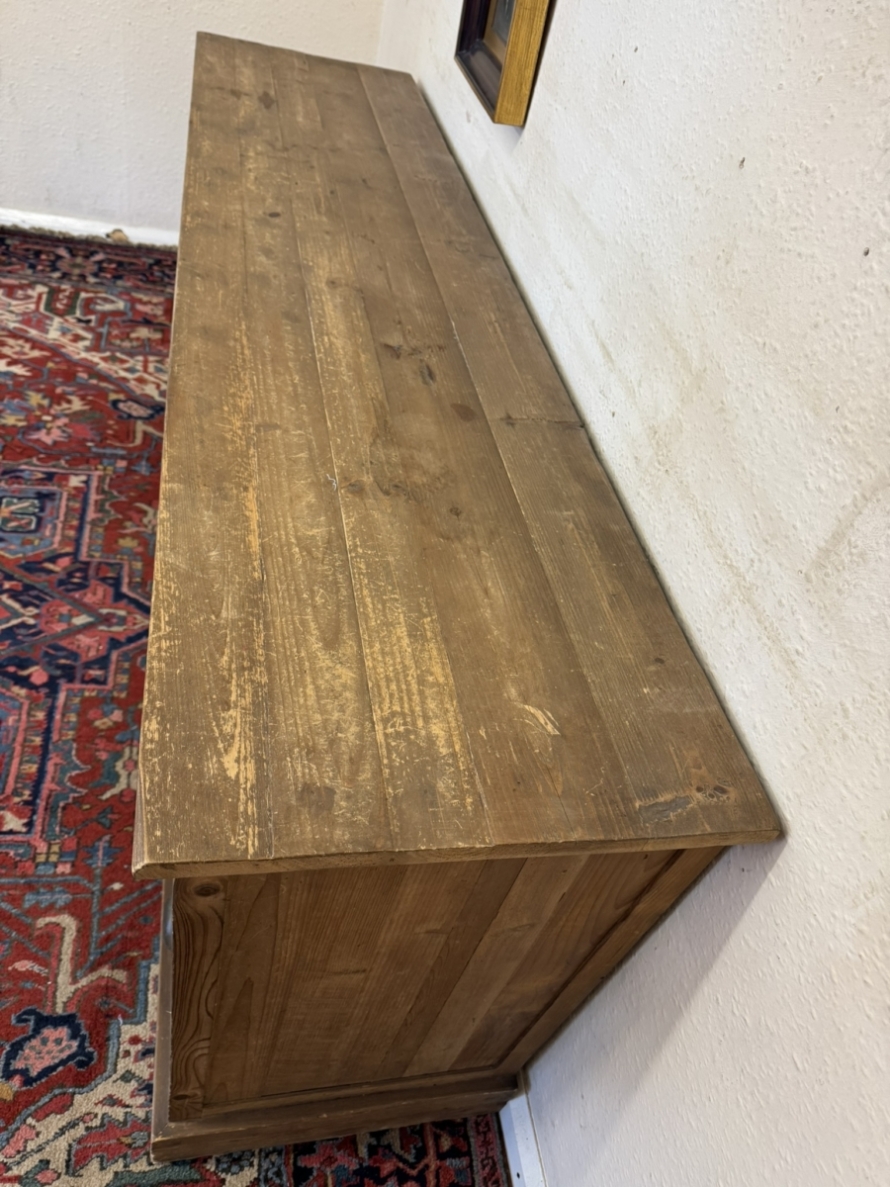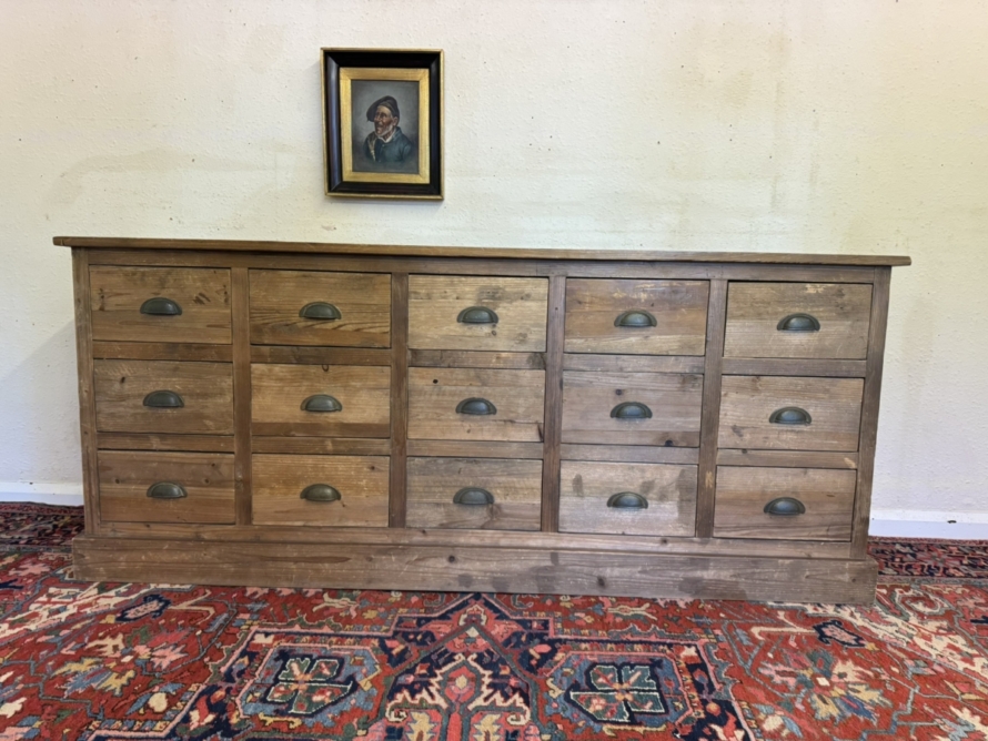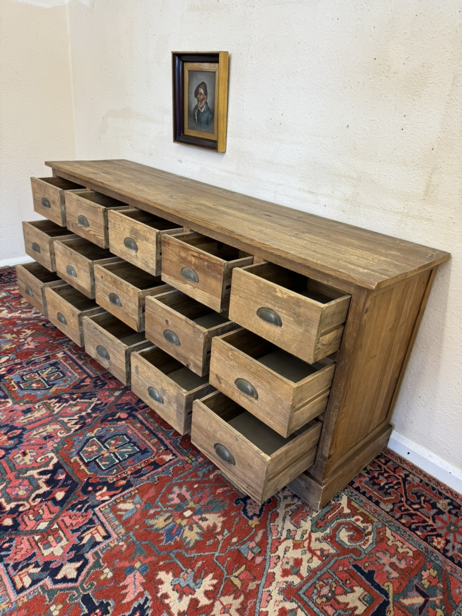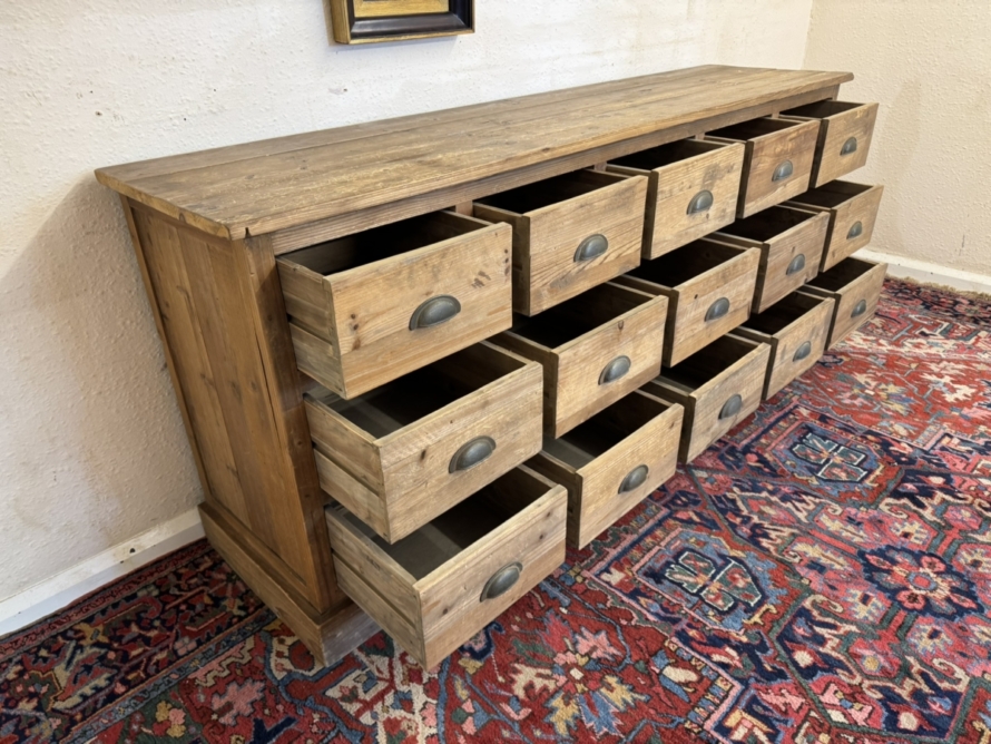 This funky set of drawers offers fabulous storage. The planked top sits above fifteen drawers, each drawer having a cup handle. This superb chest has a platform plinth base.