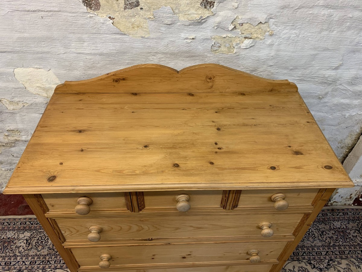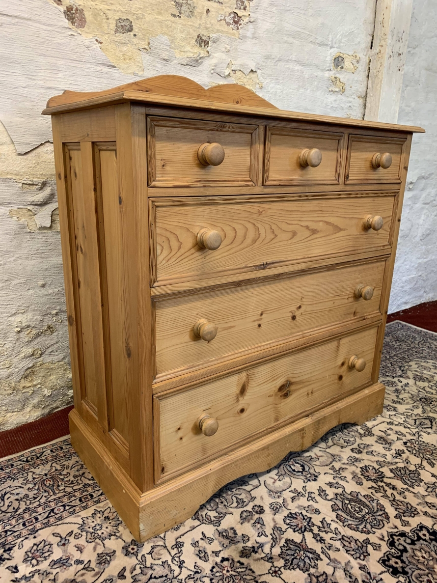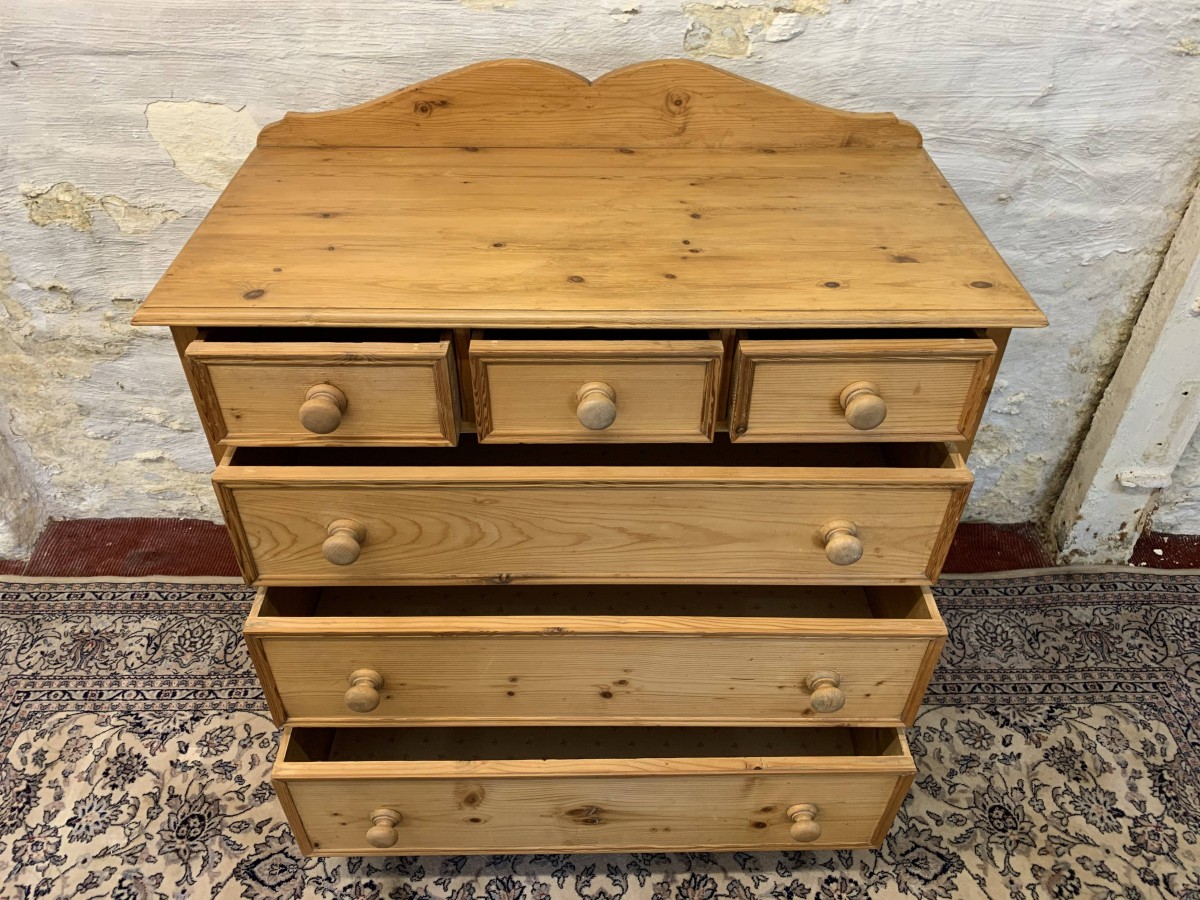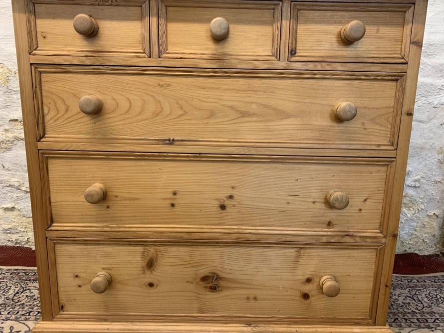 This super pine chest is in fabulous condition. The oversailing top has a shaped back stand. Below are three small drawers, each drawer having turned handle. Below these three small drawers are three long drawers, each of the long drawers has a pair of turned handles. Recessed panelled sides, shaped skirt and standing on bracket feet.