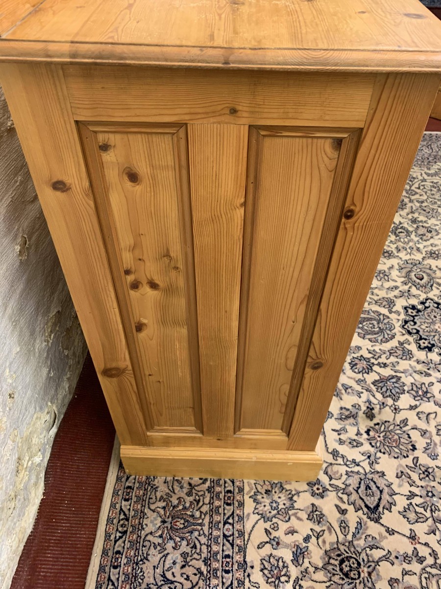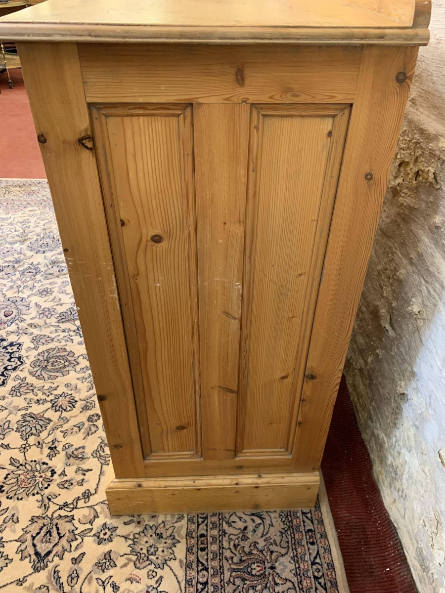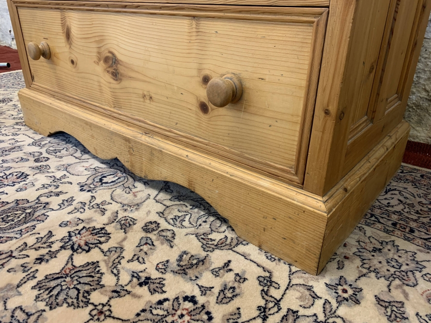 This super pine chest is in fabulous condition. The oversailing top has a shaped back stand. Below are three small drawers, each drawer having turned handle. Below these three small drawers are three long drawers, each of the long drawers has a pair of turned handles. Recessed panelled sides, shaped skirt and standing on bracket feet.