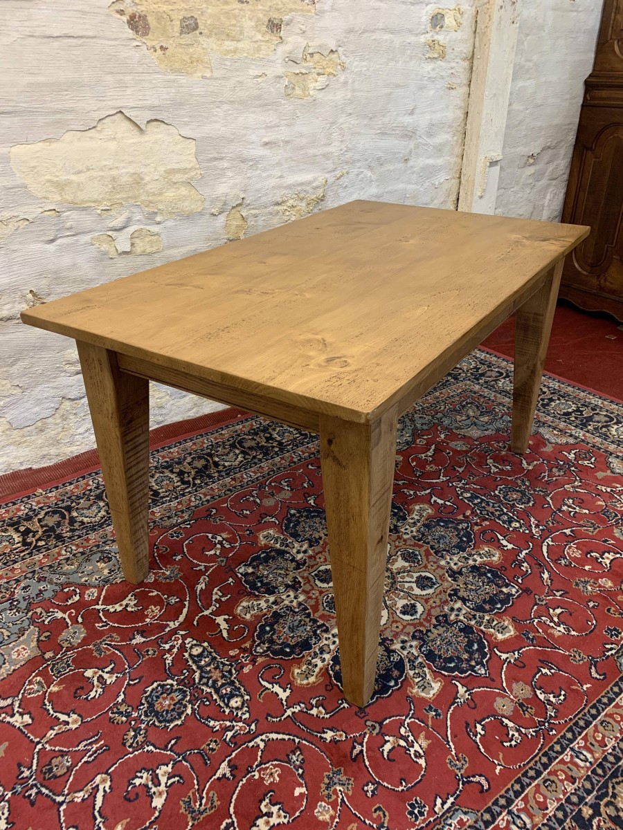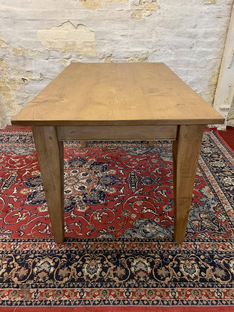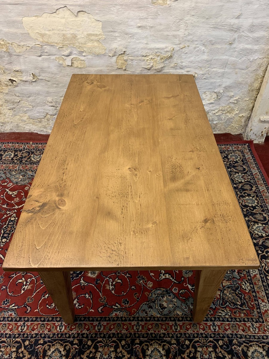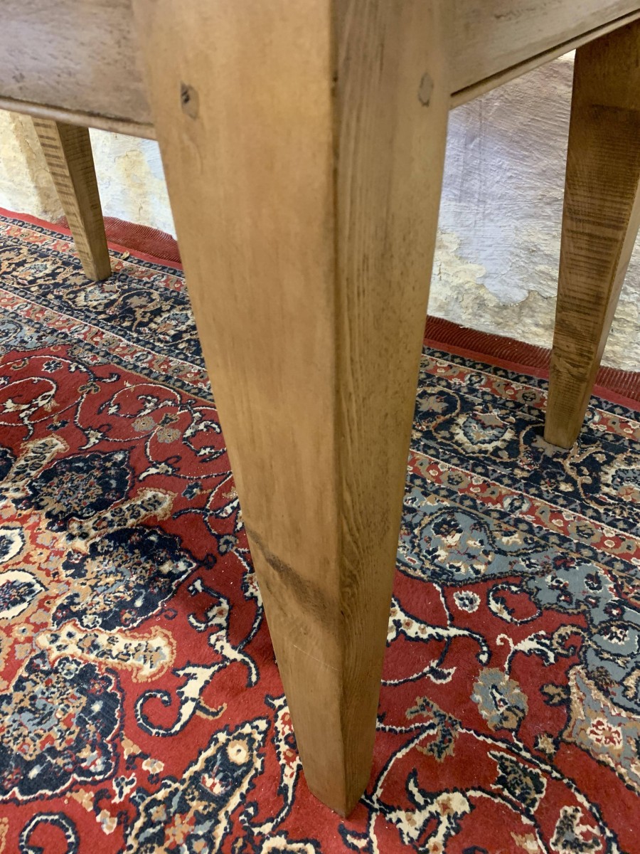 Made in pine this farmhouse table is in excellent condition. The table top looks fabulous with the knots and swirls of the wood being prominent. This top sits on four block tapered legs.