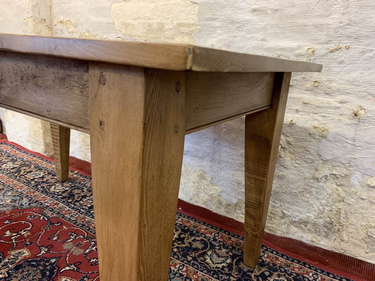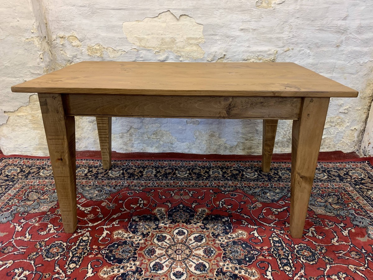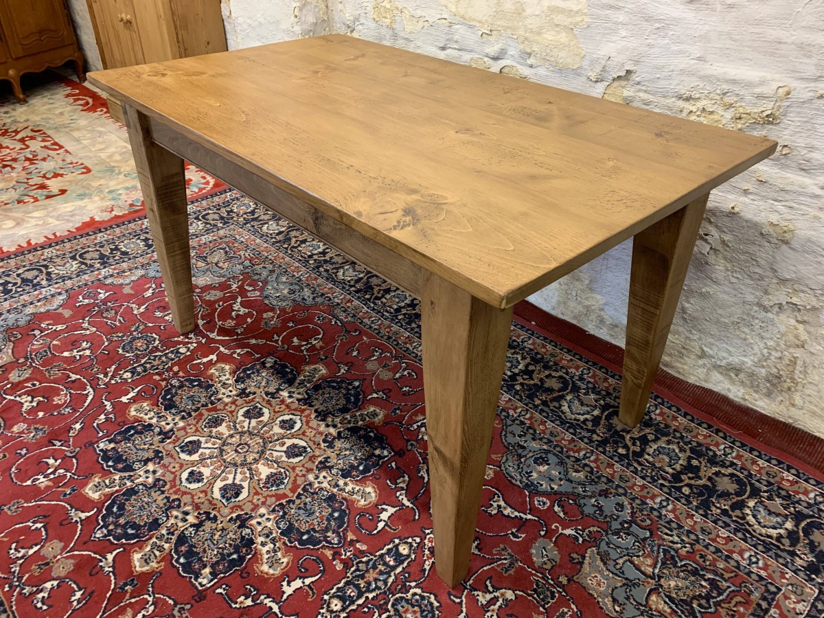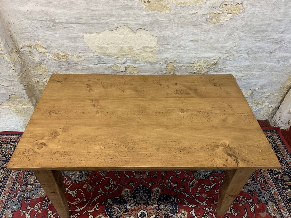 Made in pine this farmhouse table is in excellent condition. The table top looks fabulous with the knots and swirls of the wood being prominent. This top sits on four block tapered legs.