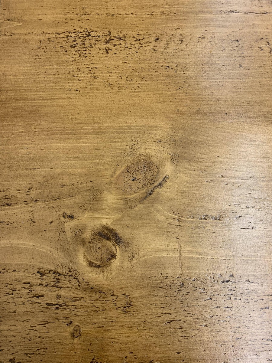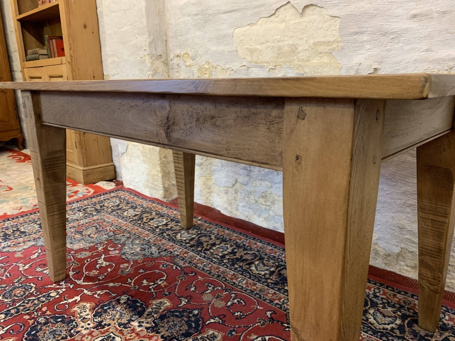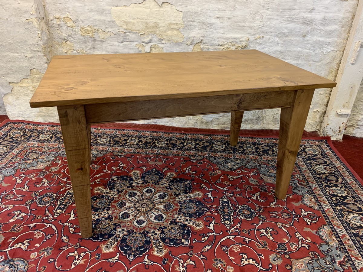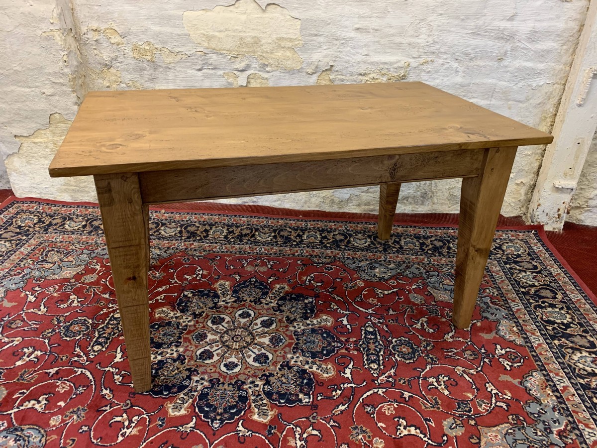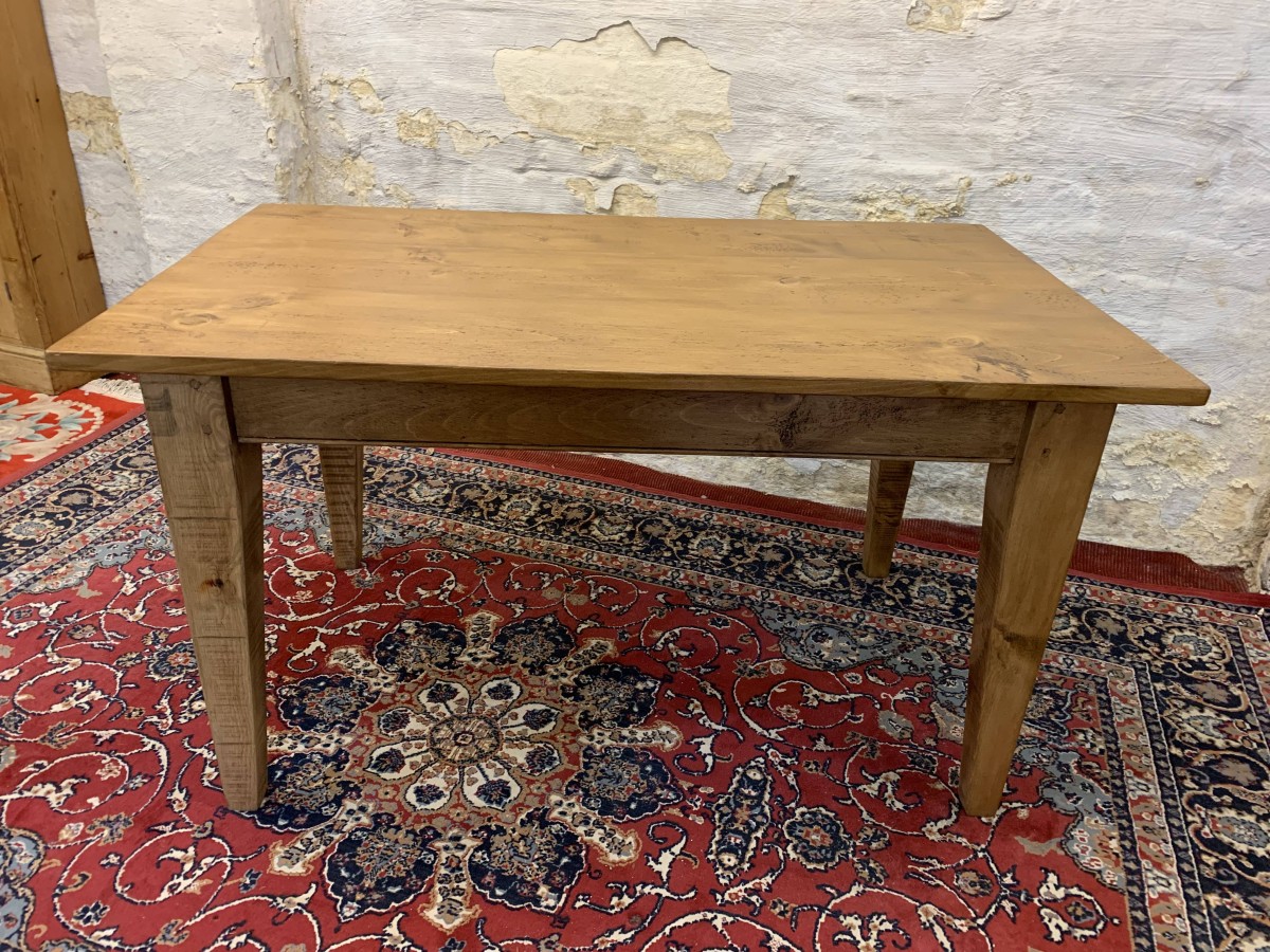 Made in pine this farmhouse table is in excellent condition. The table top looks fabulous with the knots and swirls of the wood being prominent. This top sits on four block tapered legs.