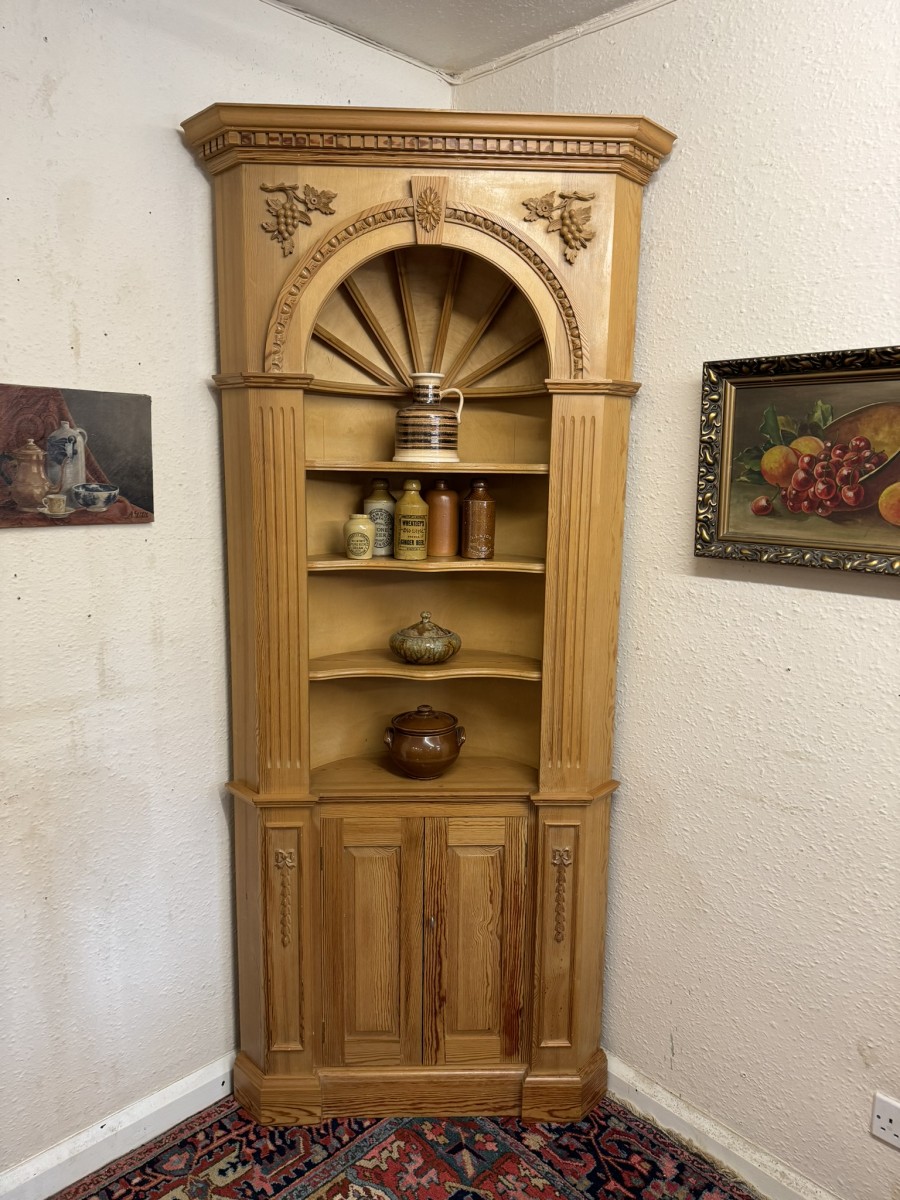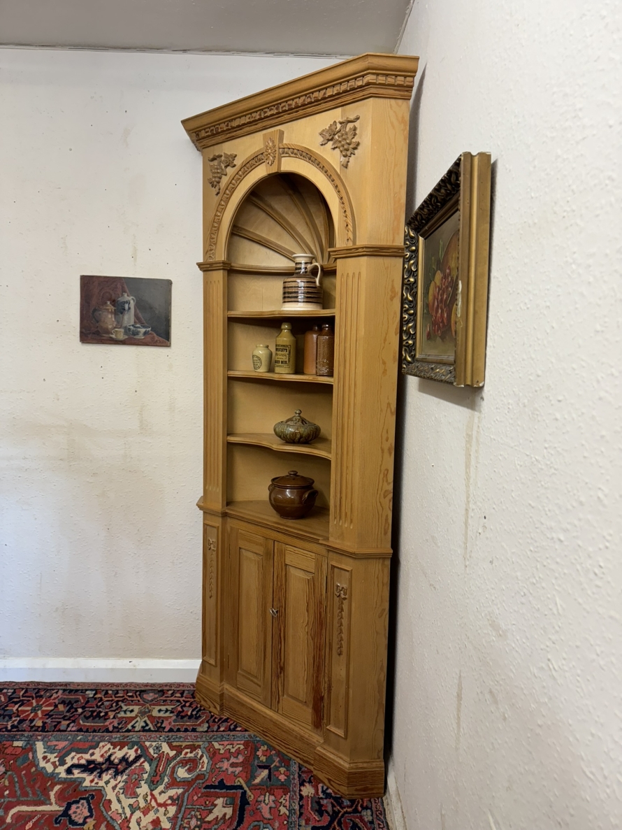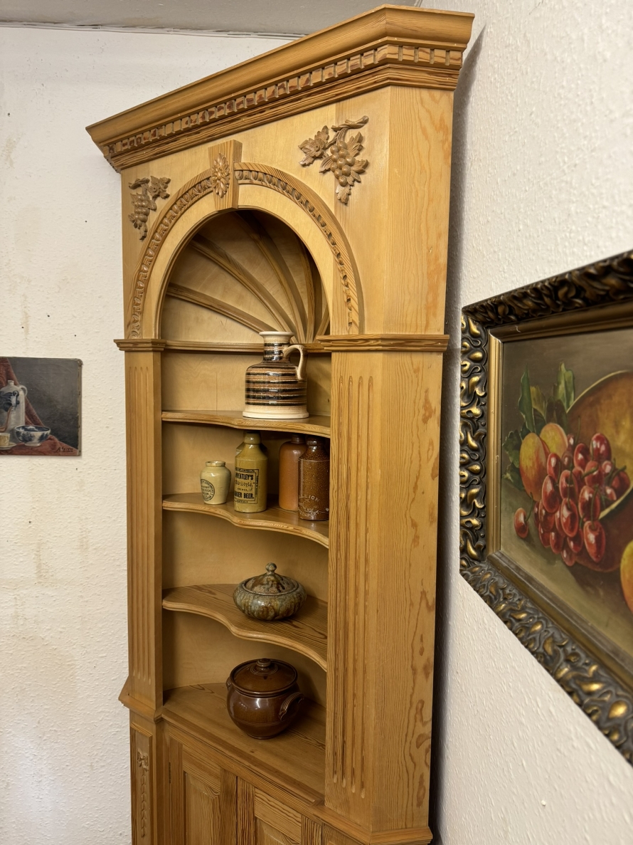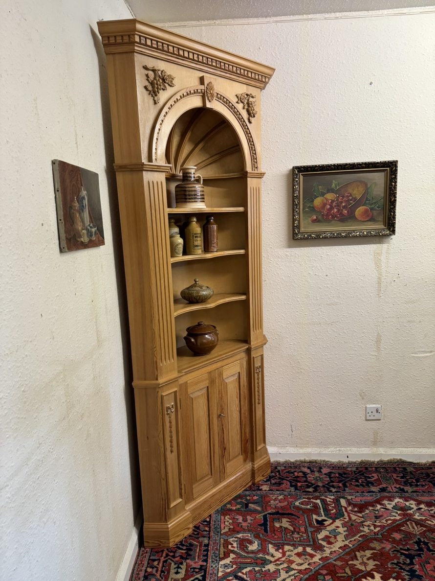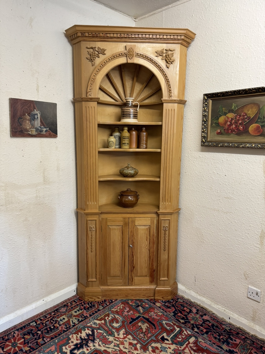 The pine corner cupboard has an arched back, the dental carved oversailing top has carved floral decoration below. The open arched section has three fixed shaped shelves with an architectural design, below are a pair of lockable recessed panelled doors, the doors open to reveal a fixed shelf. Carved decoration to the side of the doors this fabulous cabinet sits on a platform plinth base; fabulous pine corner display with architectural features.