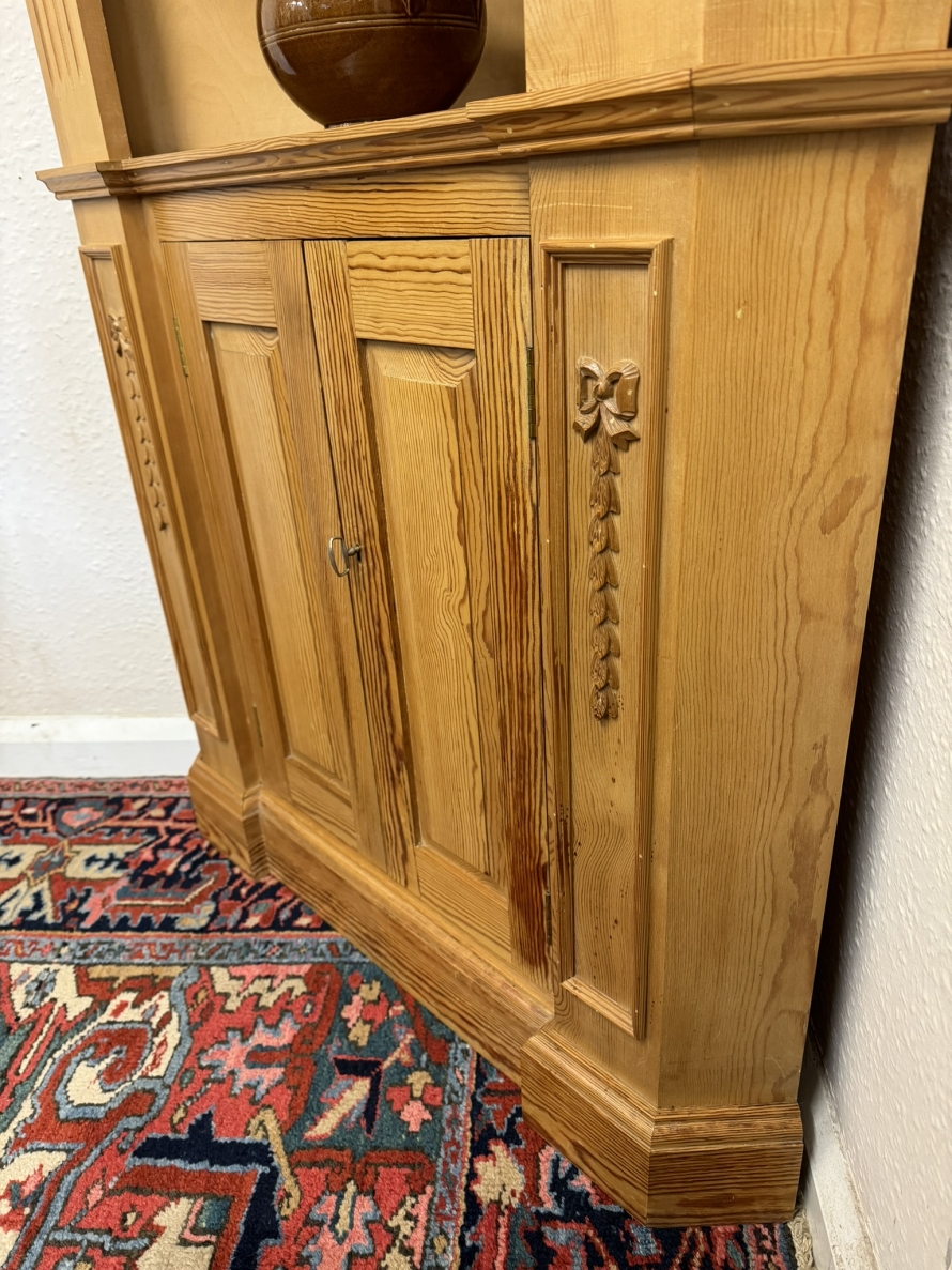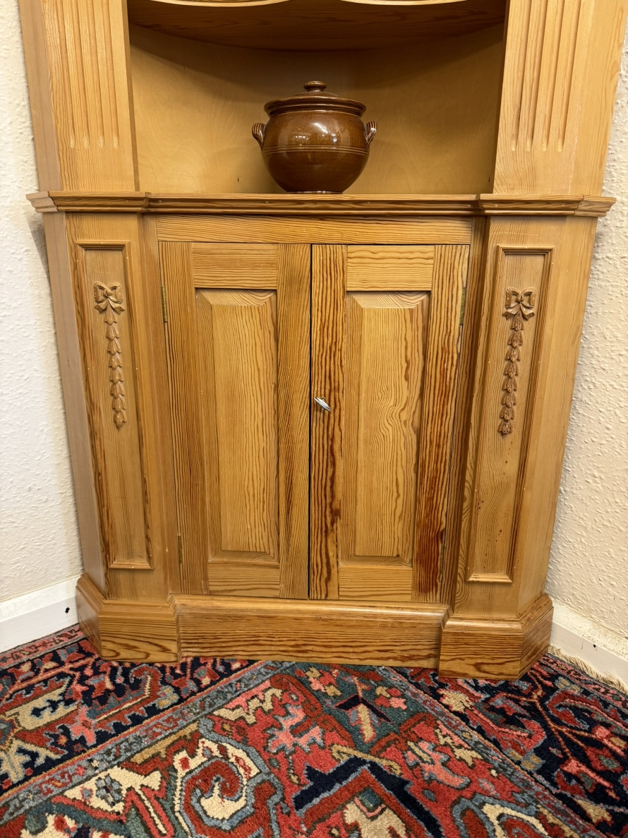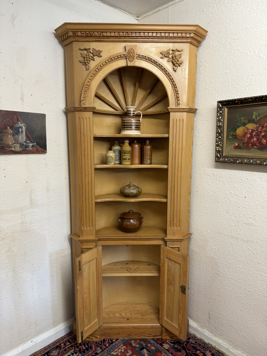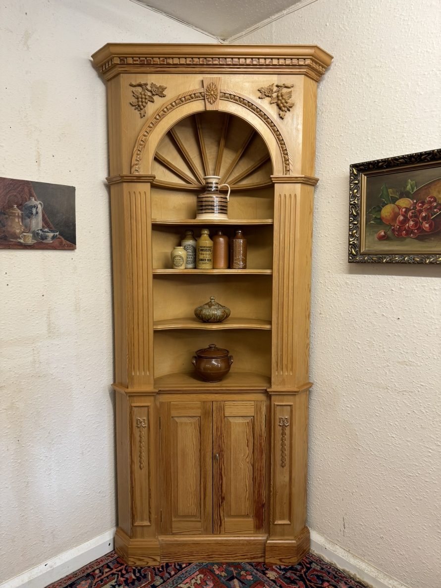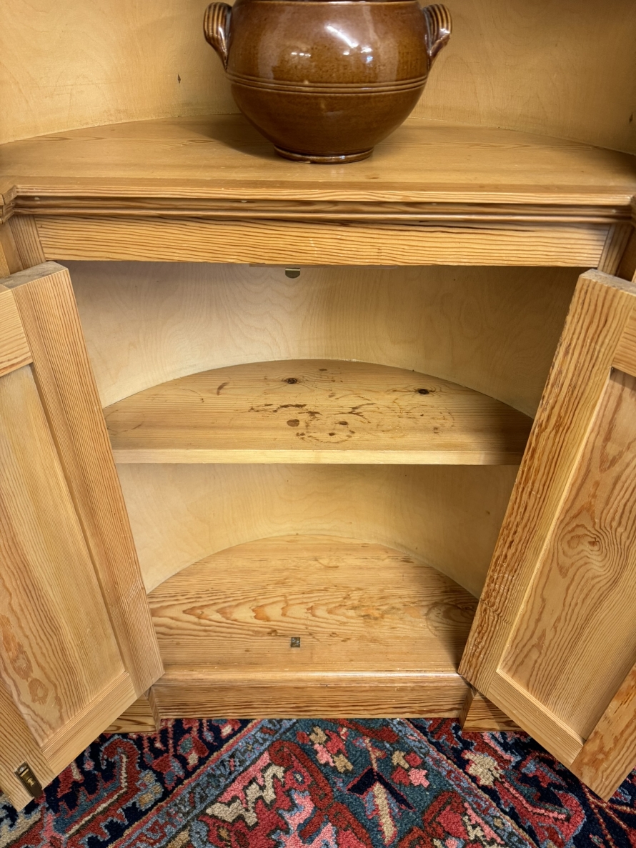 The pine corner cupboard has an arched back, the dental carved oversailing top has carved floral decoration below. The open arched section has three fixed shaped shelves with an architectural design, below are a pair of lockable recessed panelled doors, the doors open to reveal a fixed shelf. Carved decoration to the side of the doors this fabulous cabinet sits on a platform plinth base; fabulous pine corner display with architectural features.