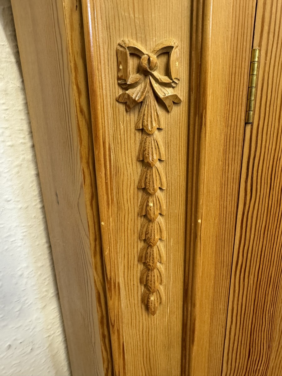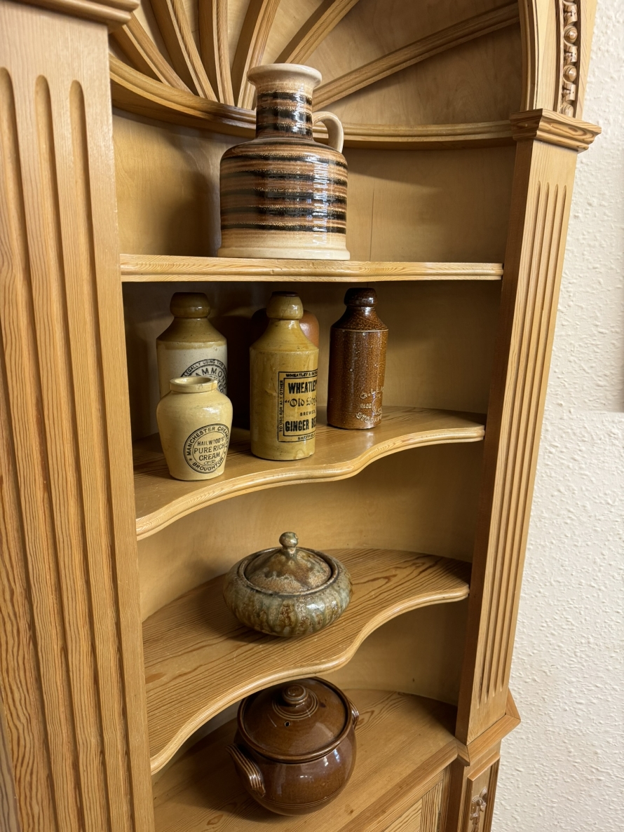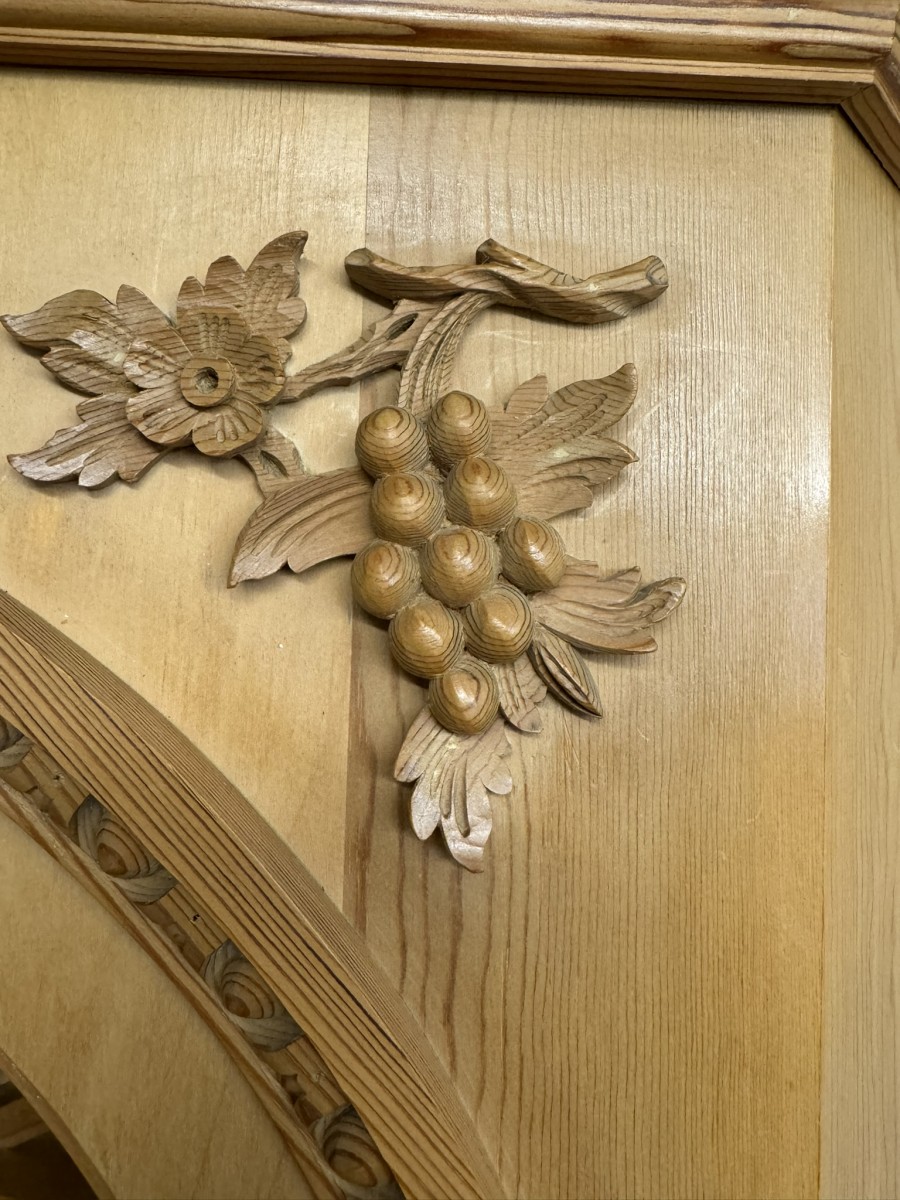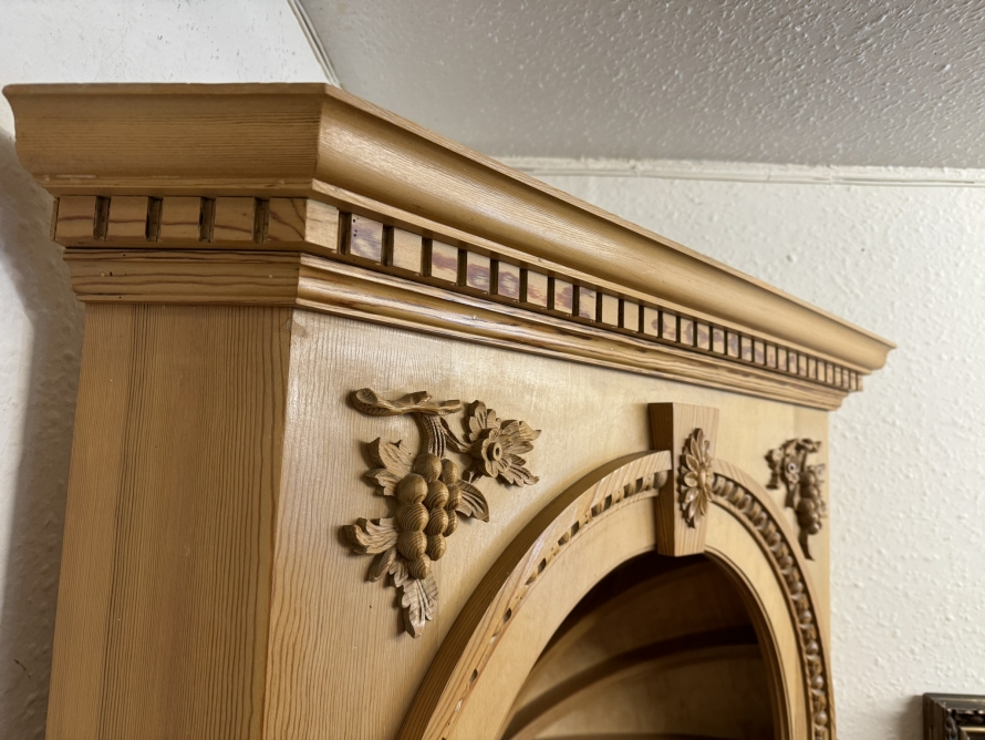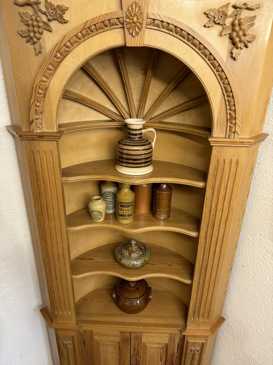 The pine corner cupboard has an arched back, the dental carved oversailing top has carved floral decoration below. The open arched section has three fixed shaped shelves with an architectural design, below are a pair of lockable recessed panelled doors, the doors open to reveal a fixed shelf. Carved decoration to the side of the doors this fabulous cabinet sits on a platform plinth base; fabulous pine corner display with architectural features.