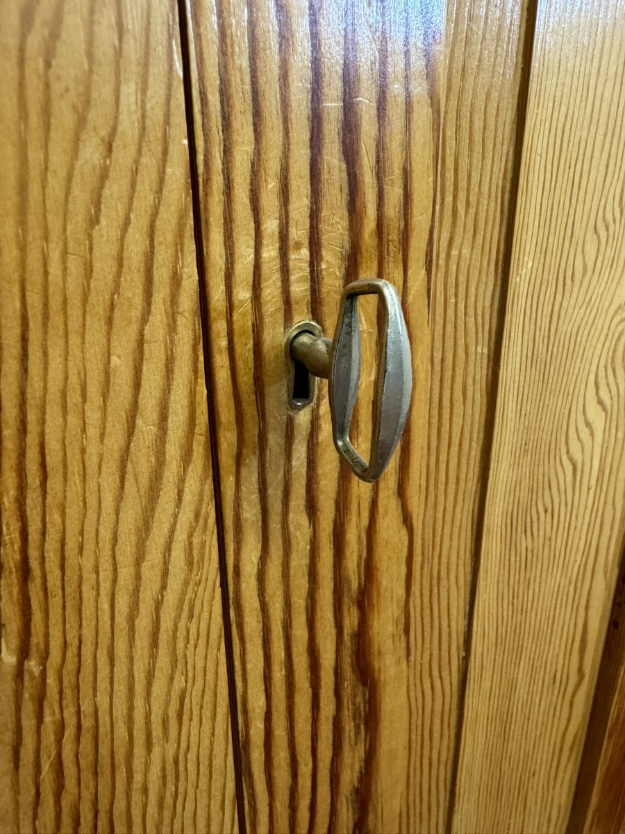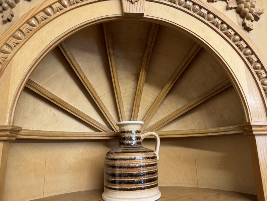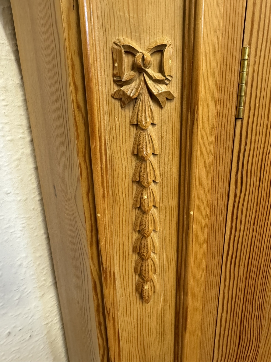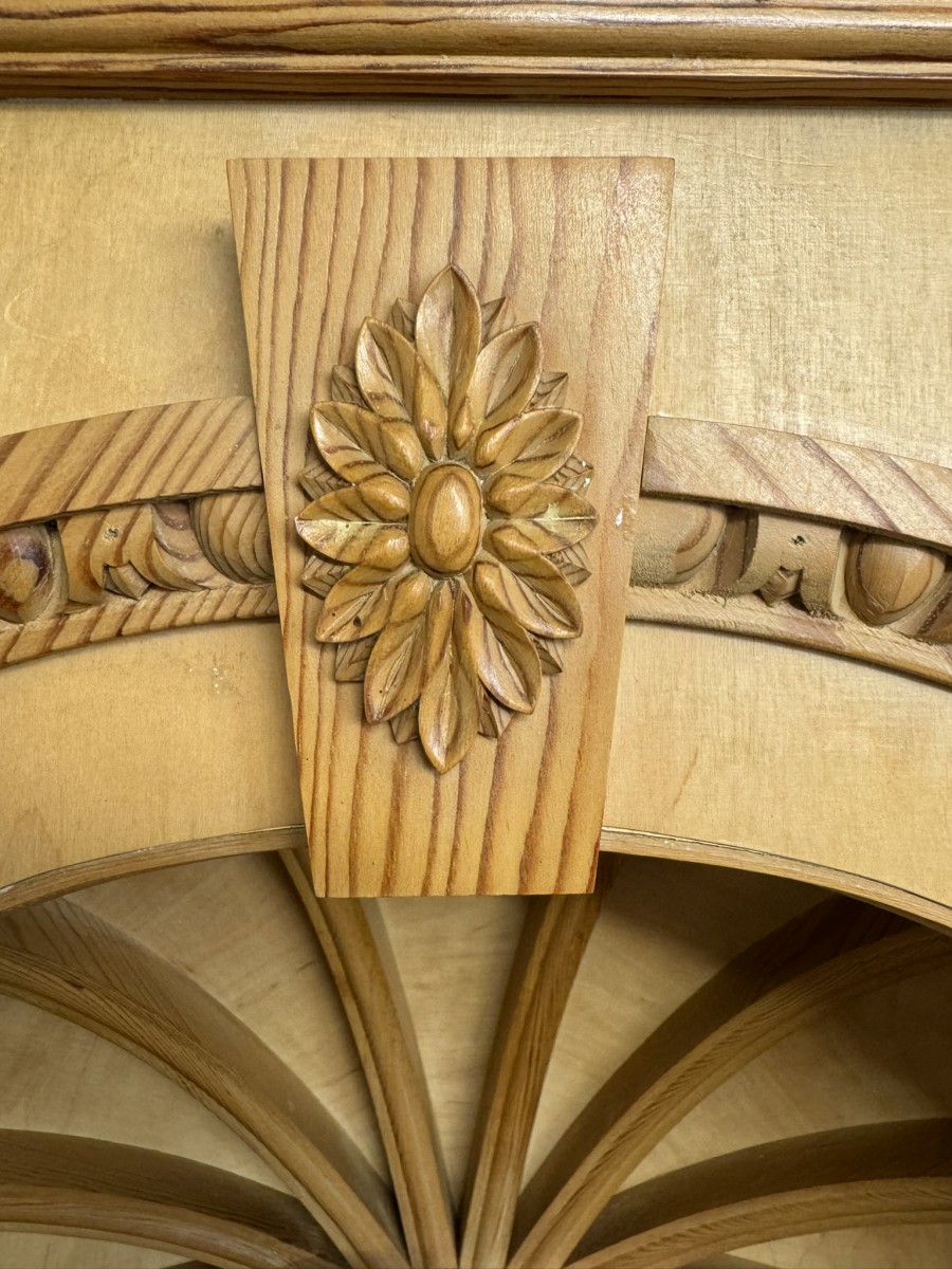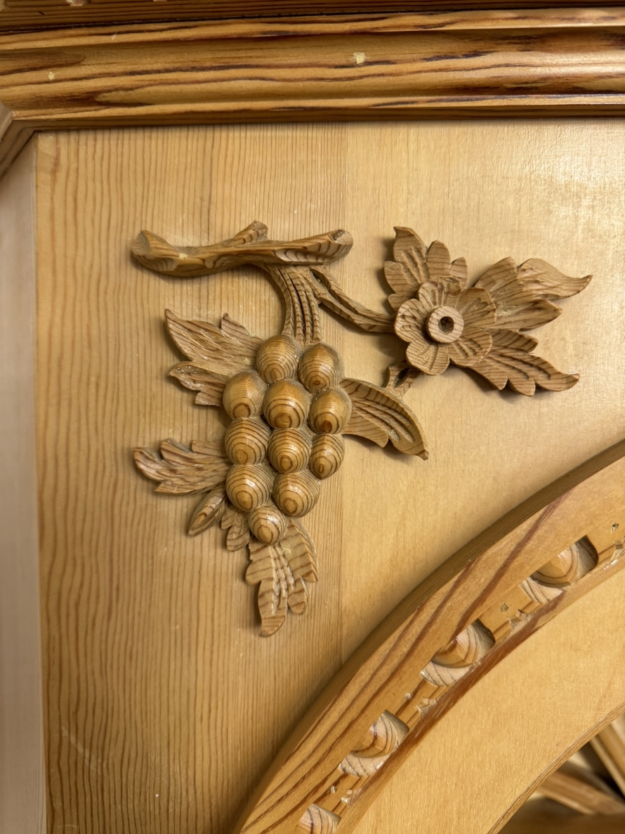 The pine corner cupboard has an arched back, the dental carved oversailing top has carved floral decoration below. The open arched section has three fixed shaped shelves with an architectural design, below are a pair of lockable recessed panelled doors, the doors open to reveal a fixed shelf. Carved decoration to the side of the doors this fabulous cabinet sits on a platform plinth base; fabulous pine corner display with architectural features.