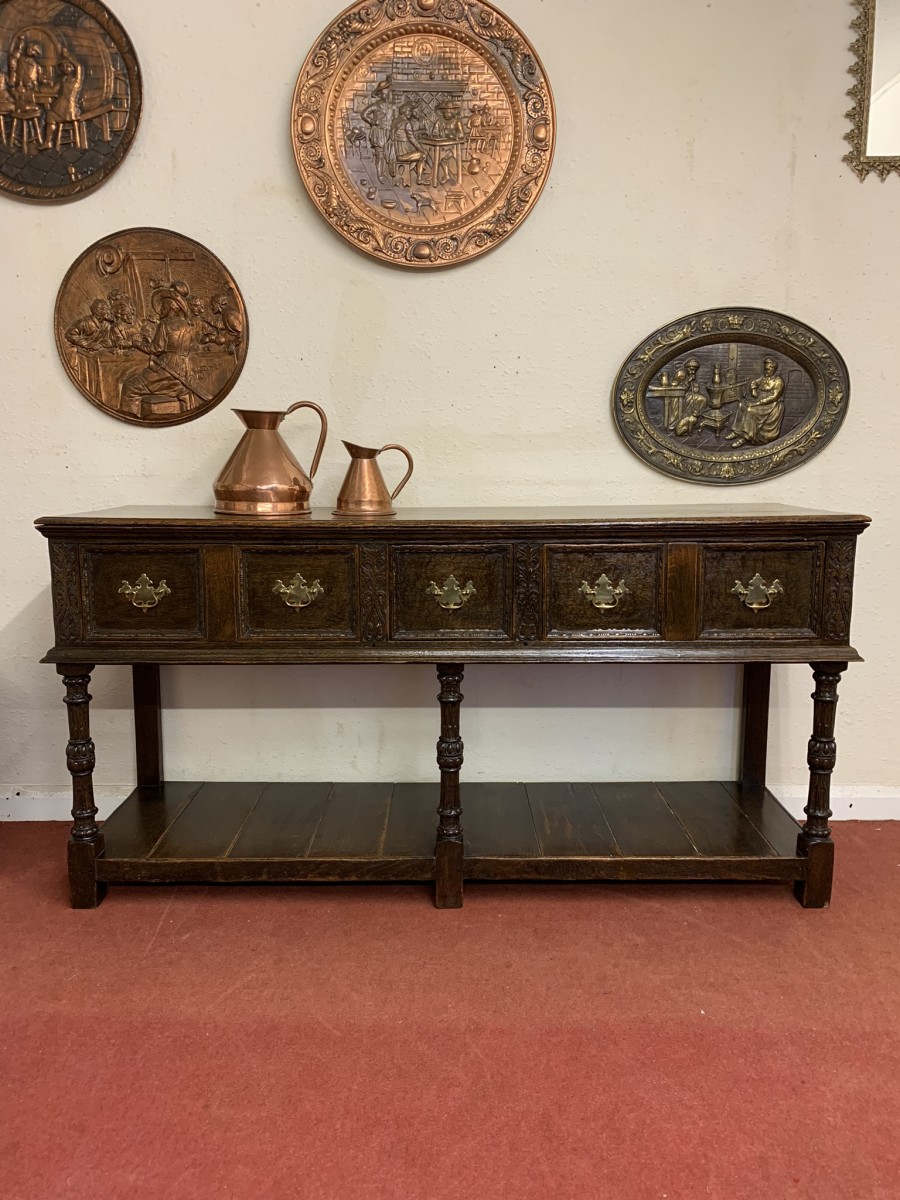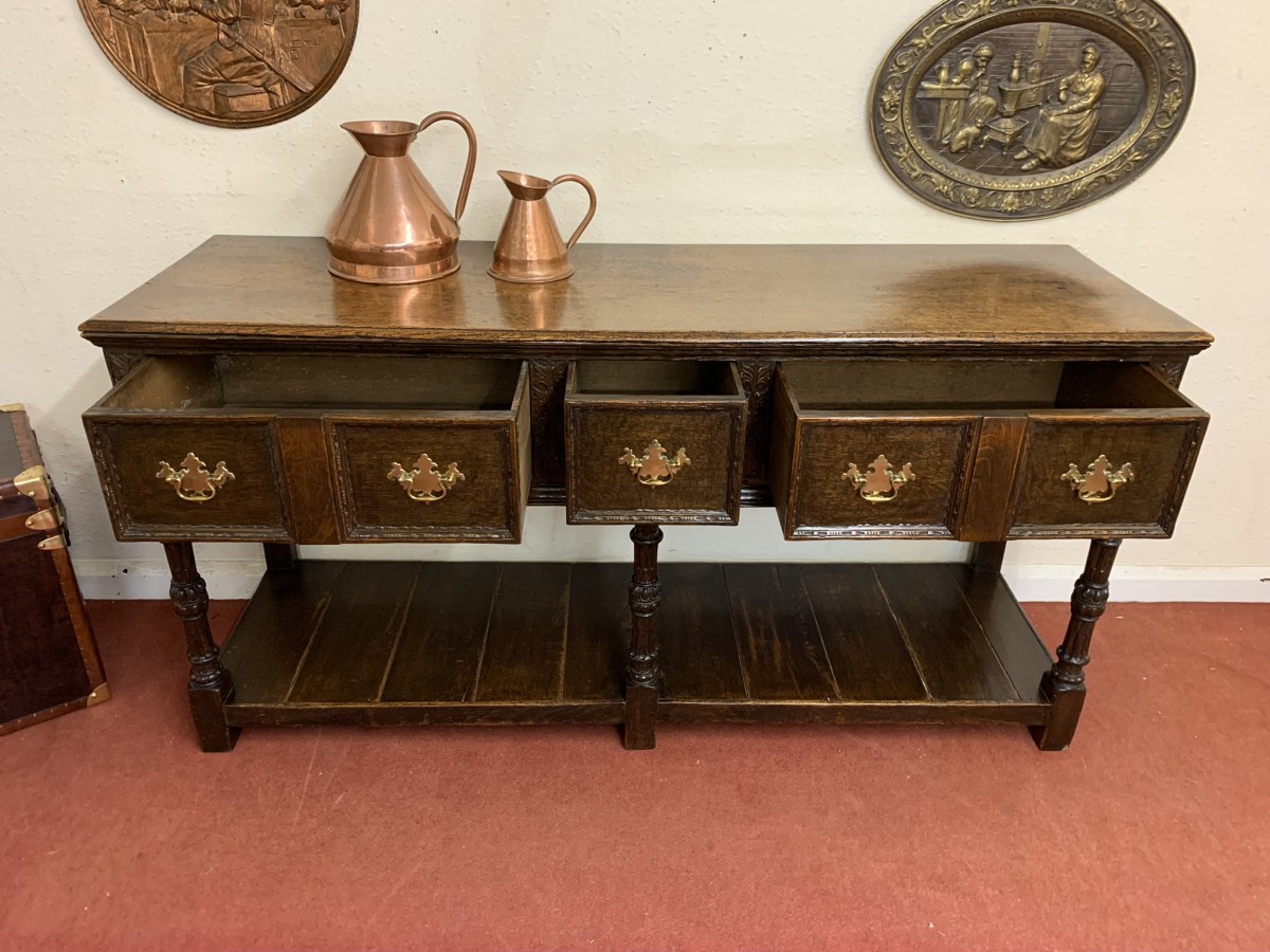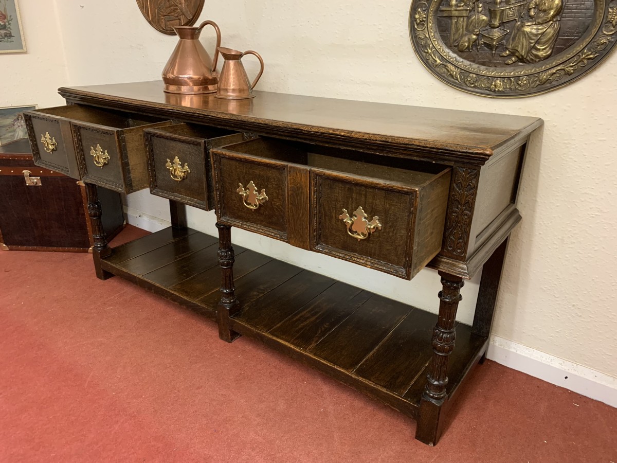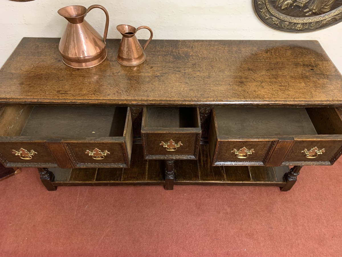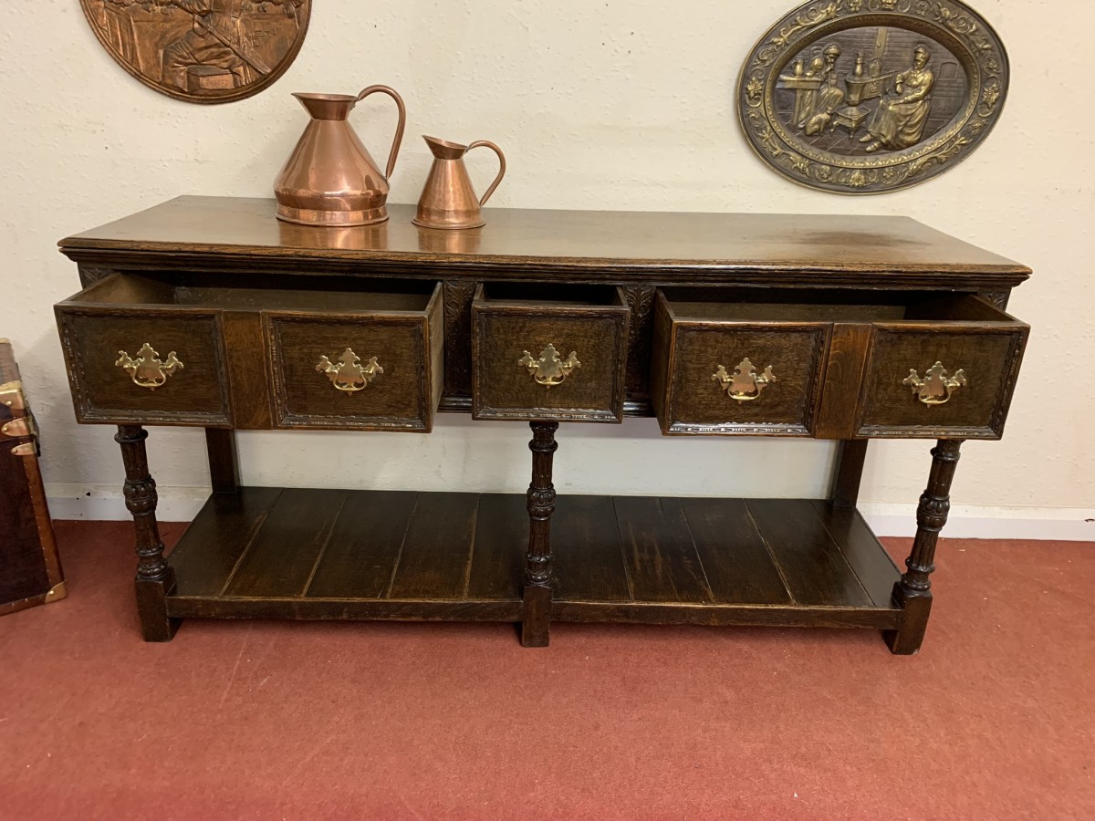 Made in glorious solid oak. The oversailing top sits above a central short drawer which is flanked by a pair of long drawers. The drawers have ornate carved decoration with fabulous brass drop handles. Planked pot board base, three fabulously carved legs to the front and standing on traditional block feet.