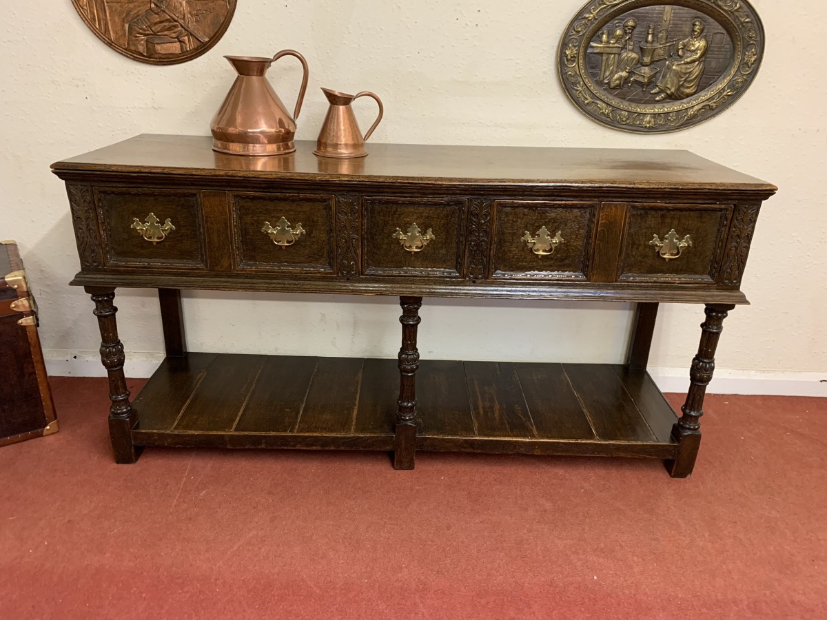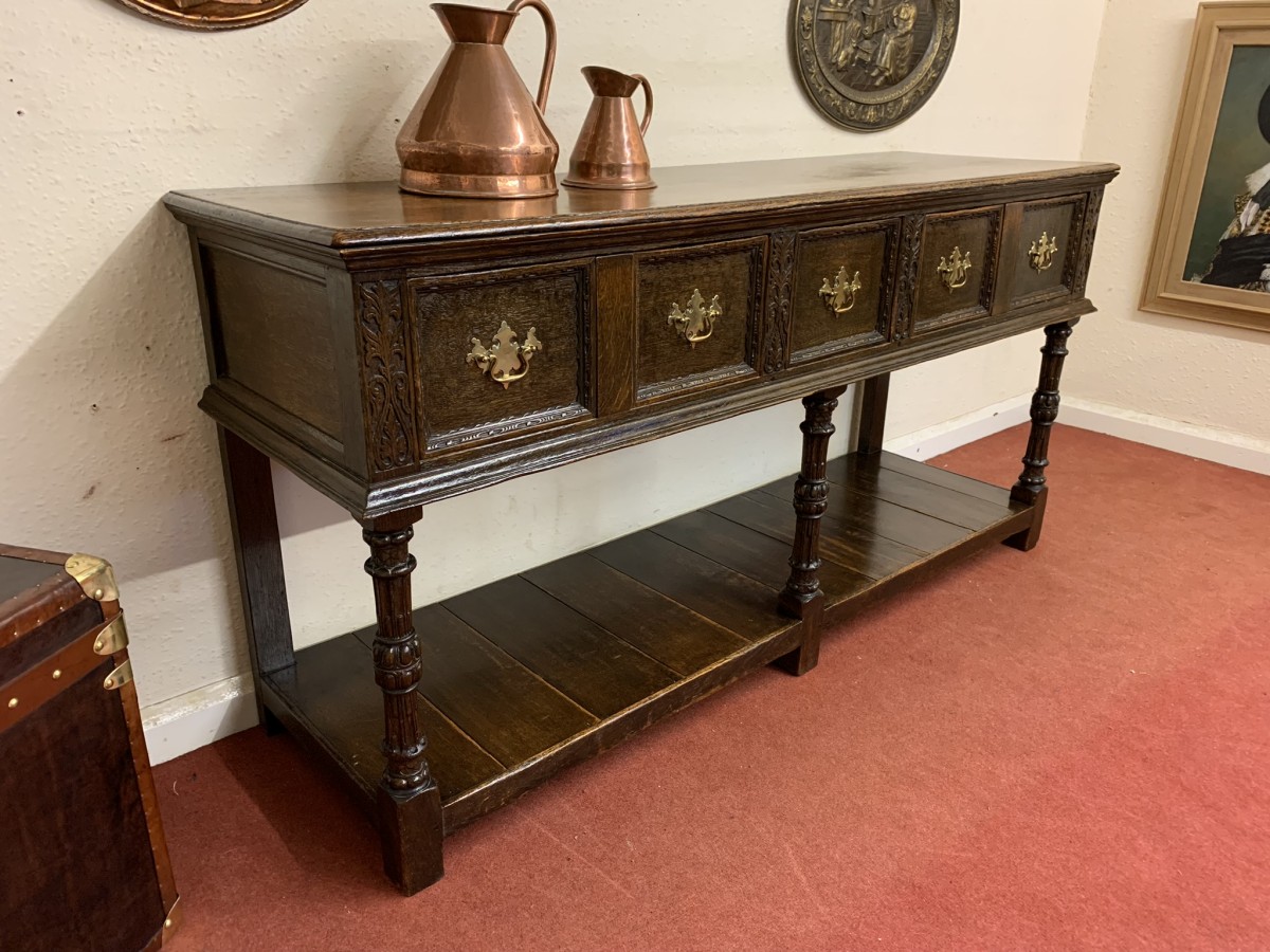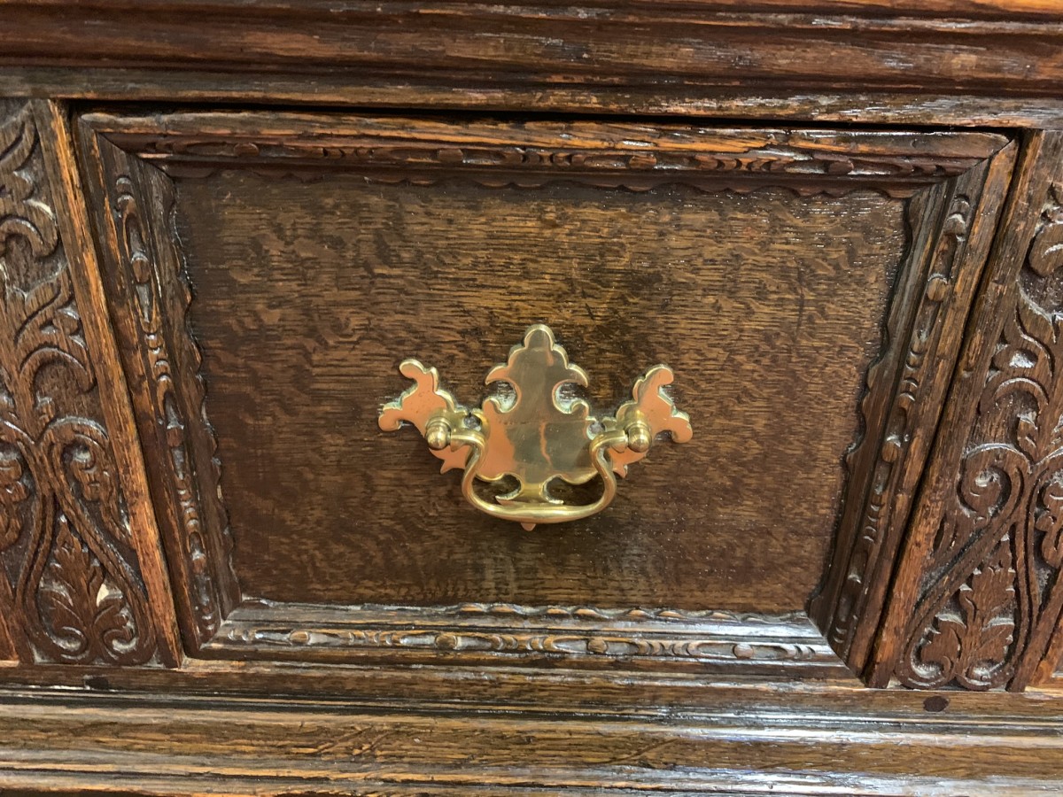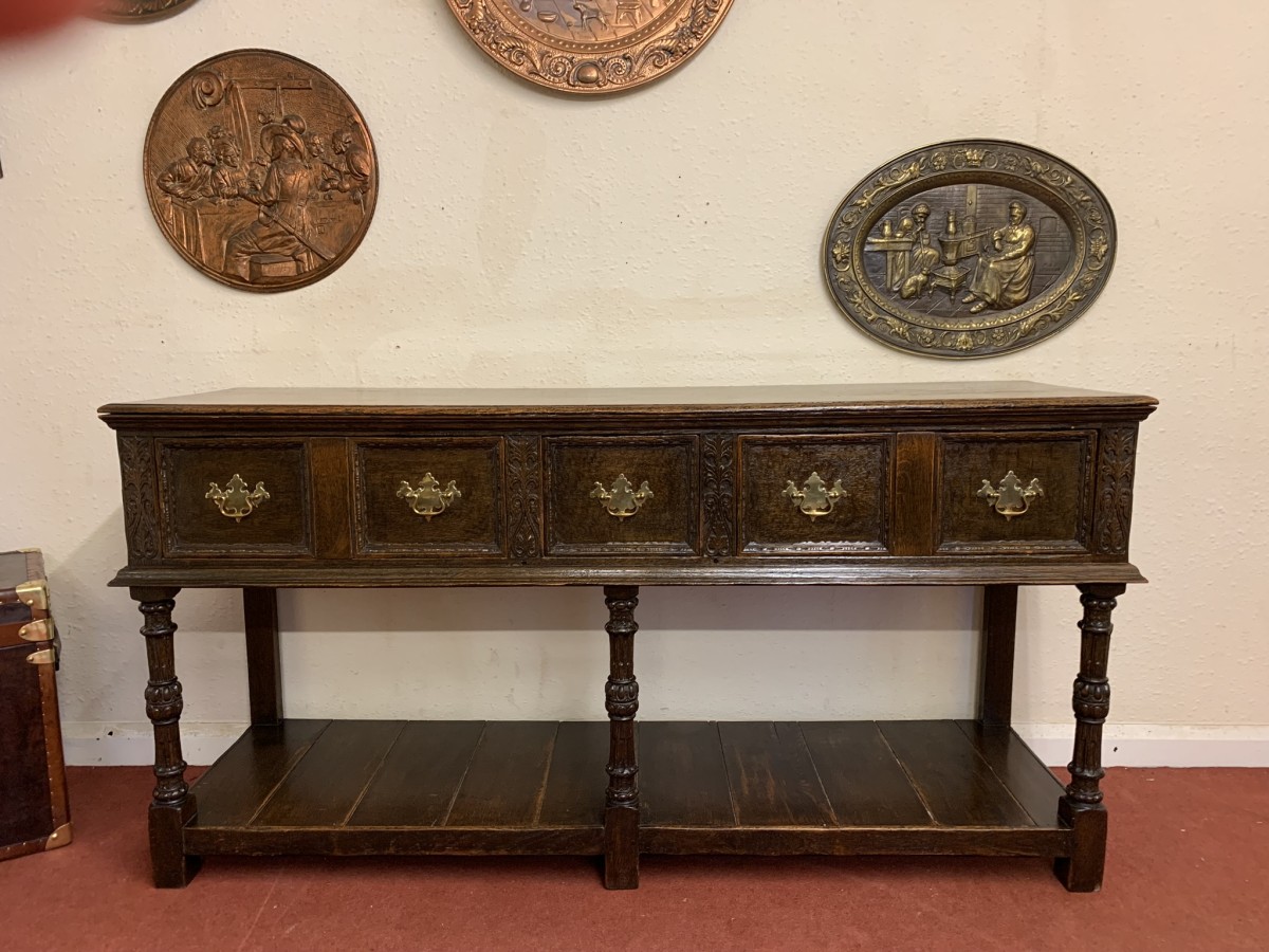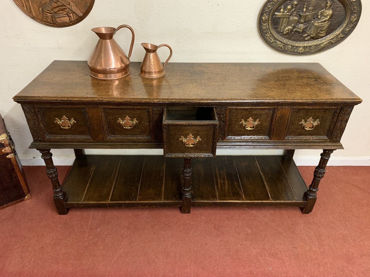 Made in glorious solid oak. The oversailing top sits above a central short drawer which is flanked by a pair of long drawers. The drawers have ornate carved decoration with fabulous brass drop handles. Planked pot board base, three fabulously carved legs to the front and standing on traditional block feet.