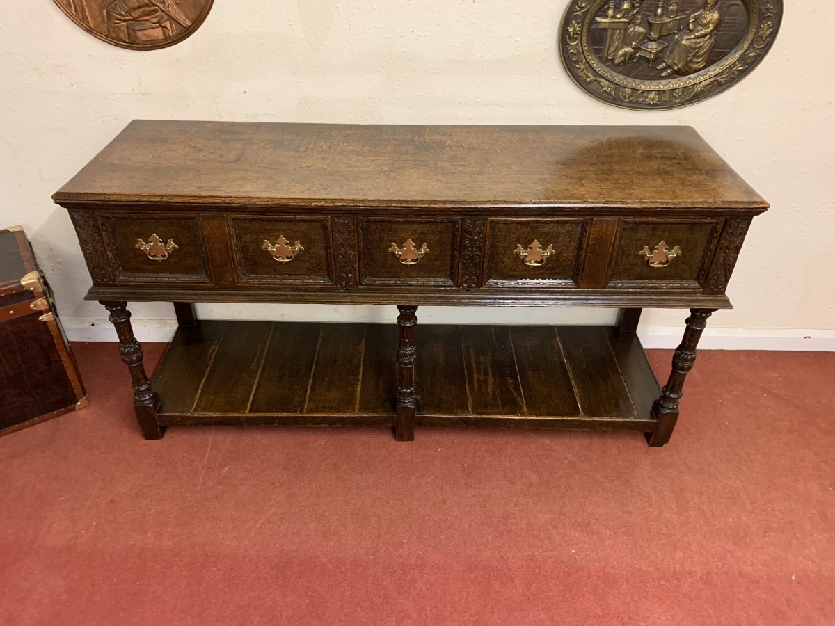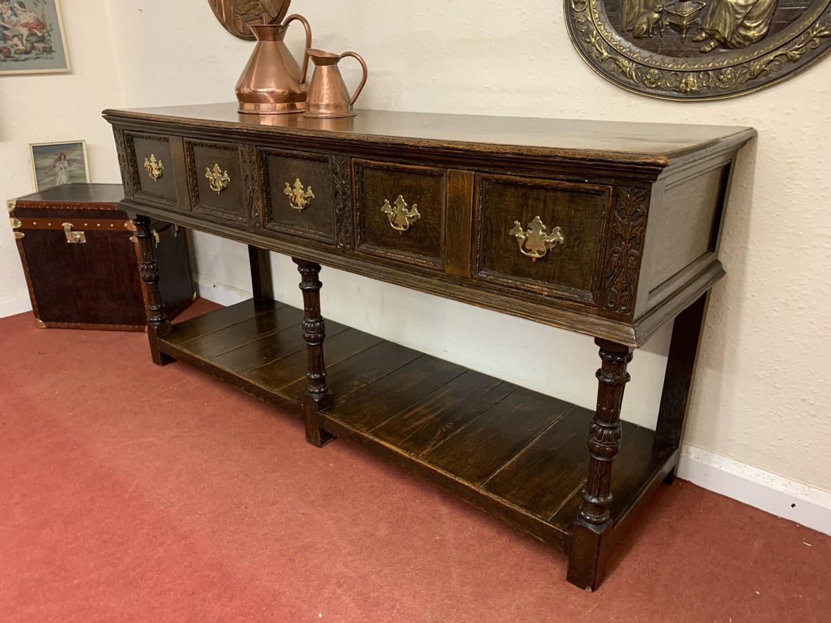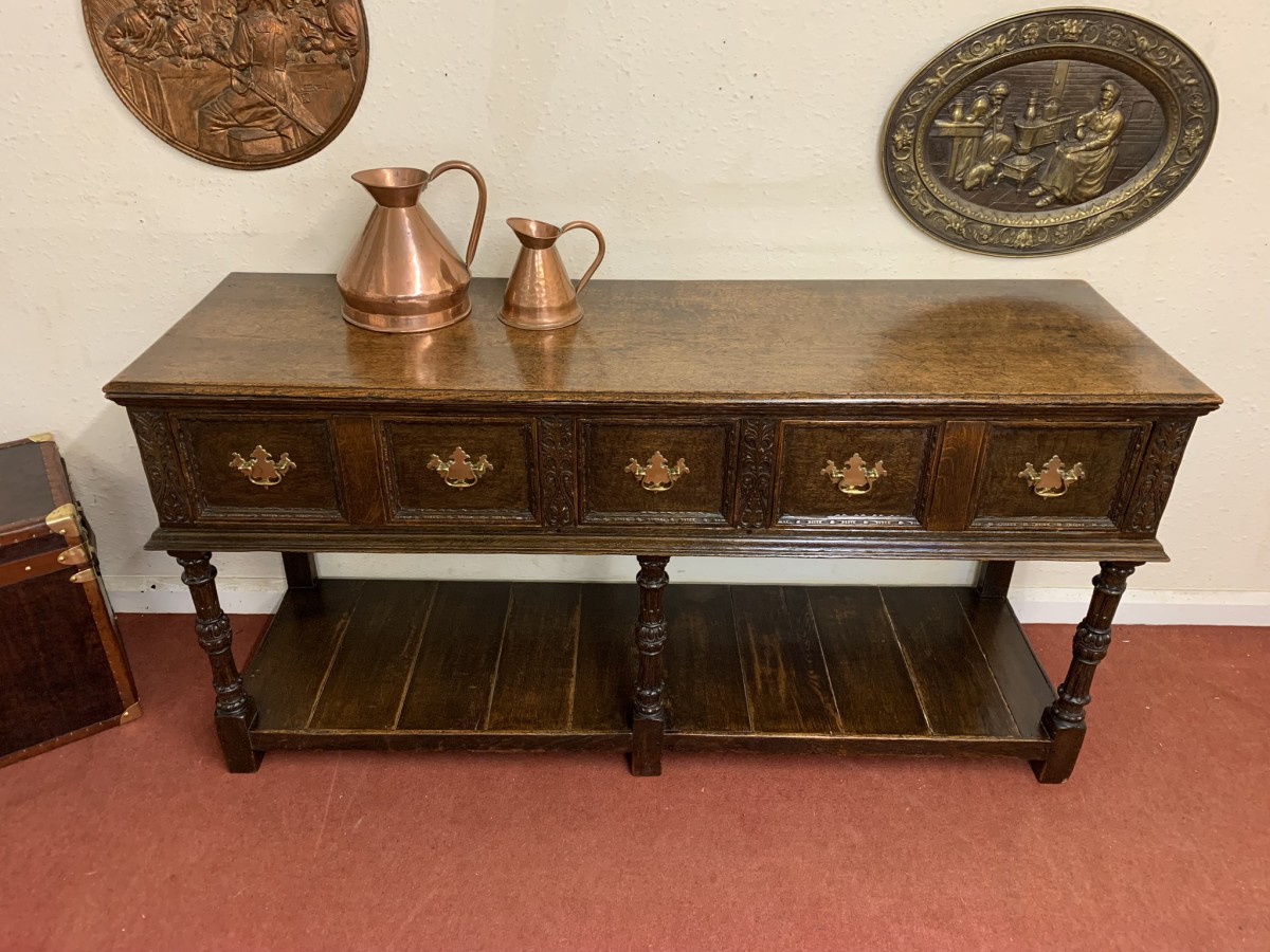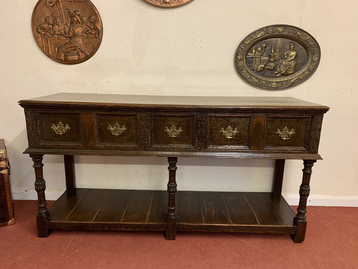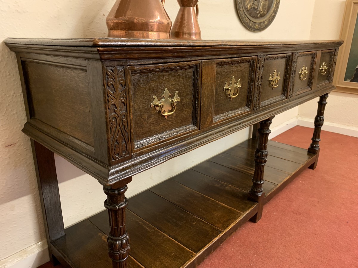 Made in glorious solid oak. The oversailing top sits above a central short drawer which is flanked by a pair of long drawers. The drawers have ornate carved decoration with fabulous brass drop handles. Planked pot board base, three fabulously carved legs to the front and standing on traditional block feet.