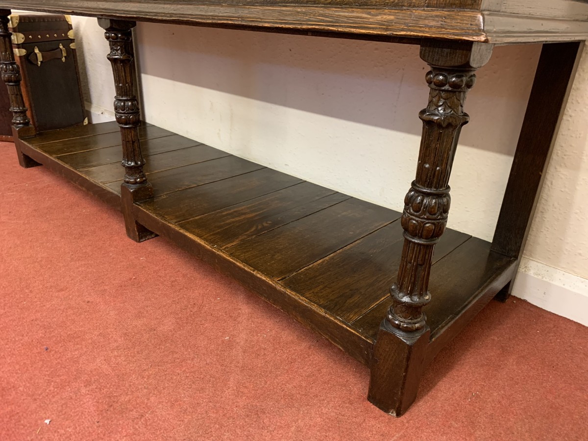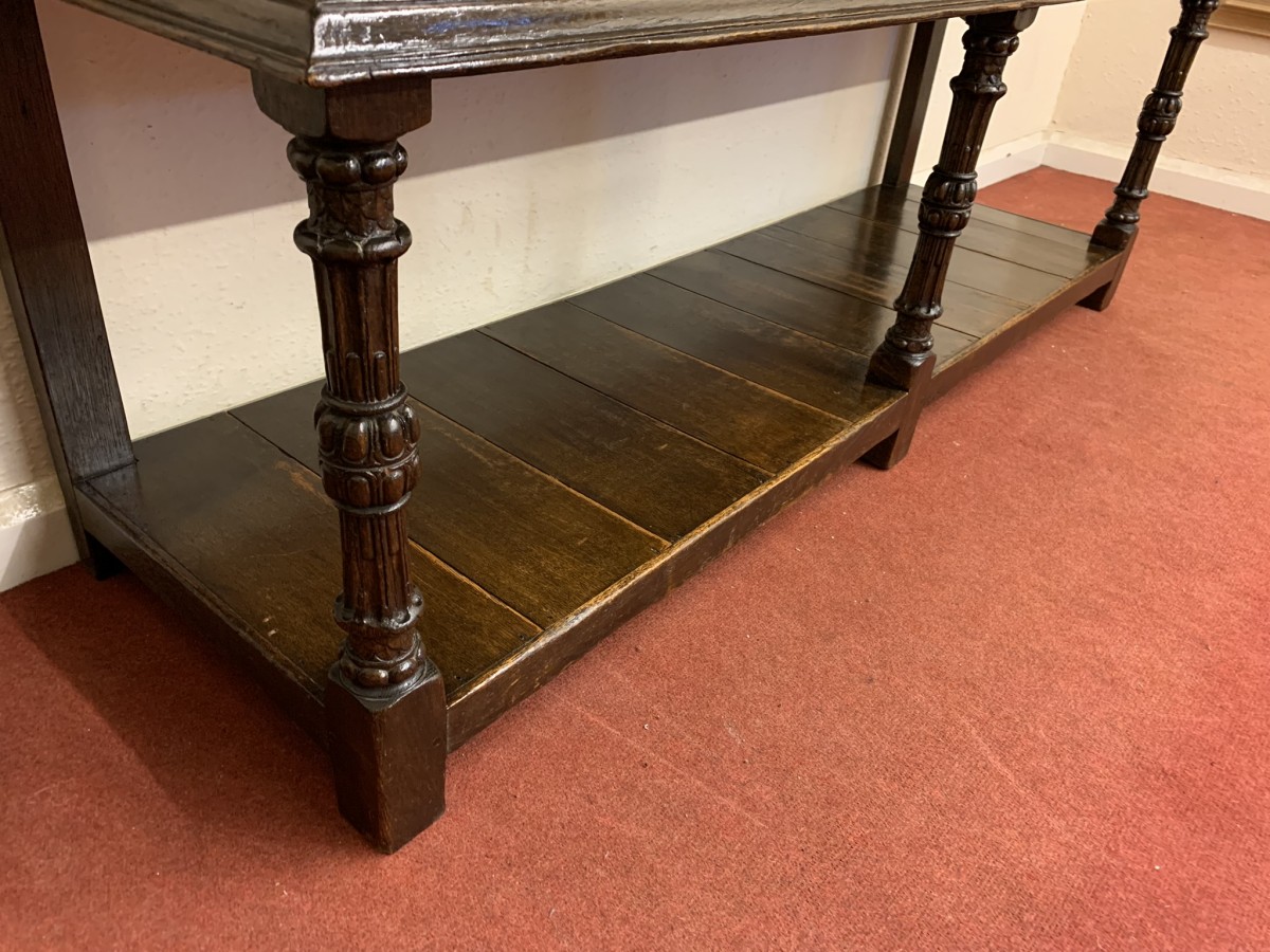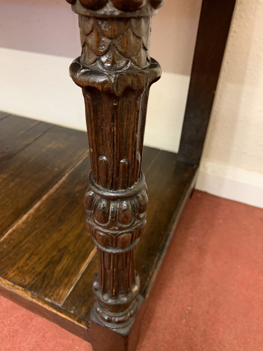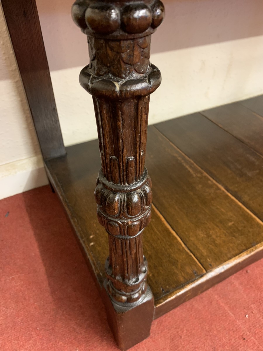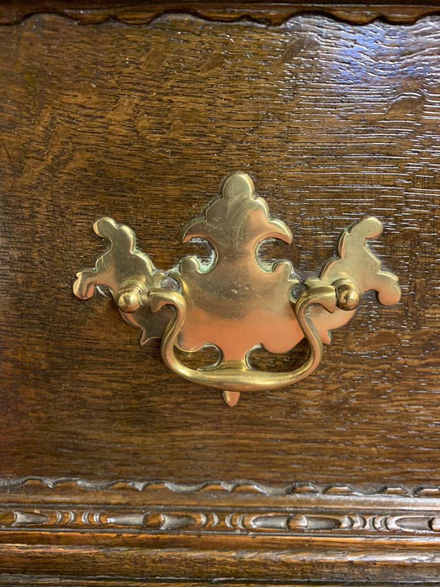 Made in glorious solid oak. The oversailing top sits above a central short drawer which is flanked by a pair of long drawers. The drawers have ornate carved decoration with fabulous brass drop handles. Planked pot board base, three fabulously carved legs to the front and standing on traditional block feet.