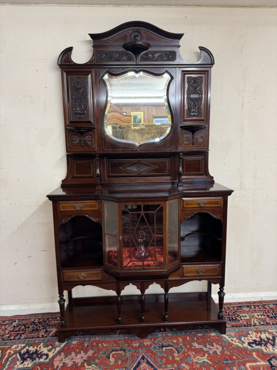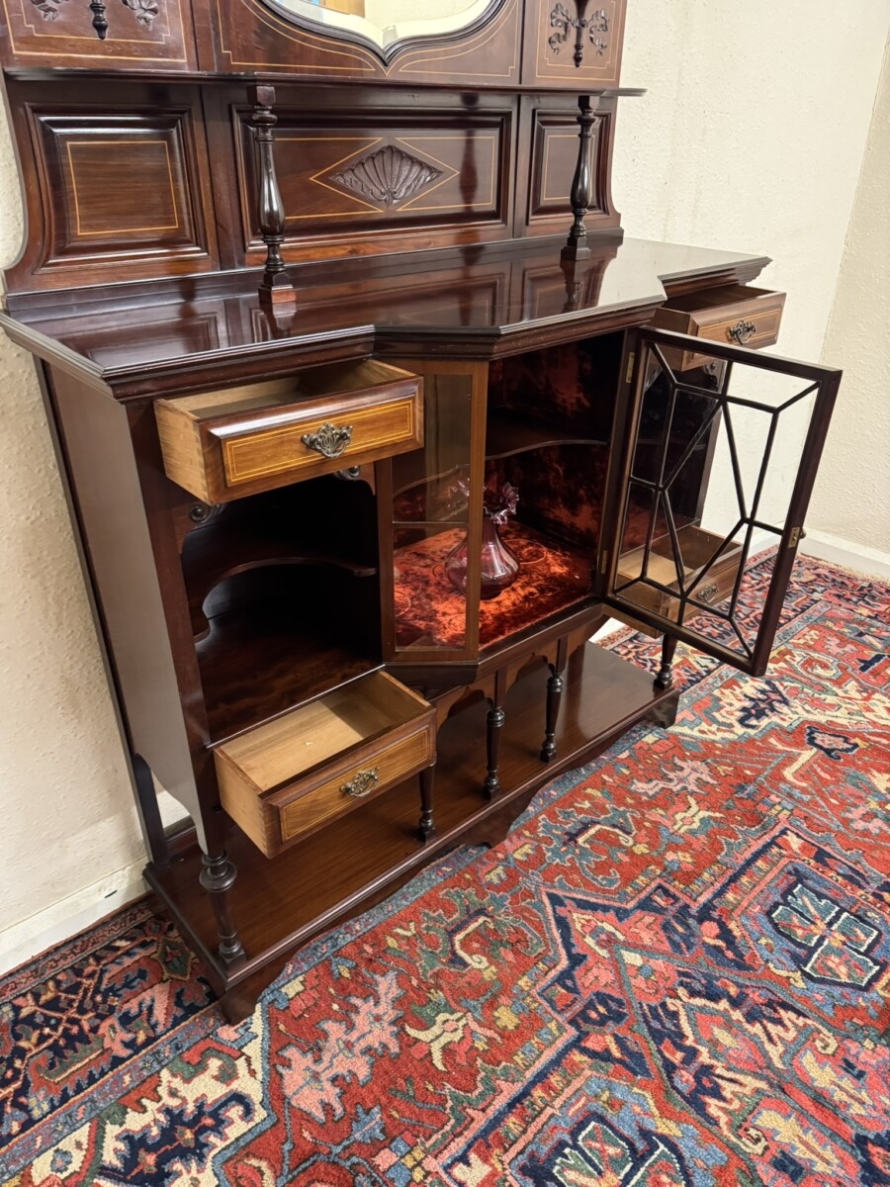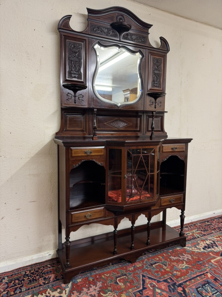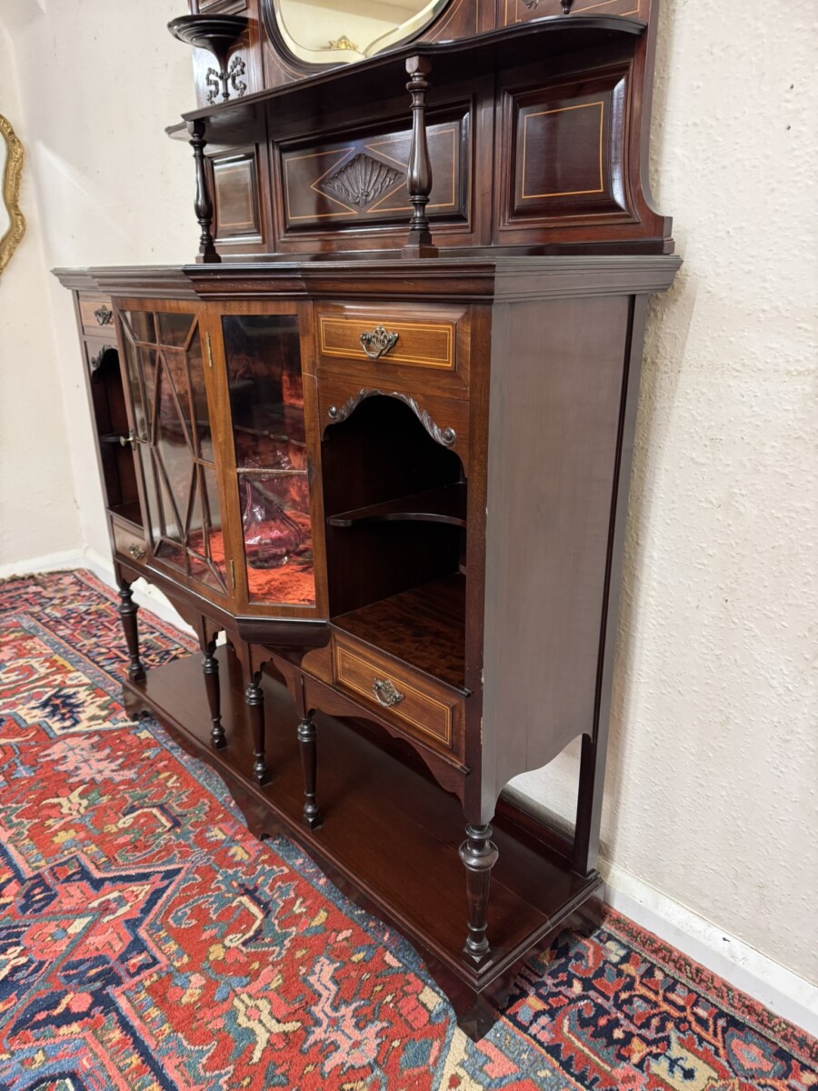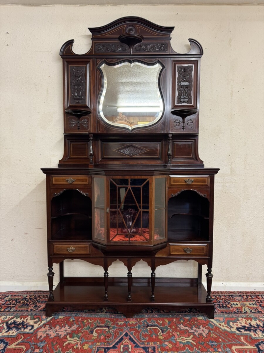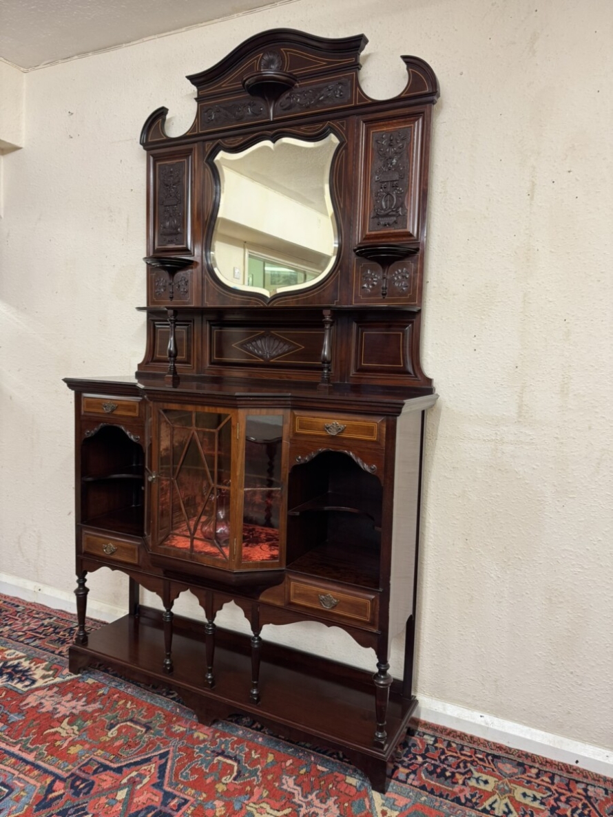 This impressive cabinet dates from the Edwardian period circa 1910. Th carved and inlaid back has a striking bevel edged shield mirror. Turned column supports, glazed brakefront central door opens to reveal a wooden shelf with velvet interior. Two drawers sit above two open sections, each section having a shaped wooden shelf, below are two inlaid drawers. Shelf below, five elegant turned supports and standing on bracket feet. Please note the quality of this side cabinet is exceptional.