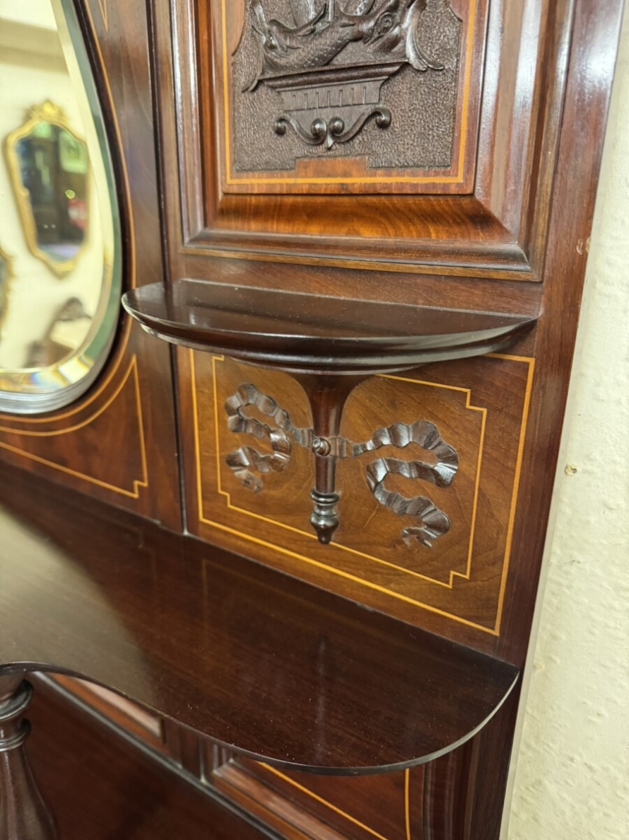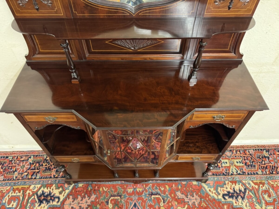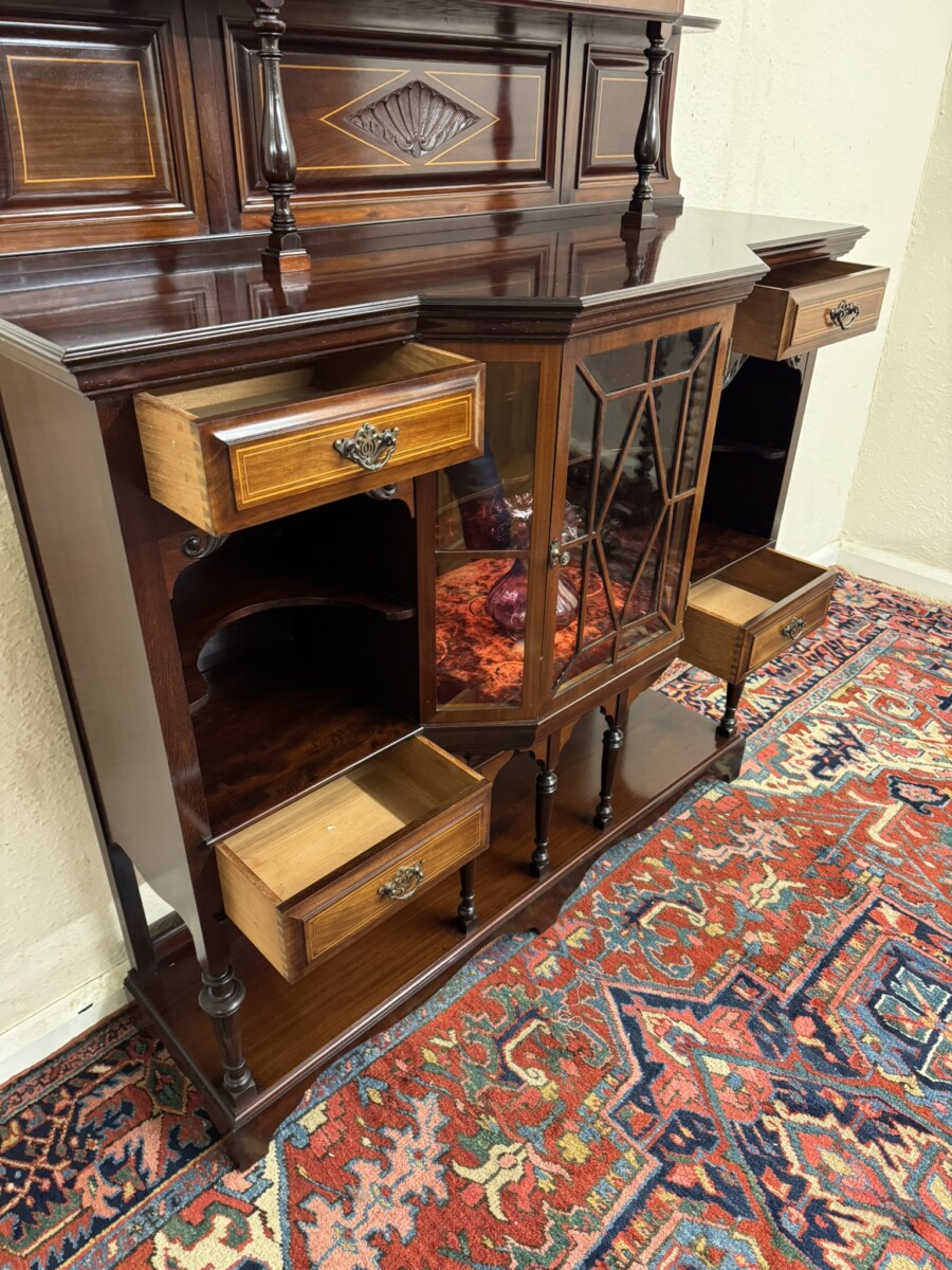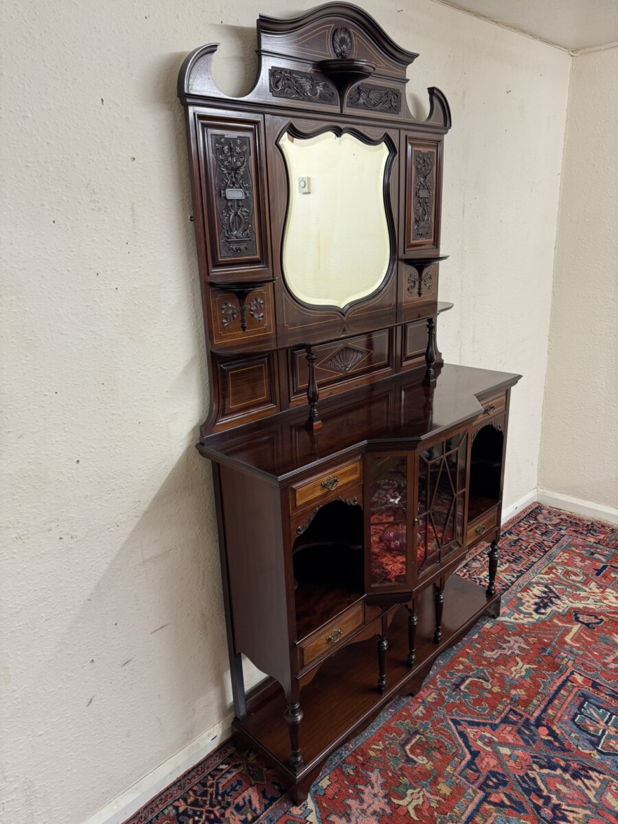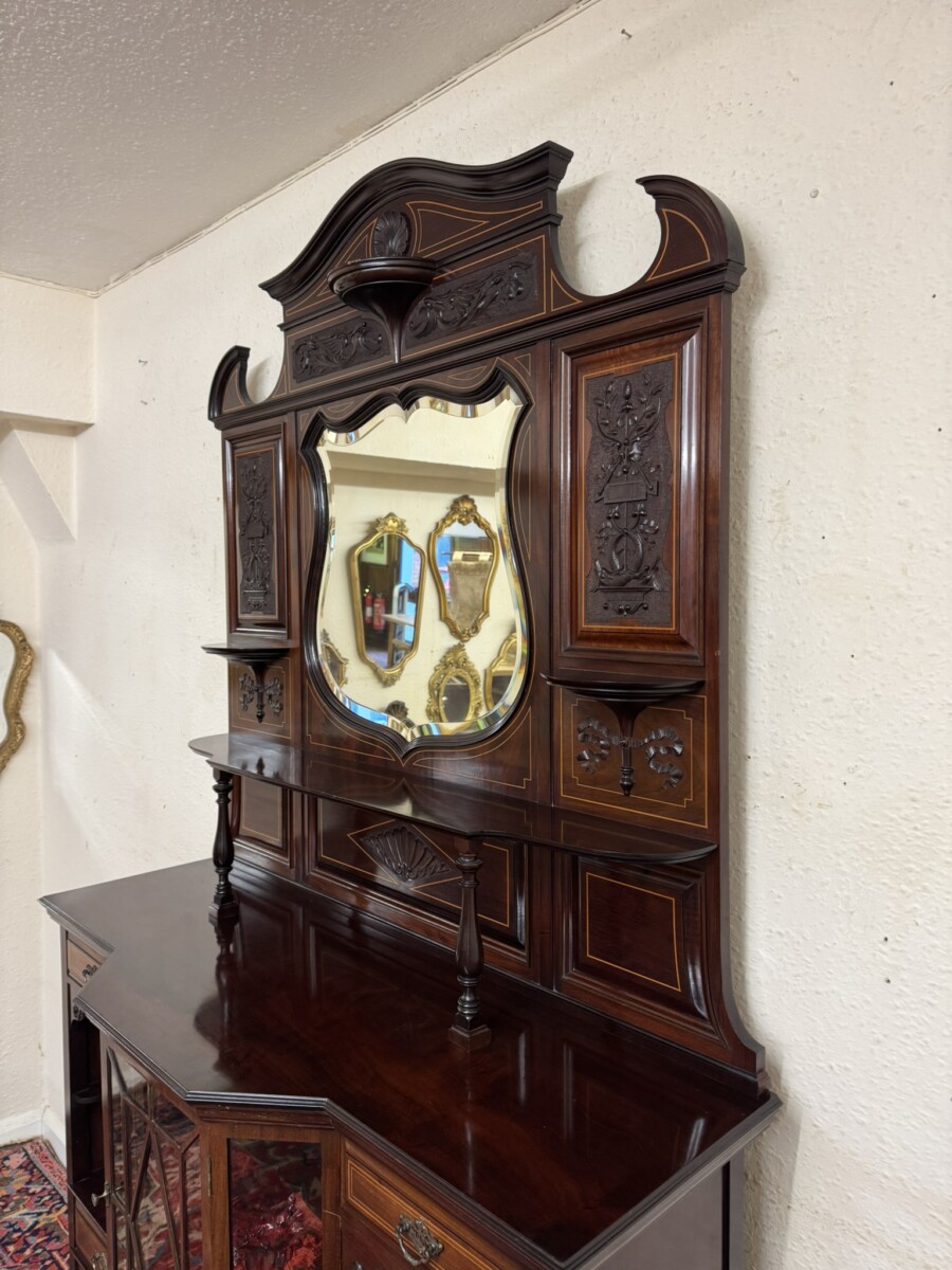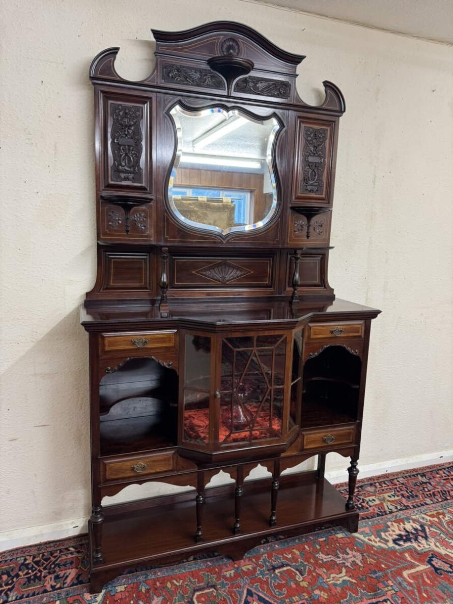 This impressive cabinet dates from the Edwardian period circa 1910. Th carved and inlaid back has a striking bevel edged shield mirror. Turned column supports, glazed brakefront central door opens to reveal a wooden shelf with velvet interior. Two drawers sit above two open sections, each section having a shaped wooden shelf, below are two inlaid drawers. Shelf below, five elegant turned supports and standing on bracket feet. Please note the quality of this side cabinet is exceptional.