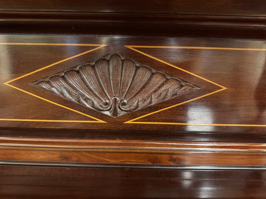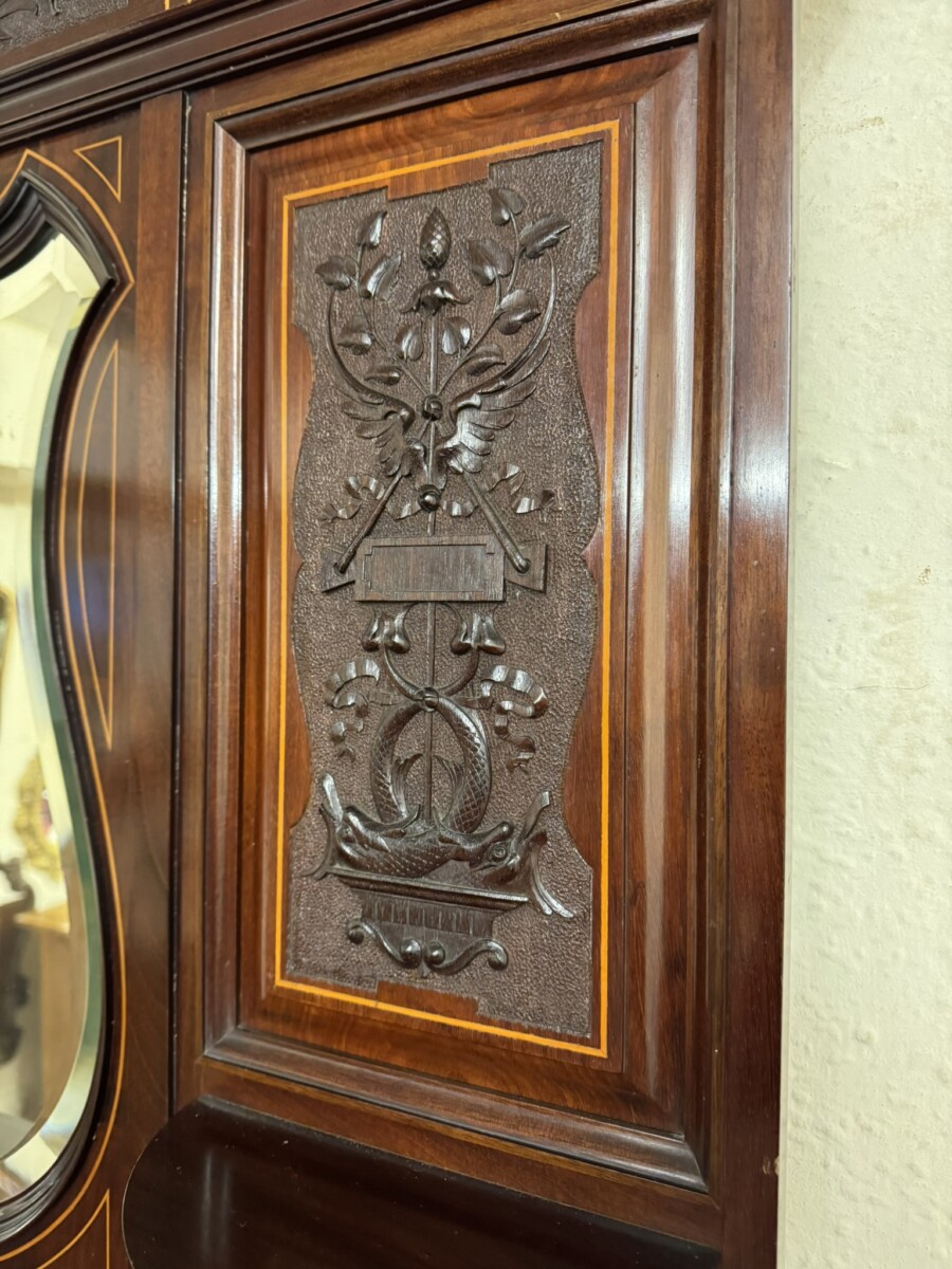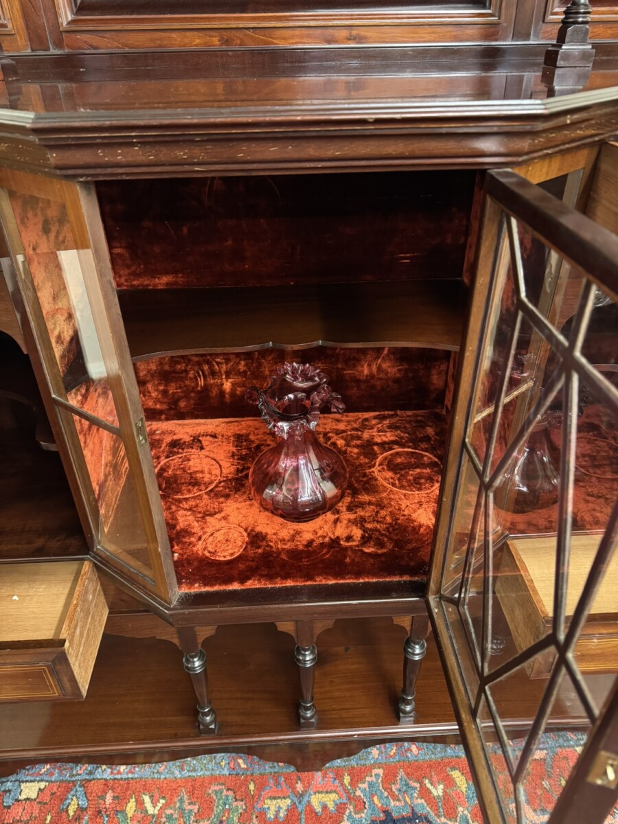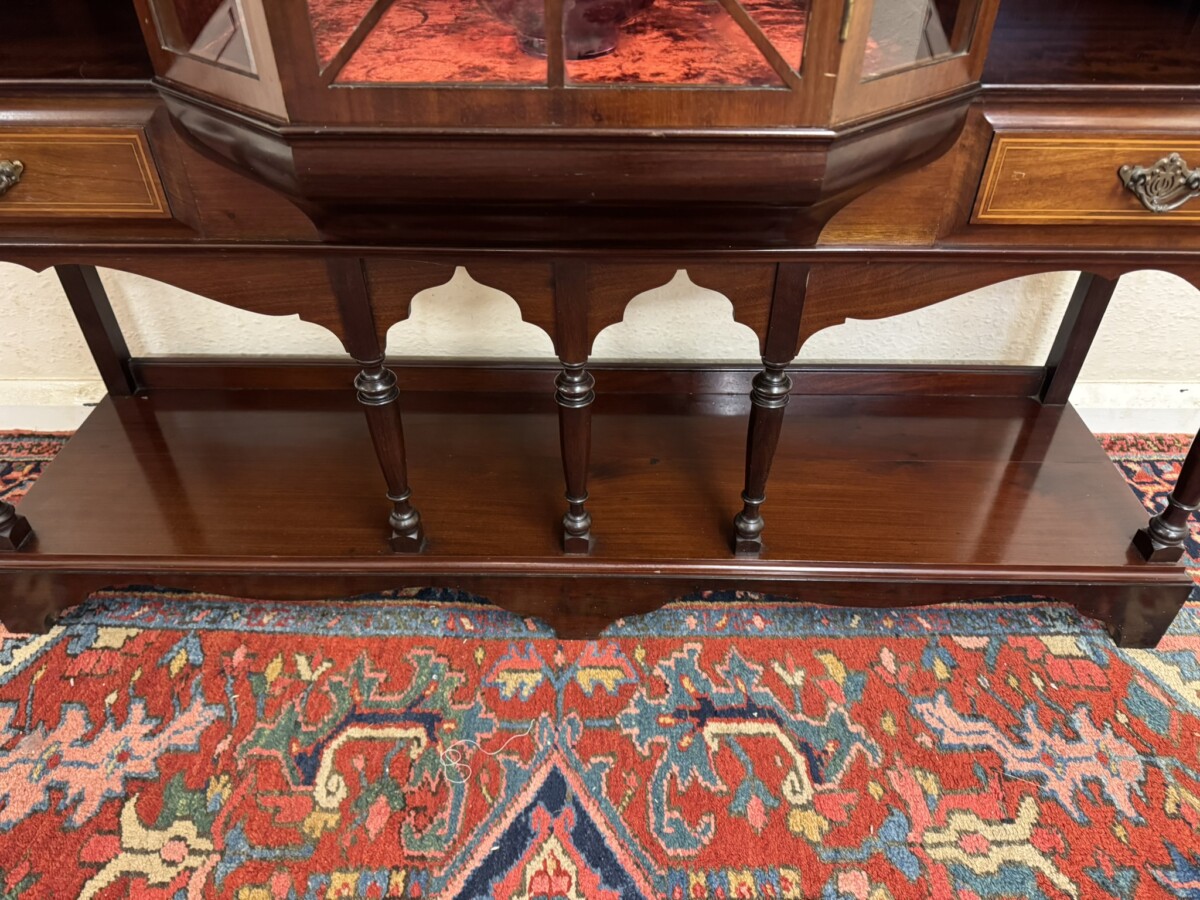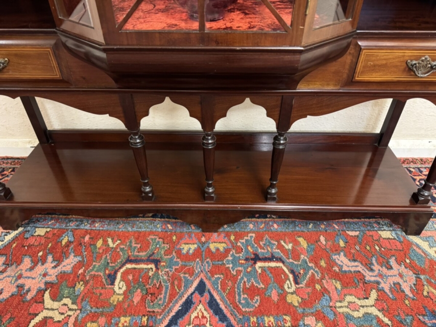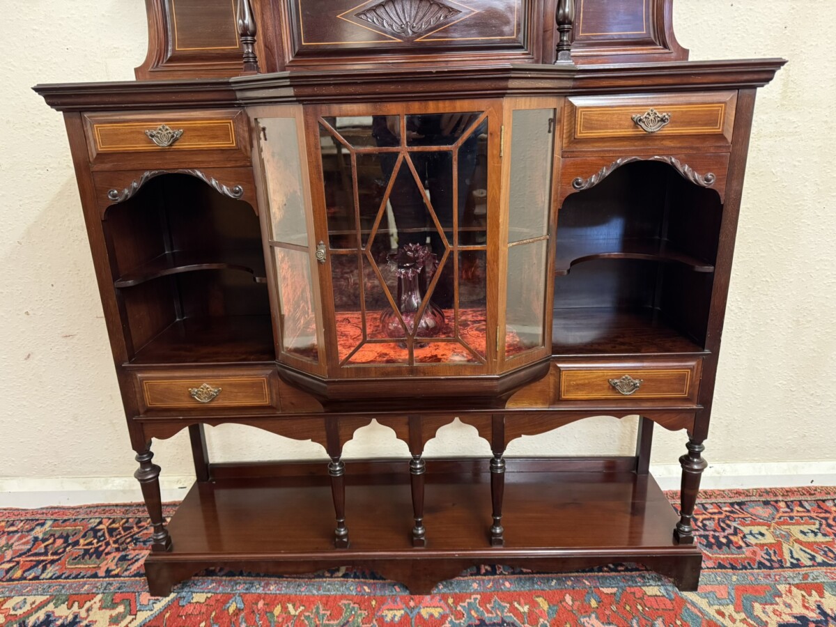 This impressive cabinet dates from the Edwardian period circa 1910. Th carved and inlaid back has a striking bevel edged shield mirror. Turned column supports, glazed brakefront central door opens to reveal a wooden shelf with velvet interior. Two drawers sit above two open sections, each section having a shaped wooden shelf, below are two inlaid drawers. Shelf below, five elegant turned supports and standing on bracket feet. Please note the quality of this side cabinet is exceptional.