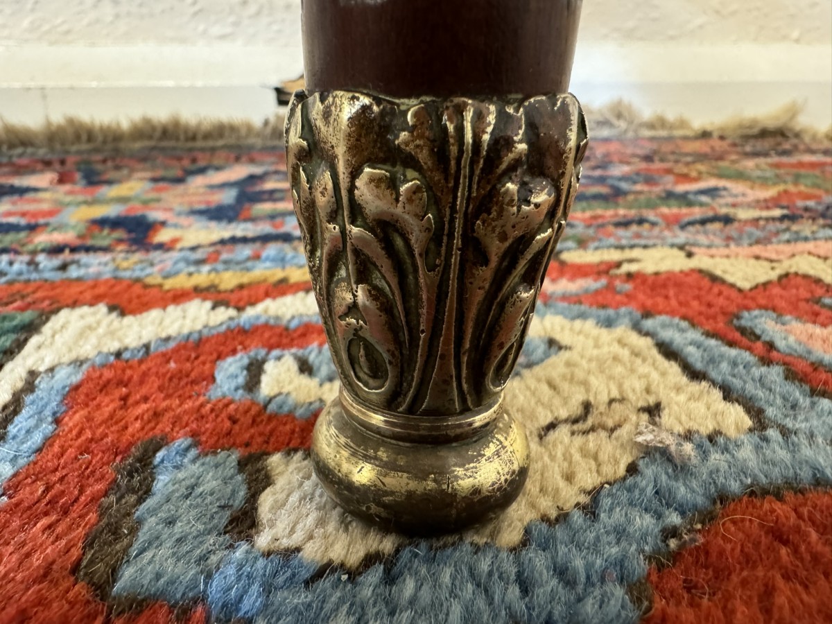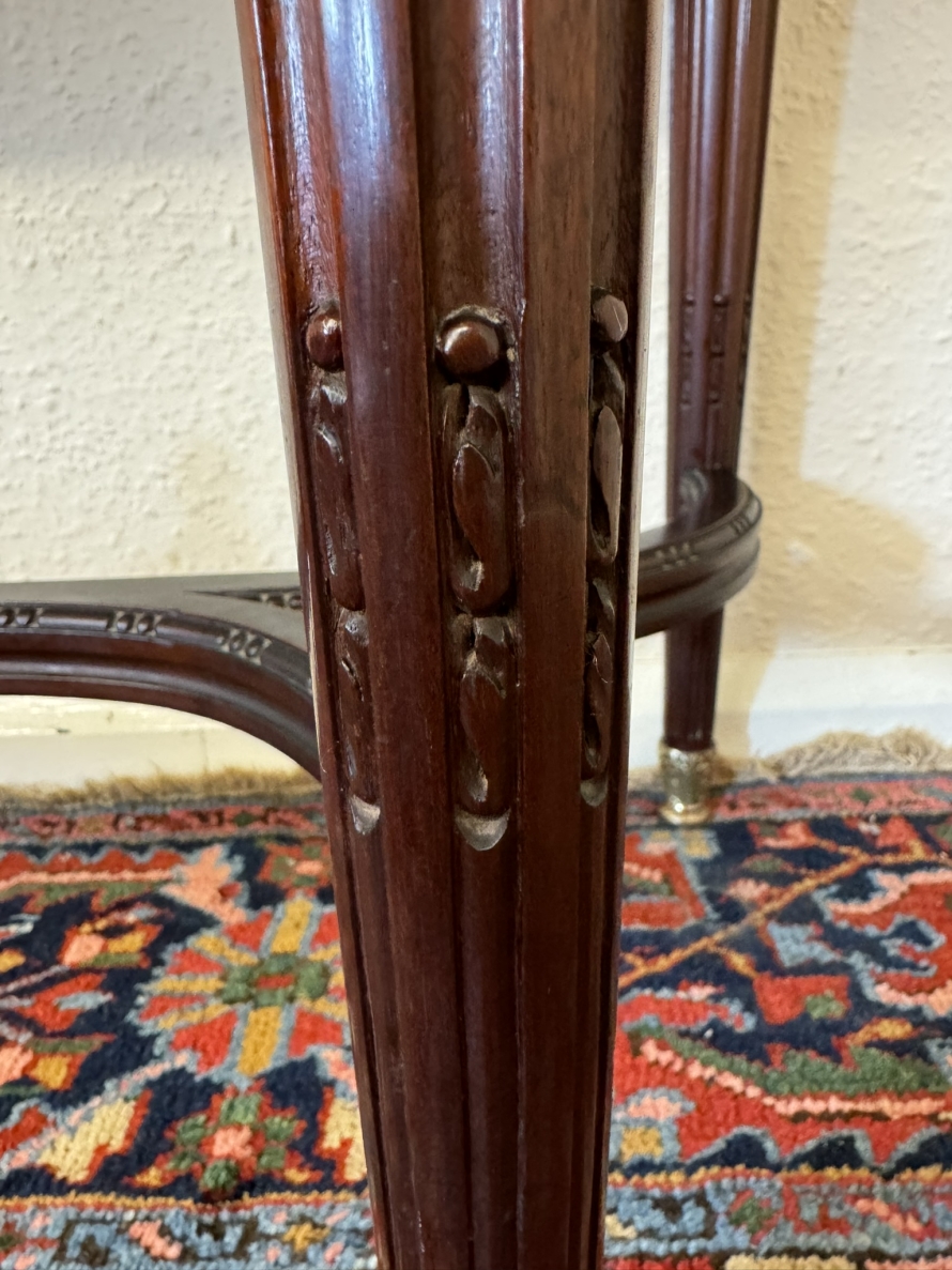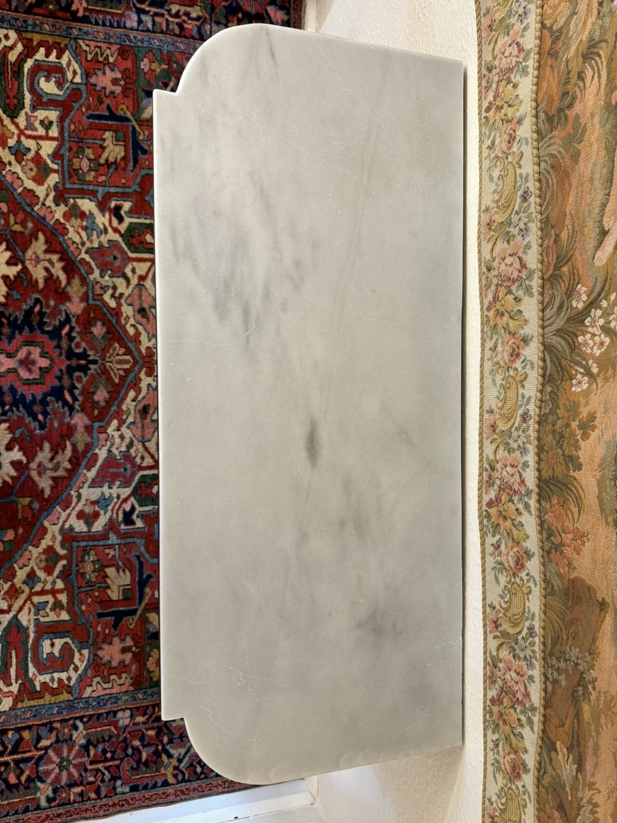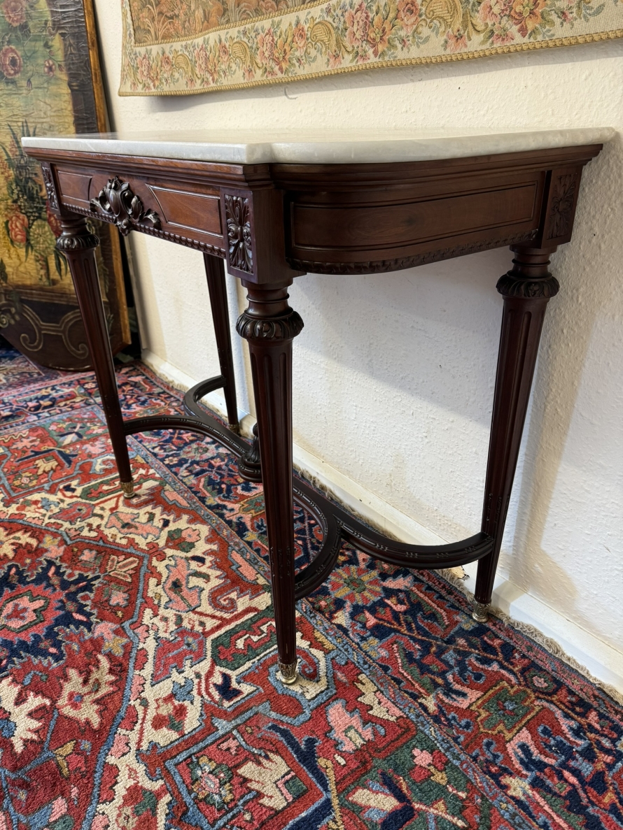 This fabulous console dates circa 1910. The shaped white marble top is removable. The carved base has four carved tapered legs, shaped stretcher supports and sits on four original brass capped feet.