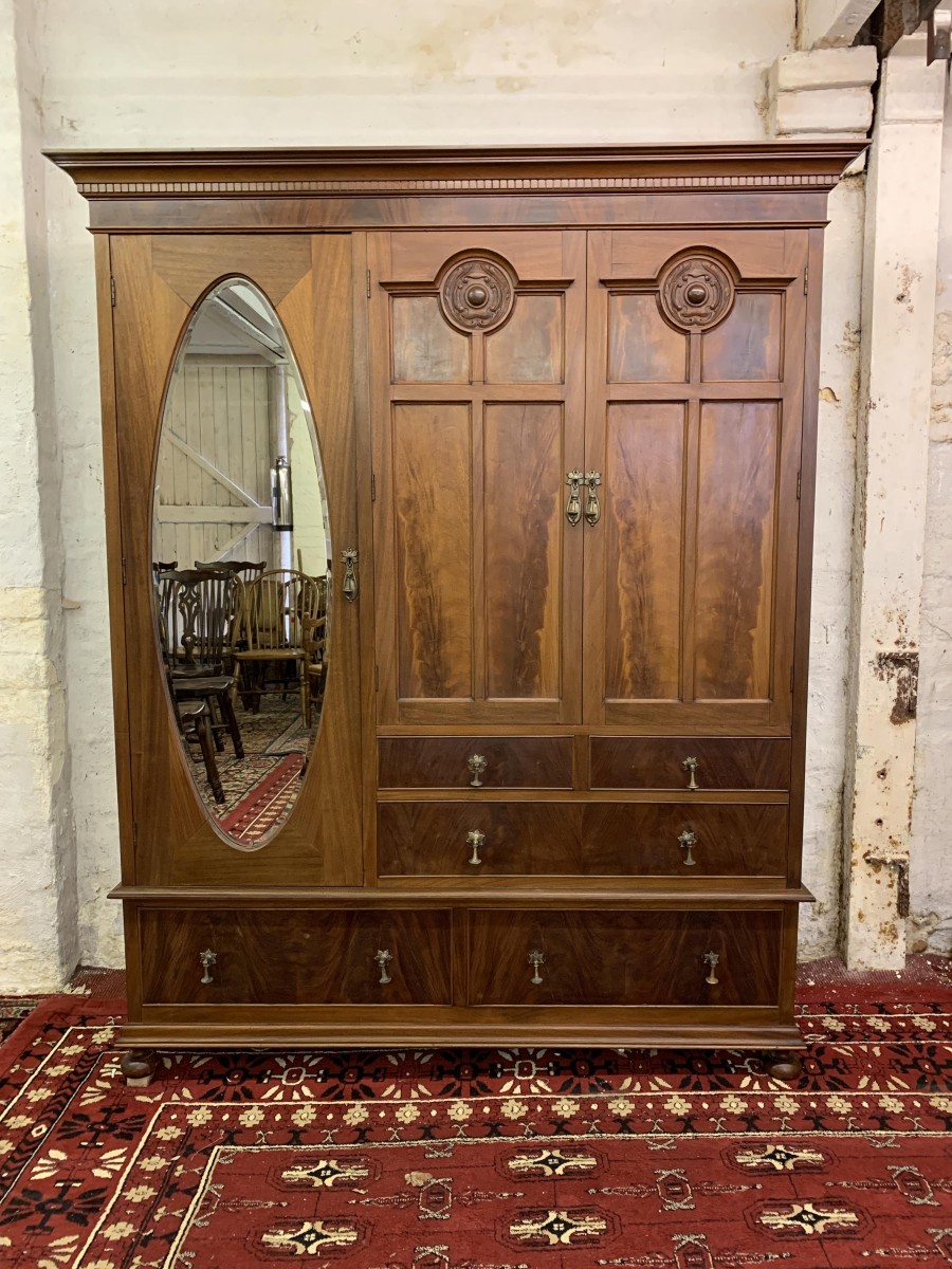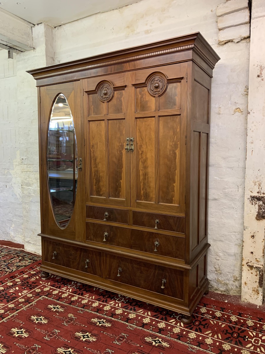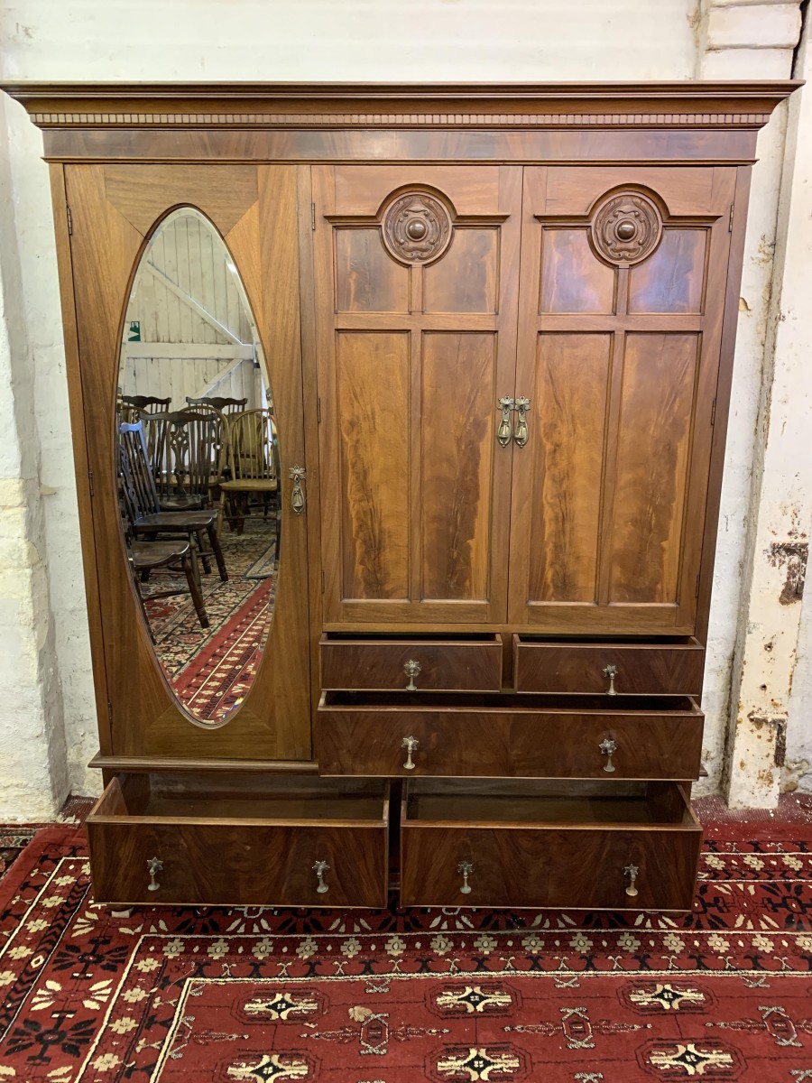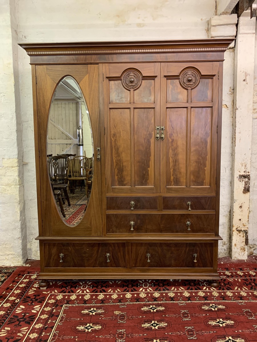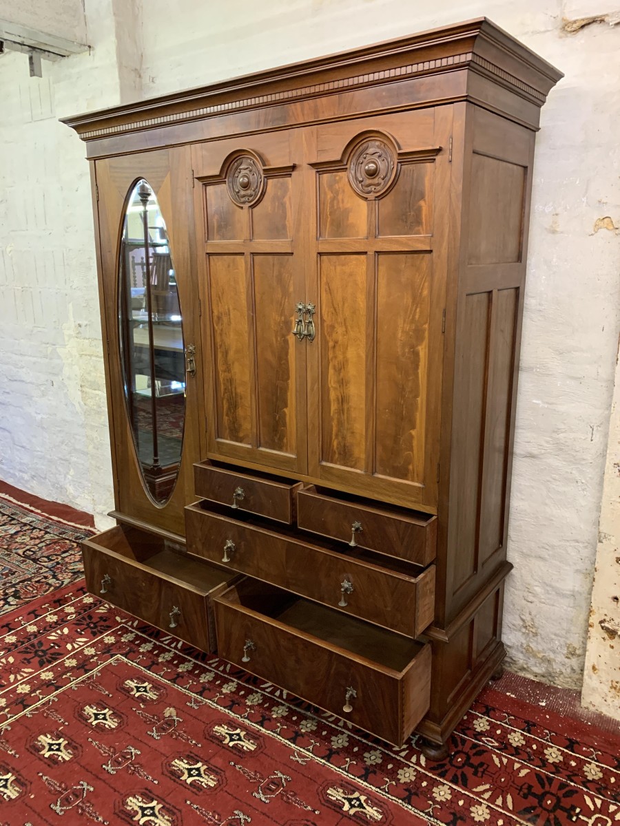 This fabulous wardrobe dates circa 1910. The stepped cornice has carved decoration, below to the left-hand side is a lockable door the door having a full length oval bevel edged dressing mirror. The door opens to reveal a hanging rail. To the right are a pair of carved lockable doors, the doors open to reveal a hanging rail and original hooks. Below are two short drawers, each with a pair of brass drop handles which sit above along drawer the drawer having a pair of drop handles. The base section having two deep drawers, each drawer having a pair of brass drop handles. Recessed panelled sides this fabulous wardrobe sits on four turned feet.