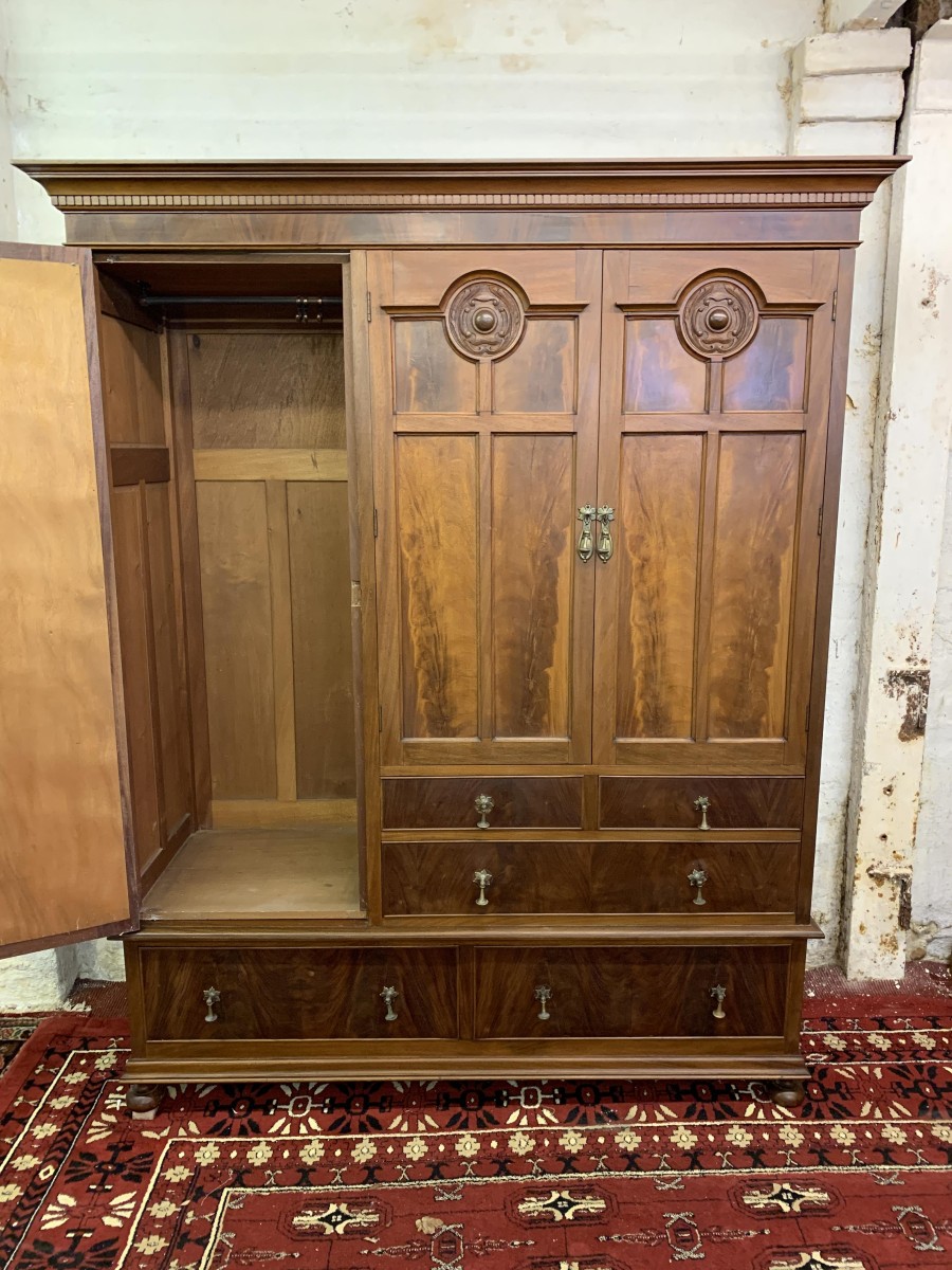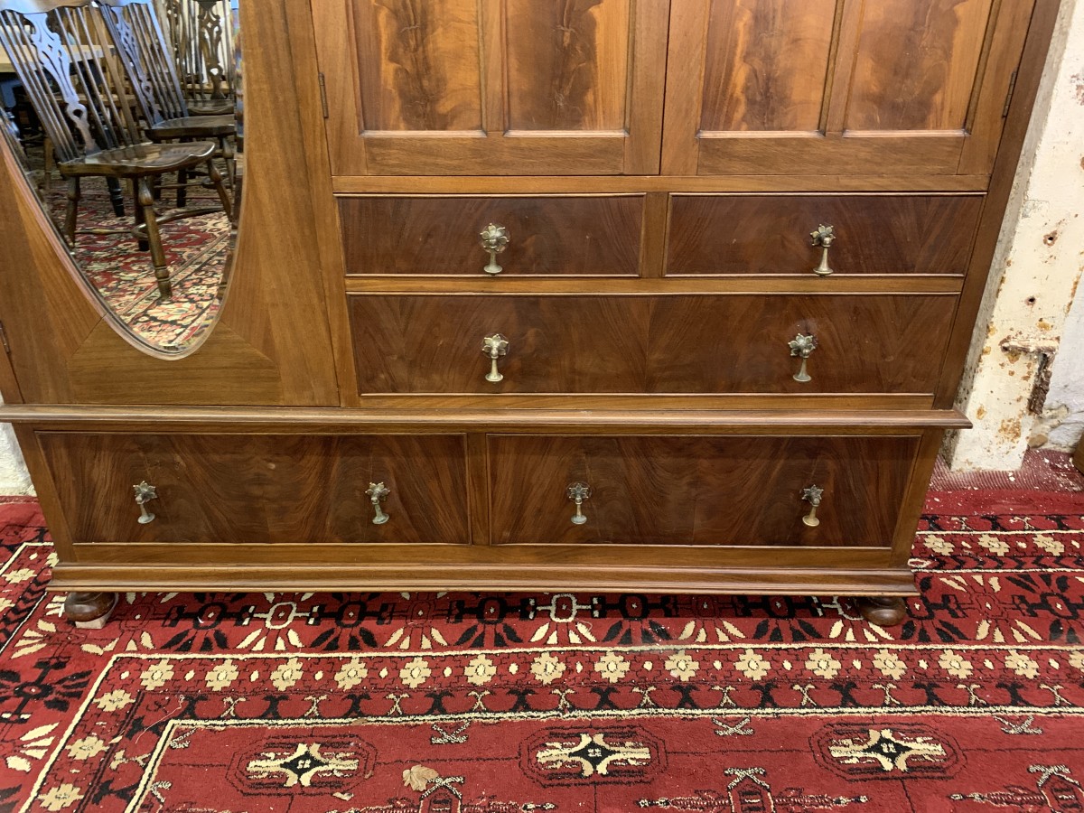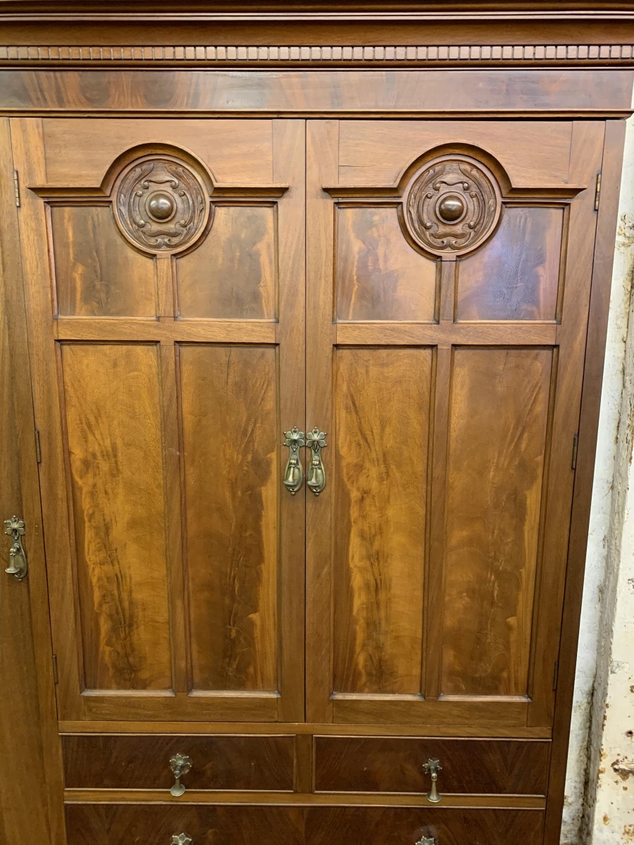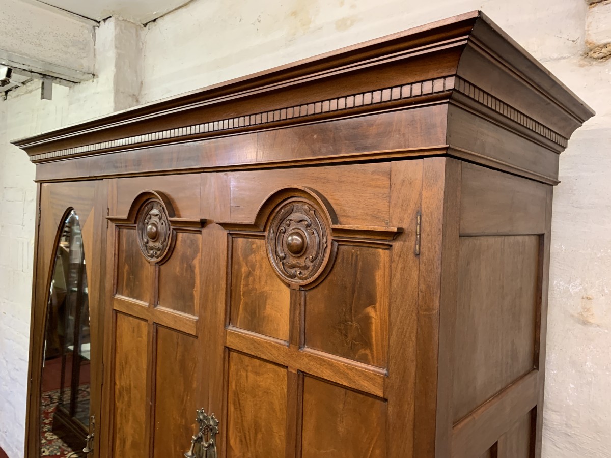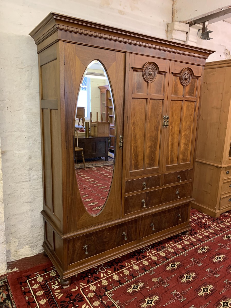 This fabulous wardrobe dates circa 1910. The stepped cornice has carved decoration, below to the left-hand side is a lockable door the door having a full length oval bevel edged dressing mirror. The door opens to reveal a hanging rail. To the right are a pair of carved lockable doors, the doors open to reveal a hanging rail and original hooks. Below are two short drawers, each with a pair of brass drop handles which sit above along drawer the drawer having a pair of drop handles. The base section having two deep drawers, each drawer having a pair of brass drop handles. Recessed panelled sides this fabulous wardrobe sits on four turned feet.