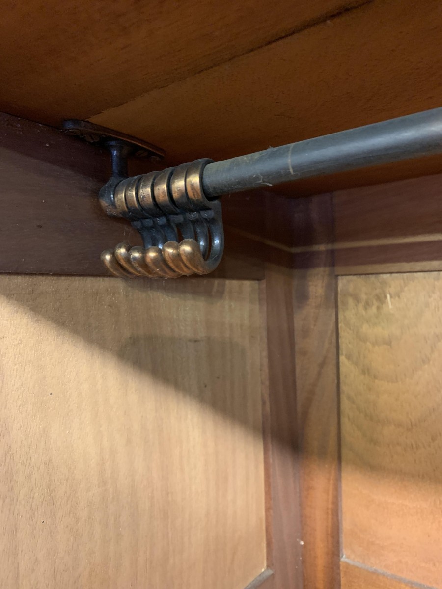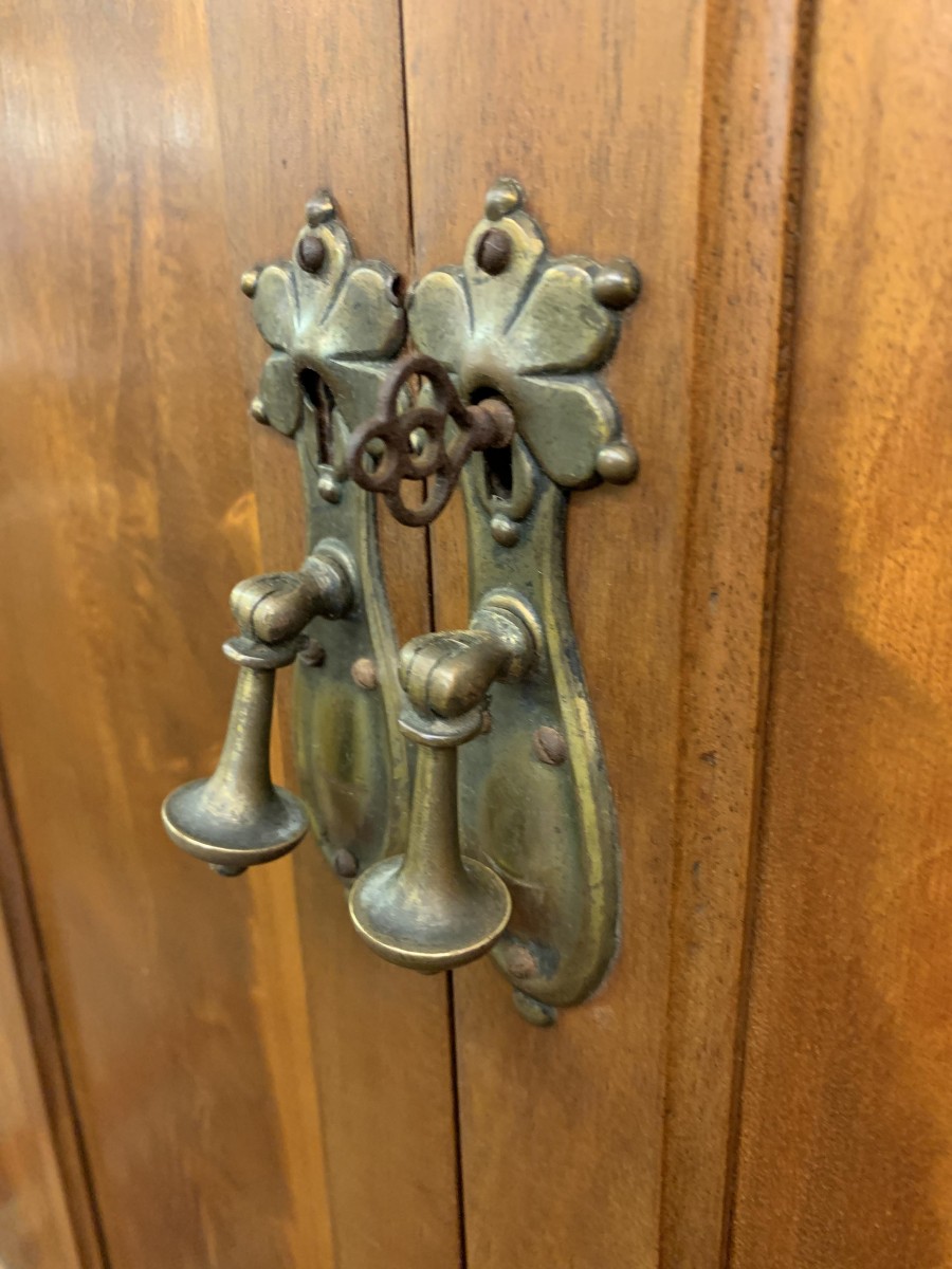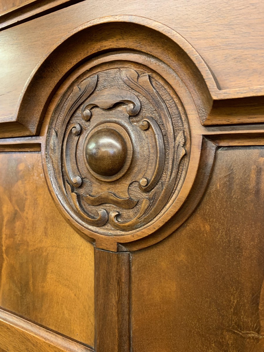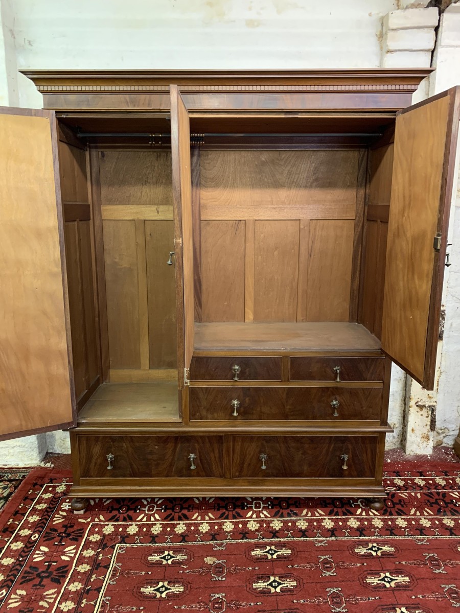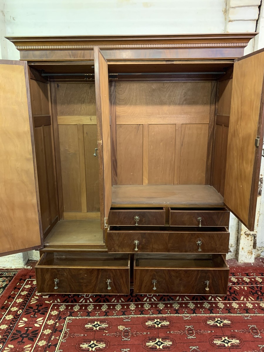 This fabulous wardrobe dates circa 1910. The stepped cornice has carved decoration, below to the left-hand side is a lockable door the door having a full length oval bevel edged dressing mirror. The door opens to reveal a hanging rail. To the right are a pair of carved lockable doors, the doors open to reveal a hanging rail and original hooks. Below are two short drawers, each with a pair of brass drop handles which sit above along drawer the drawer having a pair of drop handles. The base section having two deep drawers, each drawer having a pair of brass drop handles. Recessed panelled sides this fabulous wardrobe sits on four turned feet.