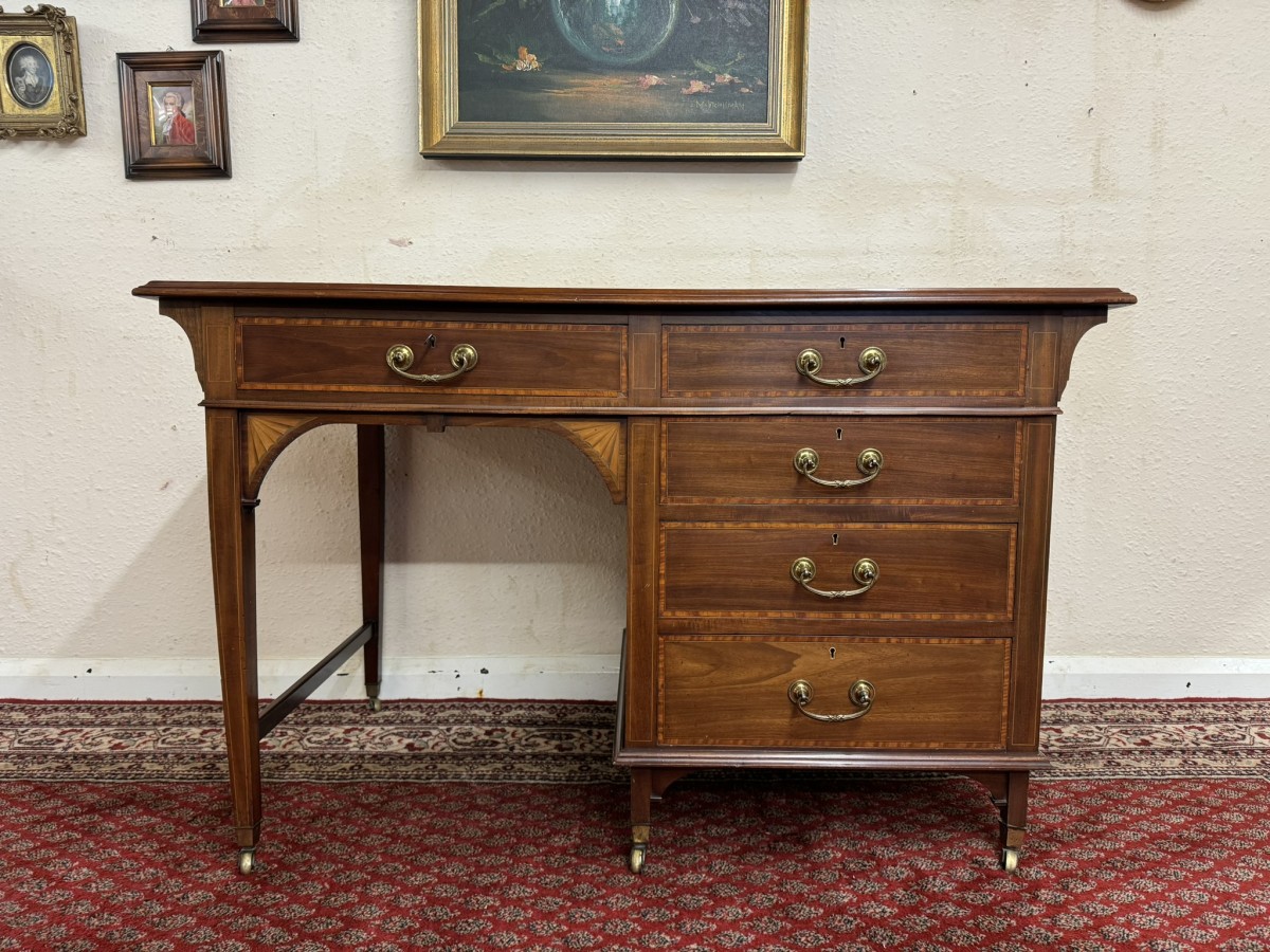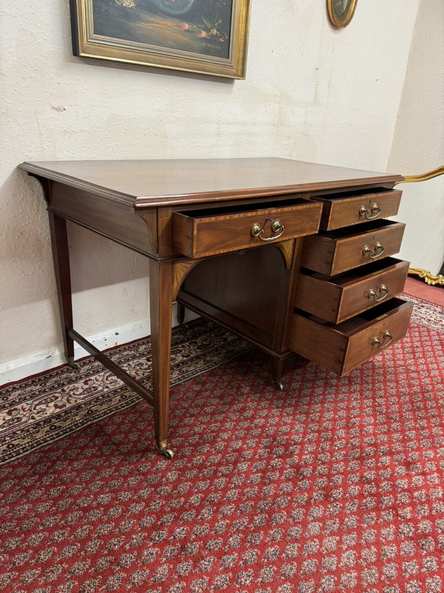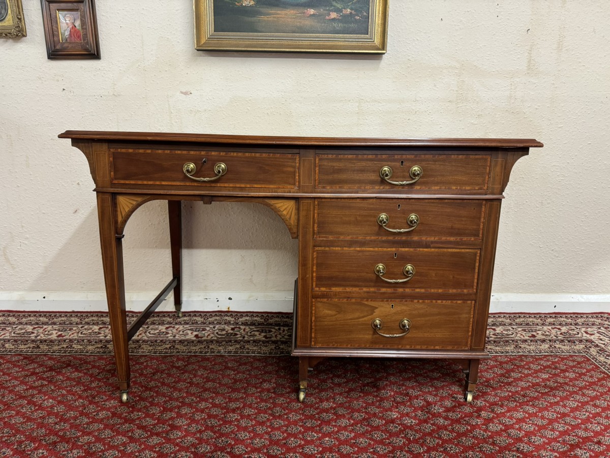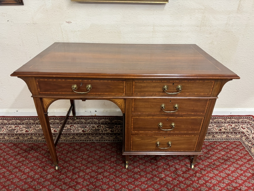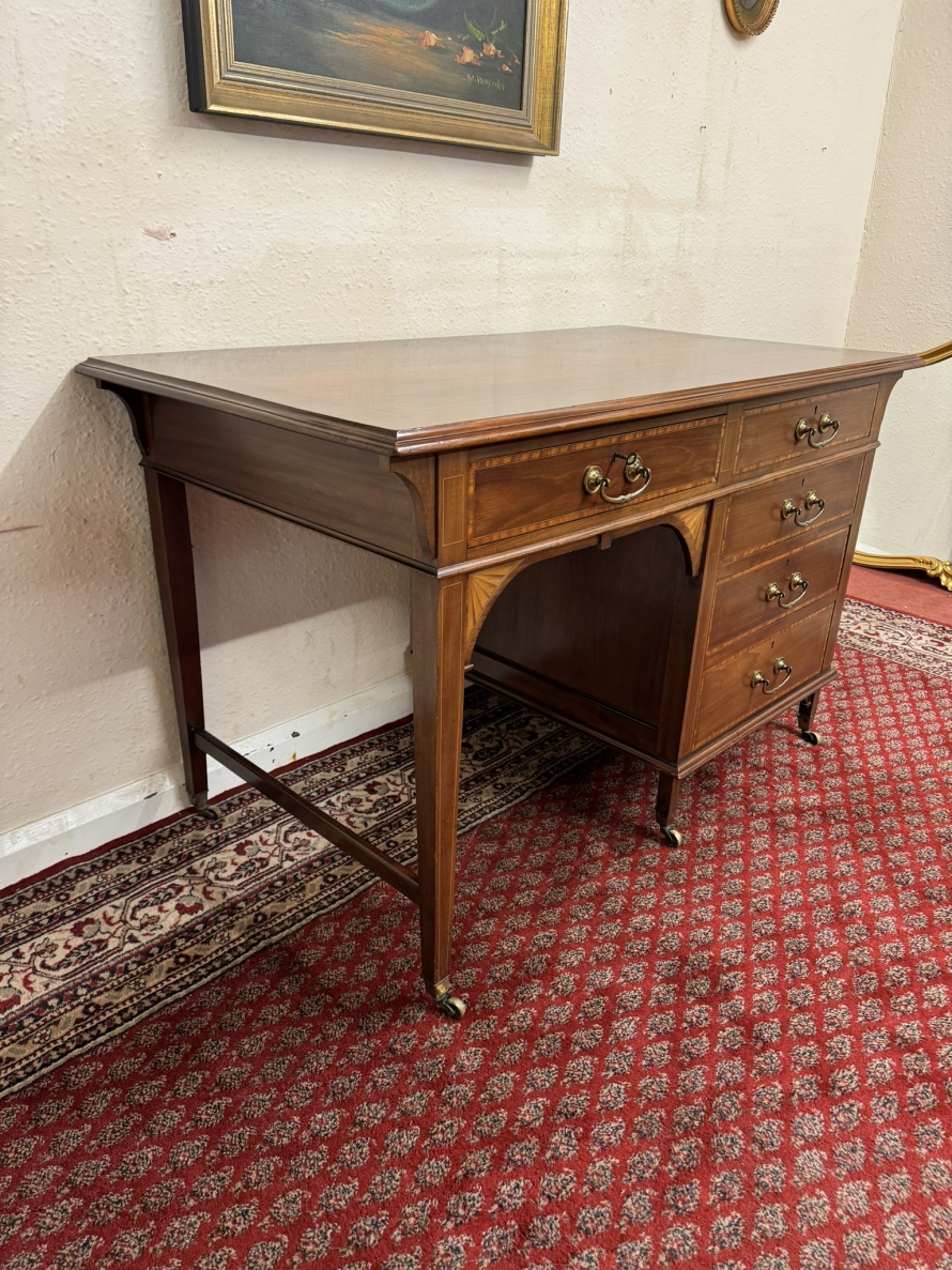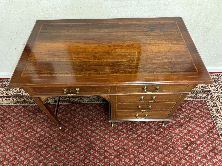 Made during the Edwardian period in fabulous quality mahogany. The oversailing top having inlaid decoration, below is an inlaid lockable drawer, the drawer having a brass handle. The drawer sits above a knee hole, to the right are four inlaid drawers, each drawer having a brass drop handle. Recessed panelled sides and sitting on six tapered legs on original brass casters.