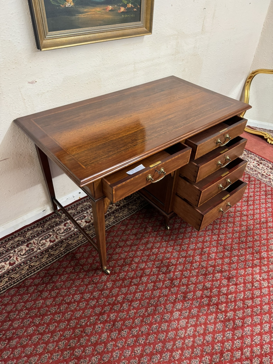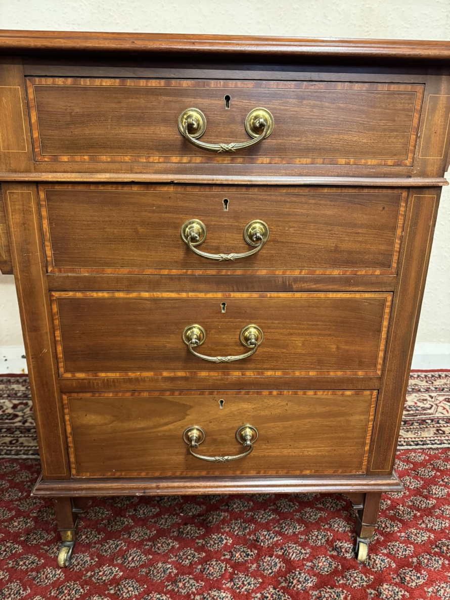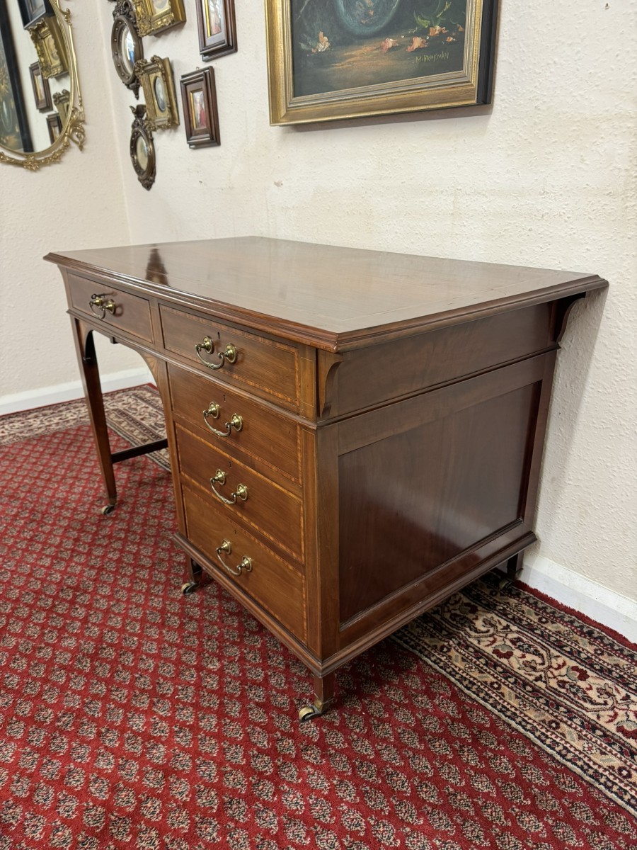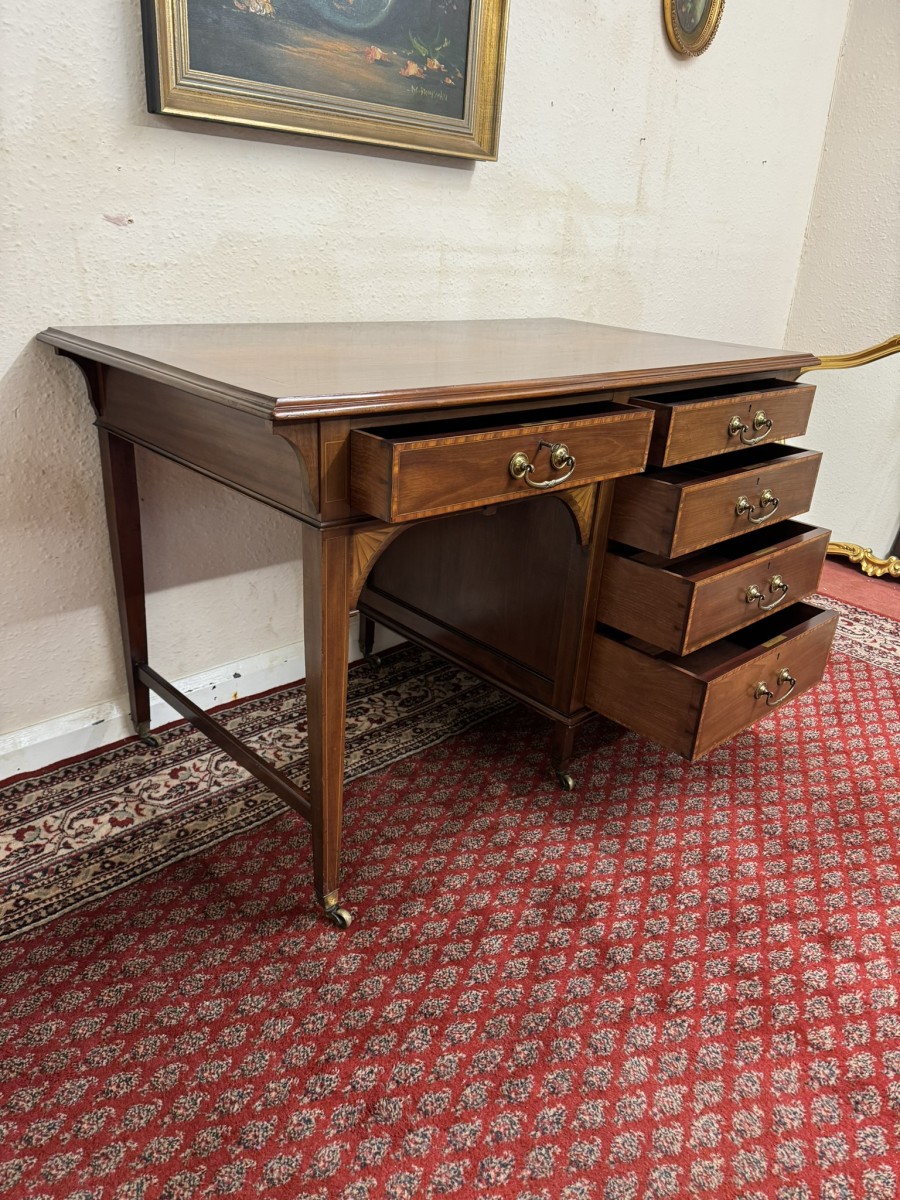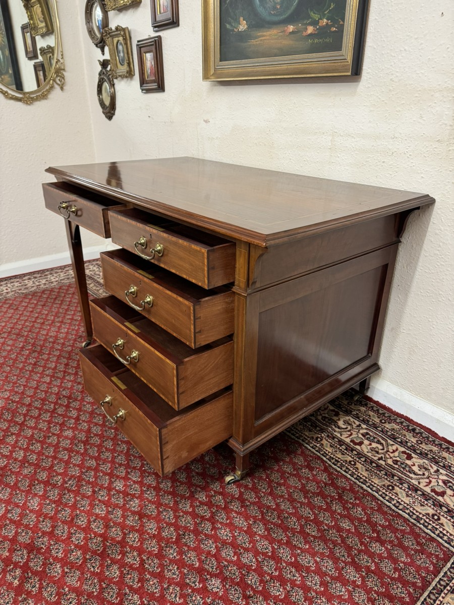 Made during the Edwardian period in fabulous quality mahogany. The oversailing top having inlaid decoration, below is an inlaid lockable drawer, the drawer having a brass handle. The drawer sits above a knee hole, to the right are four inlaid drawers, each drawer having a brass drop handle. Recessed panelled sides and sitting on six tapered legs on original brass casters.