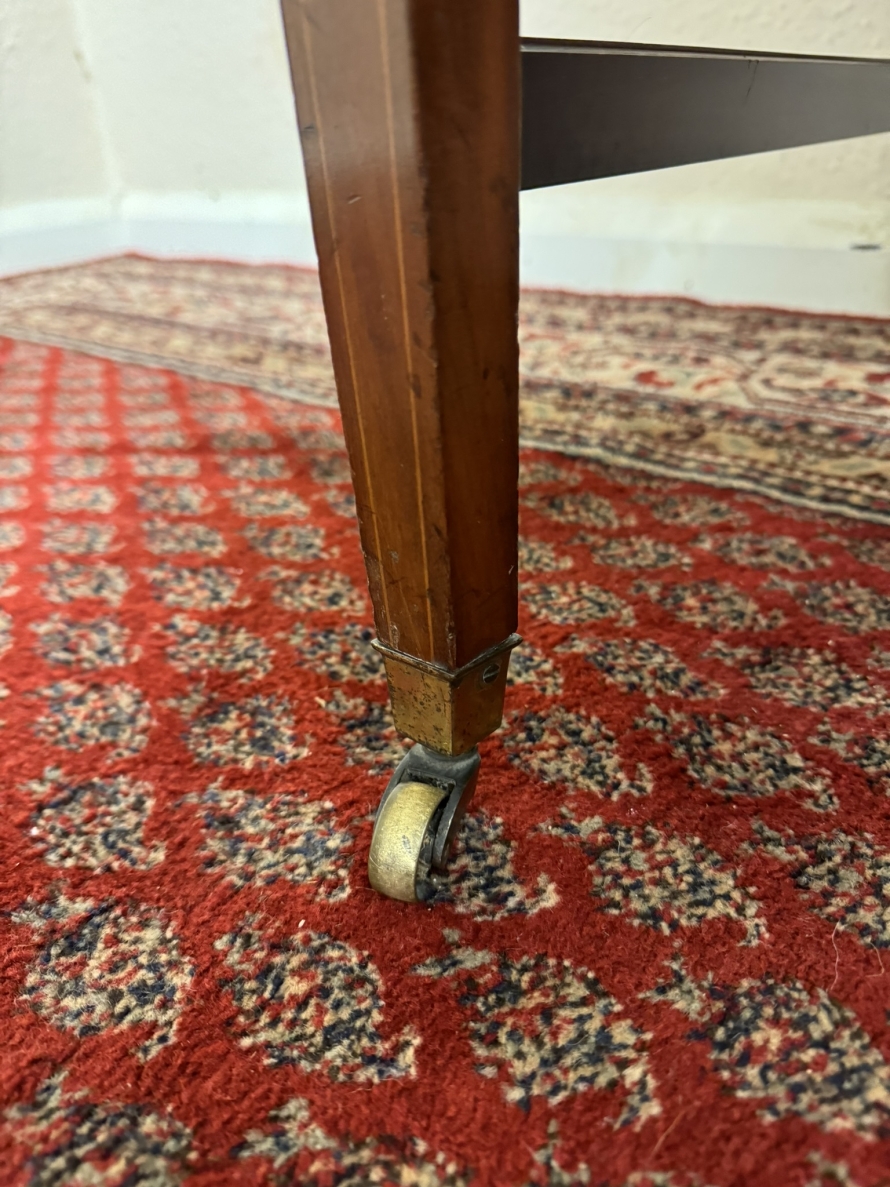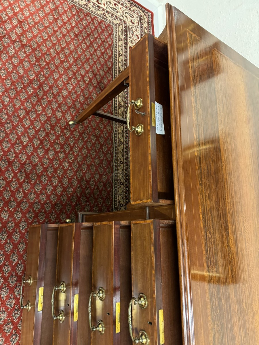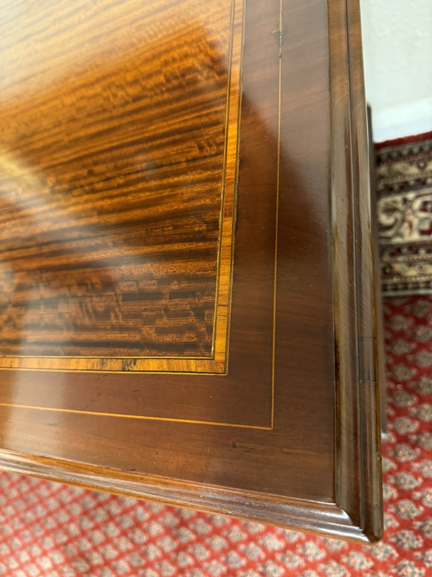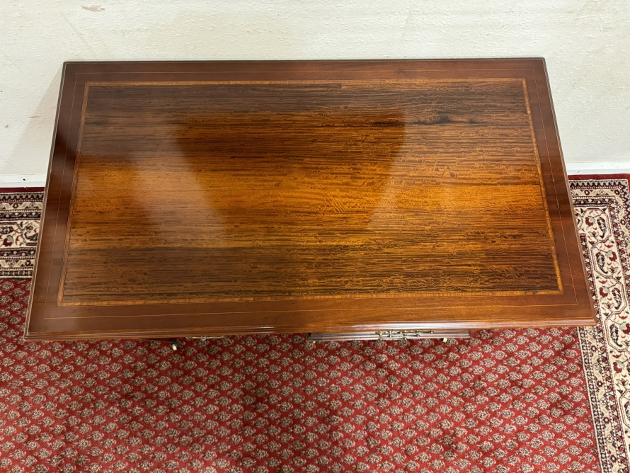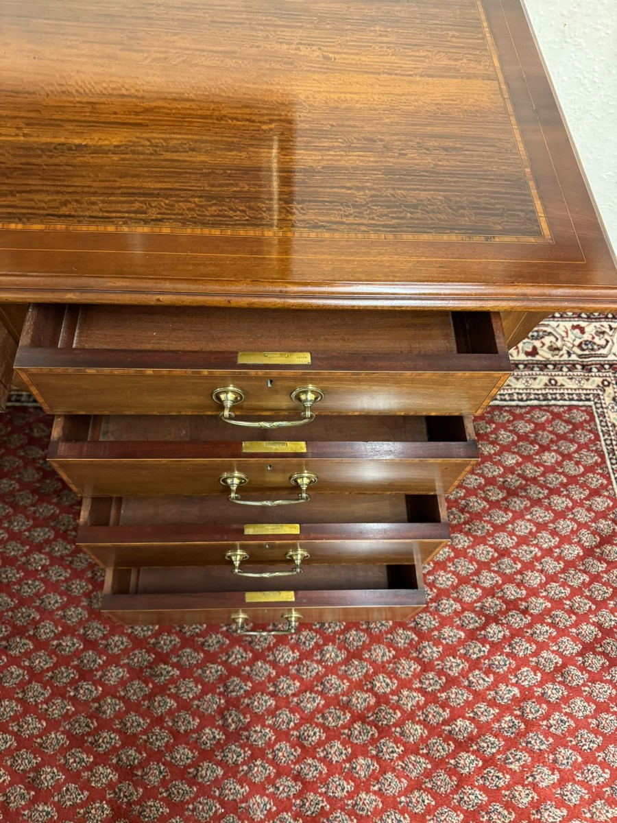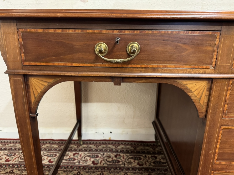 Made during the Edwardian period in fabulous quality mahogany. The oversailing top having inlaid decoration, below is an inlaid lockable drawer, the drawer having a brass handle. The drawer sits above a knee hole, to the right are four inlaid drawers, each drawer having a brass drop handle. Recessed panelled sides and sitting on six tapered legs on original brass casters.