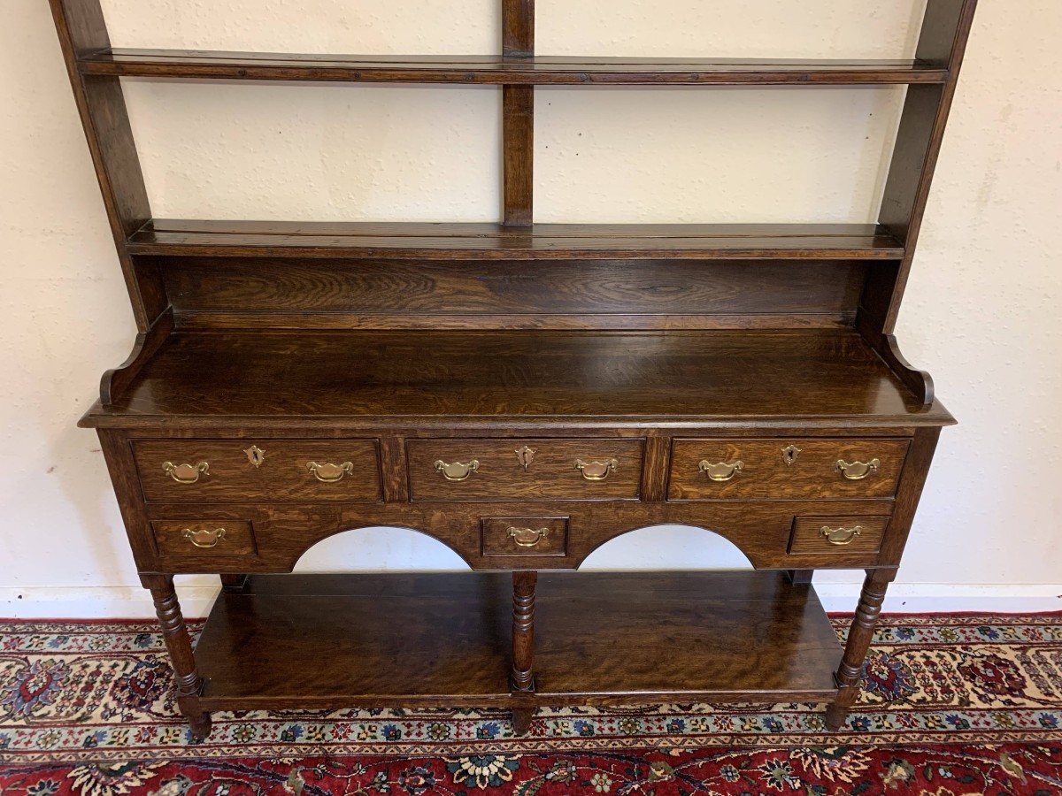 The dresser is made in glorious oak and dates circa 1900. The detachable plate rack back has three shelves. The base has three lockable drawers, each drawer having a pair of brass handles and brass escutcheon. Below are two small drawers, each with brass handle and a central dummy drawer. Arched decoration to the front, three turned legs to the front and under shelf.